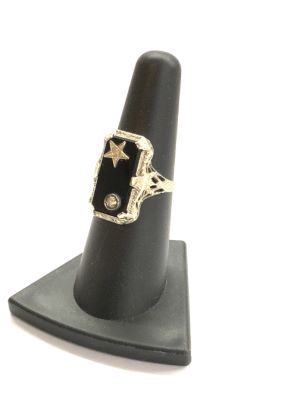 14k w.g. filigree onyx and diamond ring. Size 8 Dimensions: 3.64 grams