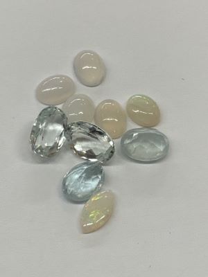 A compiled estate grouping of gemstones including two oval and marquise shaped opals, a pair of oval opals and four oval aquarmarine stones. Ten stones total.