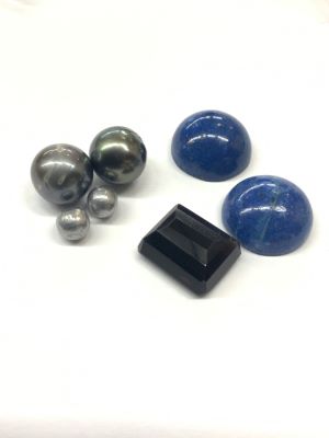 A compiled grouping of loose estate gemstones including Lapis Cabochon stones, Smokey topaz (Emerald cut) and pearls. As see in photograph preview.