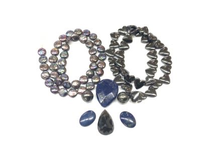 A compiled grouping of loose and strung gemstones. A strand of heart shape hematite, strand dye pearls disc shape, pear shape smoky topaz and pear shape lapis etc.