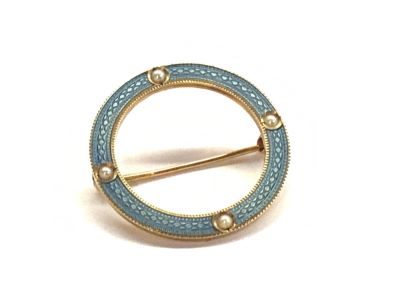 14k yellow gold blue enameled circular pin with seed pearls. Dimensions: 3/4" diameter Total weight: 1.70 grams