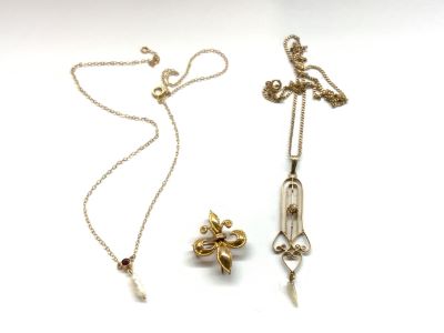 Two necklaces. 10k diamond and pearl and 14k garnet and pearl yellow gold and 14k fleur di lis pendant. Total weight: 5.65 grams