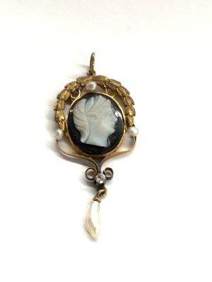 14k Gold Cameo drop pendant. Dimensions: 1 1/2" X 3/4" Total weight: 2.64 grams