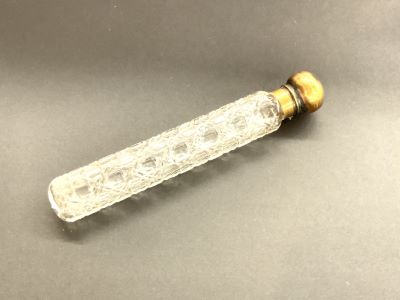 A long glass perfume bottle in a flask style. Button and star pattern. Dimensions: 8 1/2" X1 1/2"