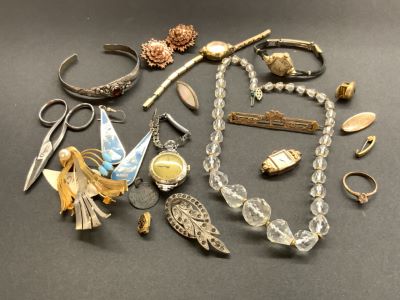Compiled estate grouping of miscellaneous items including Tartinware Scottish ring box, 14k gold top cufflinks, diamond flower ring, 900 silver amethyst bug stick pin etc.