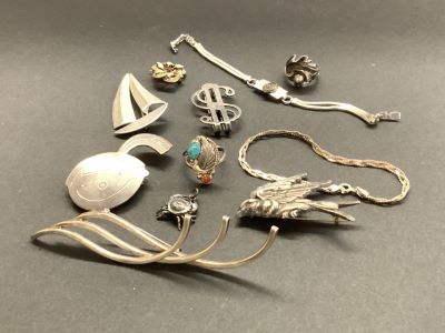 Estate sterling silver jewelry group. Ray Jack modernist design pin, Navaho ring, pins, bracelets etc. As seen in photograph preview.