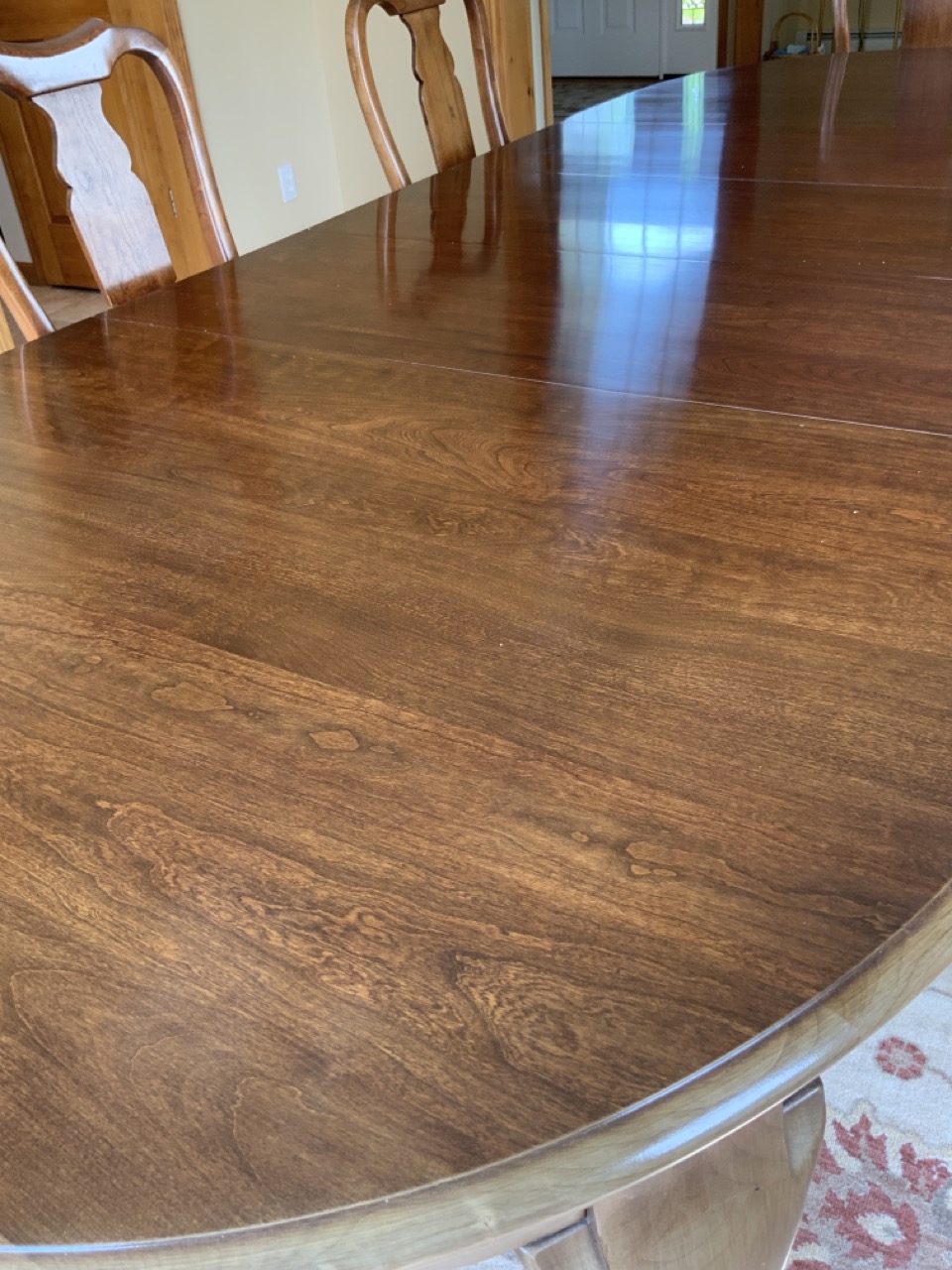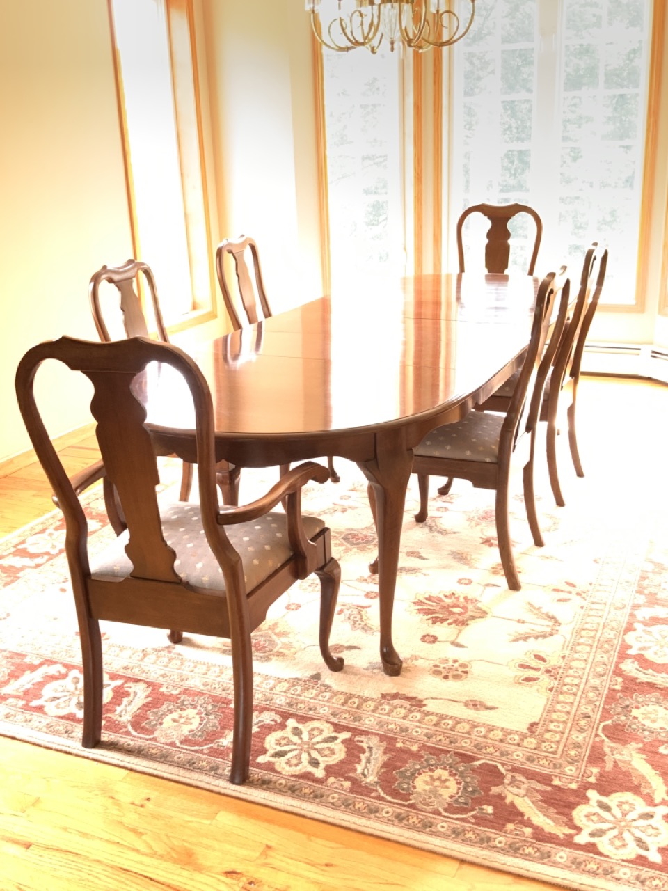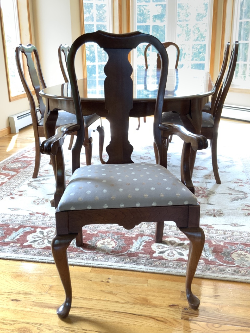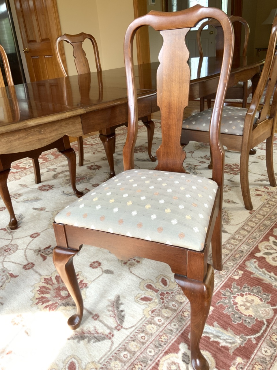 Cherry hardwood dining room table with with three 14" leaves and six chairs, four side and two arm with Queen Anne style legs.