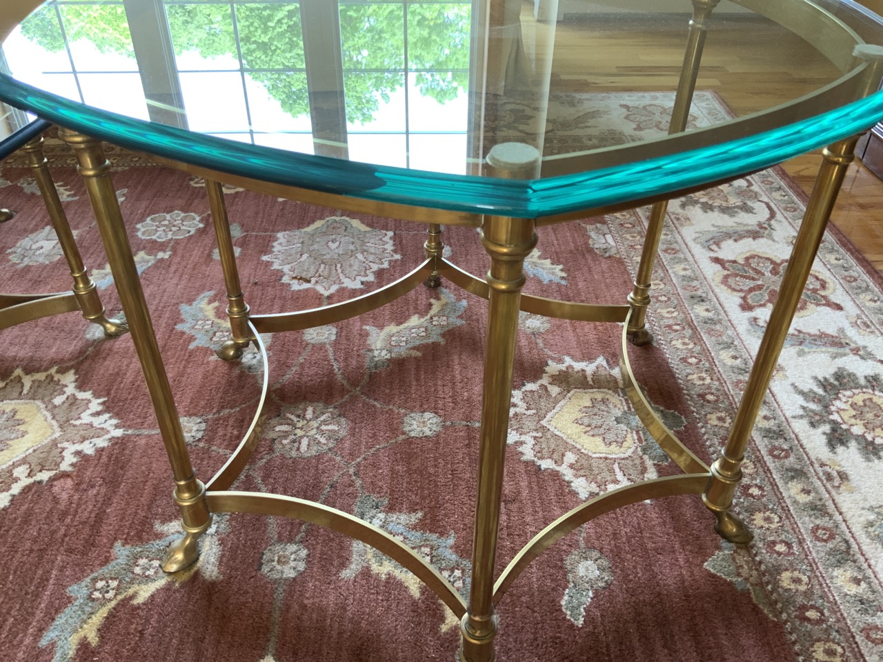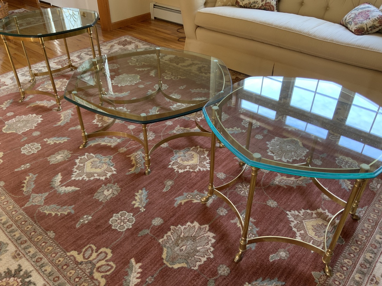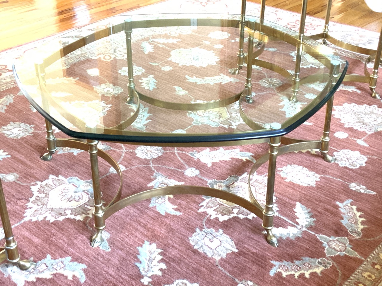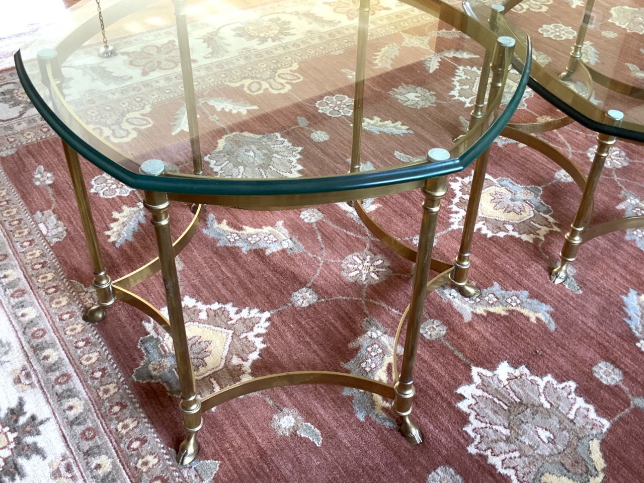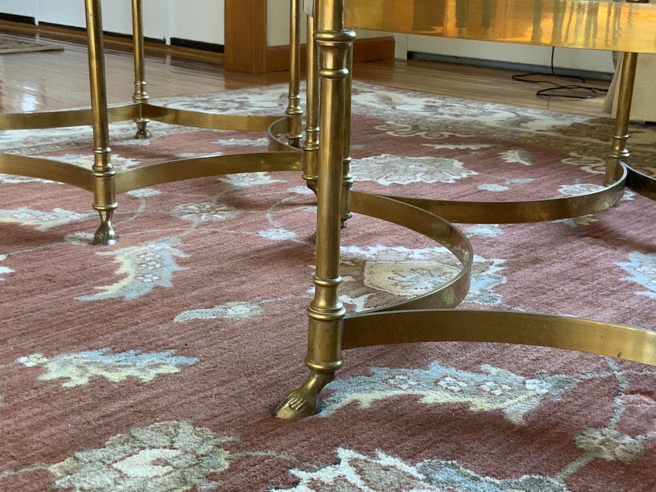Vintage Hollywood Regency design solid brass coffee table with two end/side tables with hoof feet. Made by Labarge, mid 20th century.