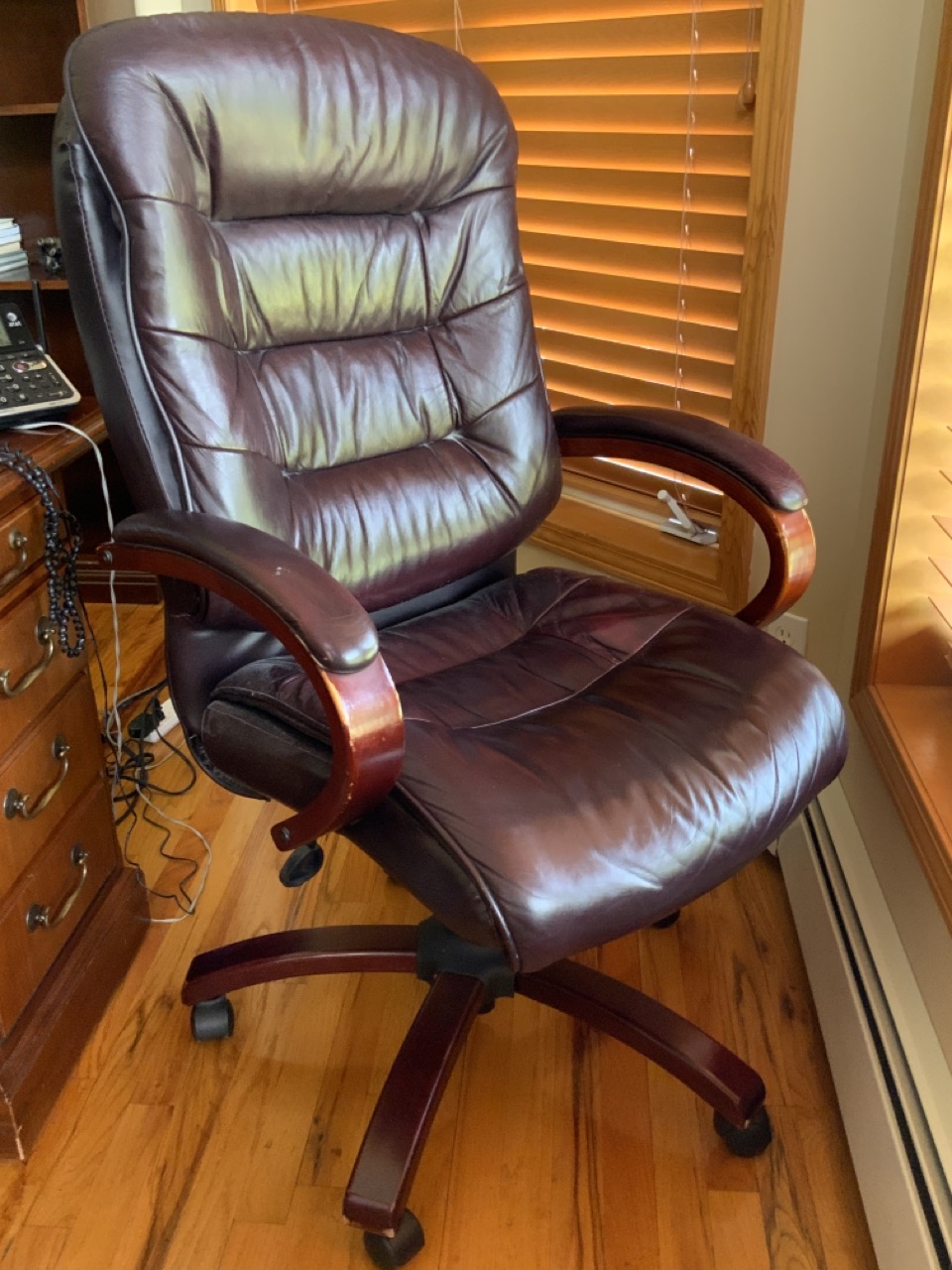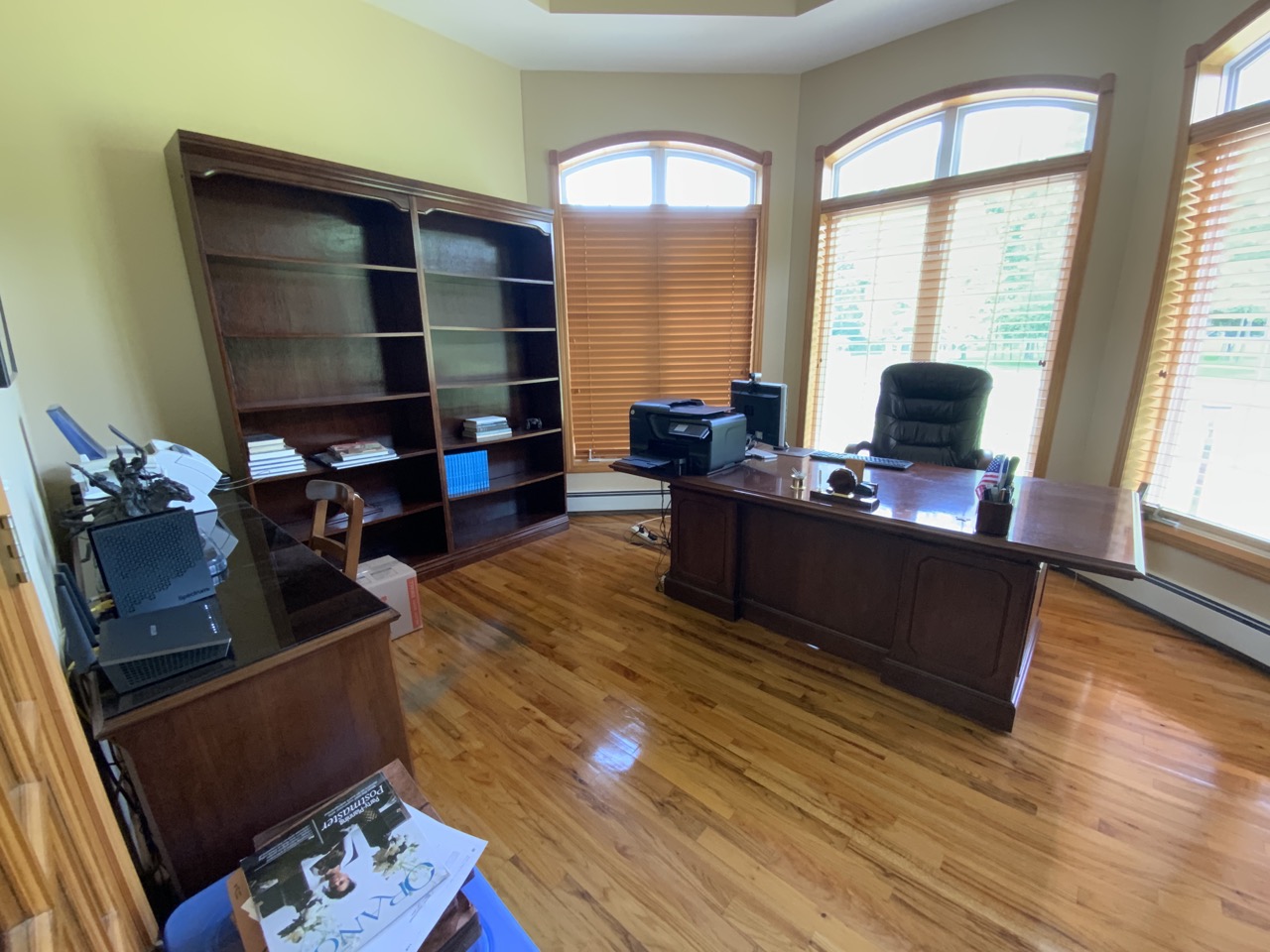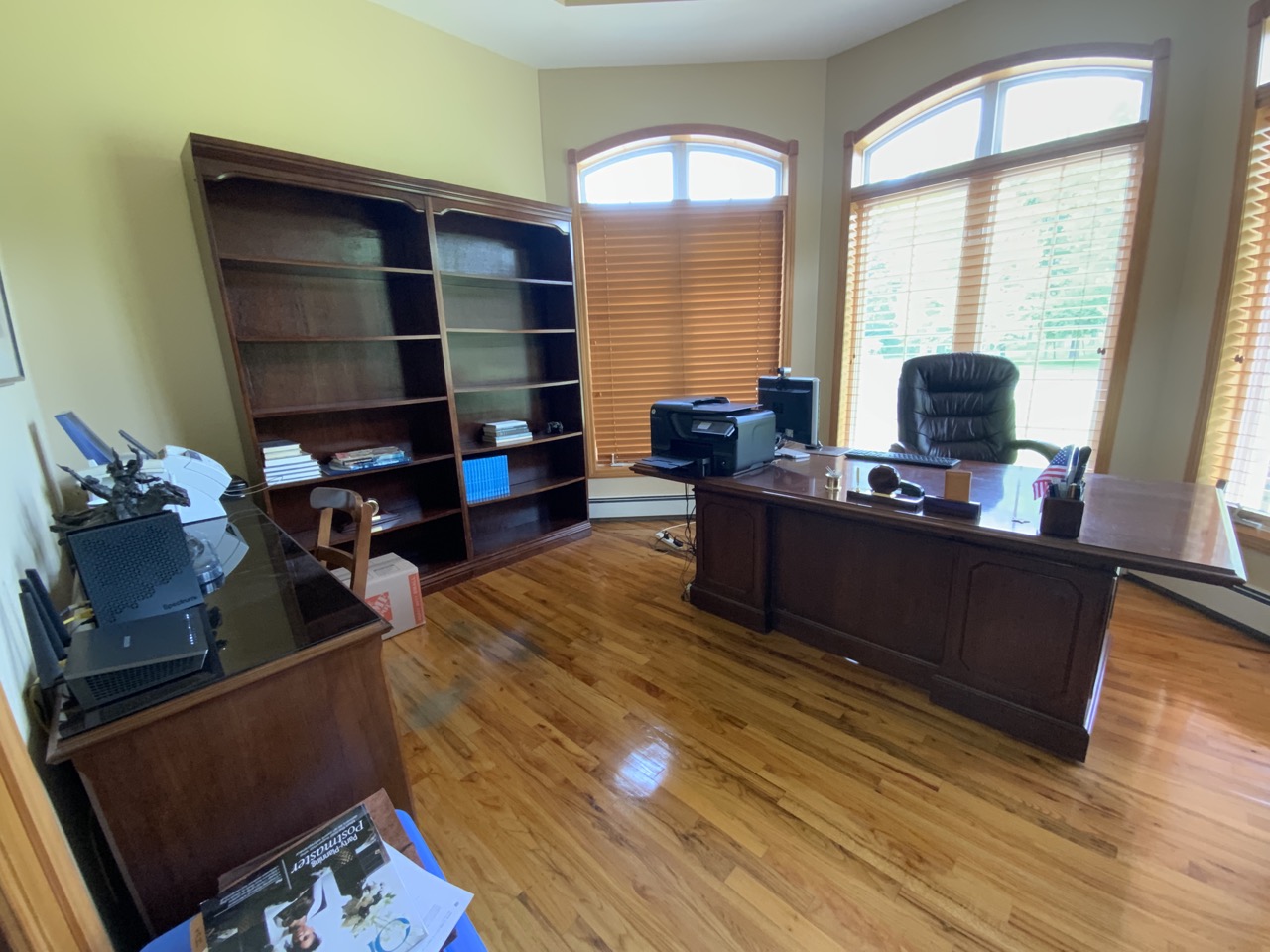 Everything you need to design your home office. Includes desk, five (5) bookcases, utility work station with file cabinets, and pigeon blood red upholstered office chair.