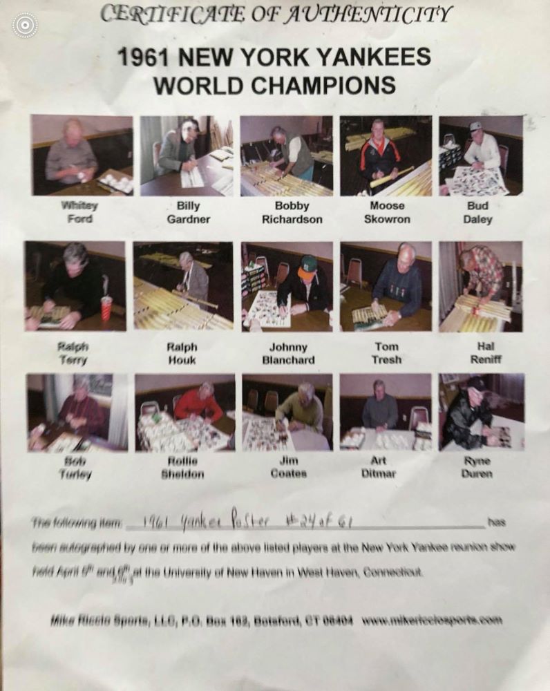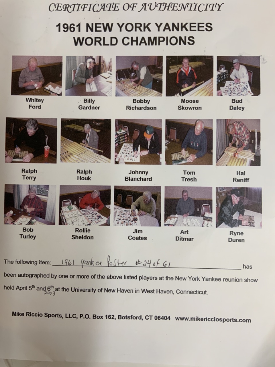 Autographed by all 1961 New York Yankees. Certificate of Authenticity Included. Many signature experienced sun fade and our worn. Please see photograph preview.