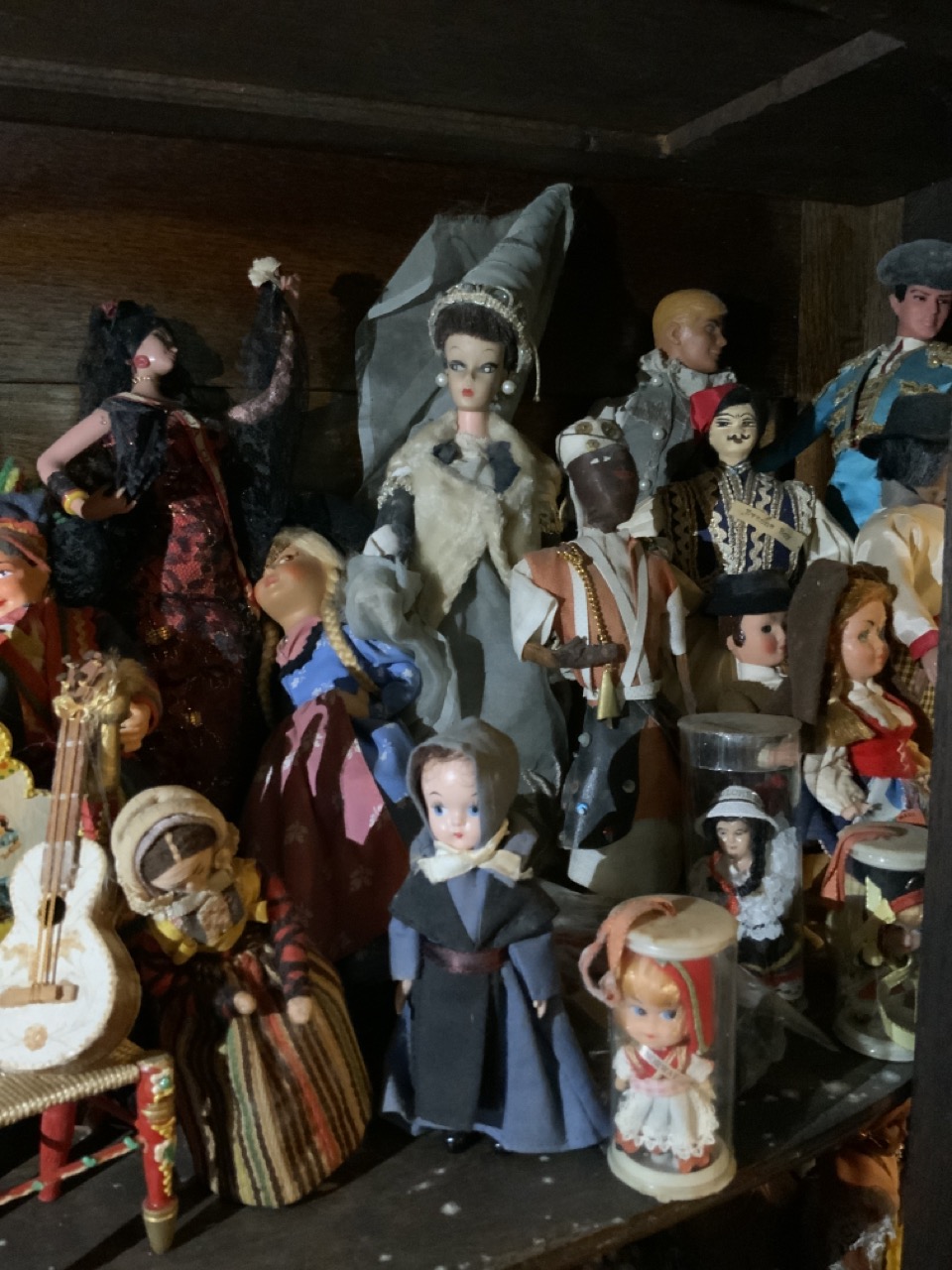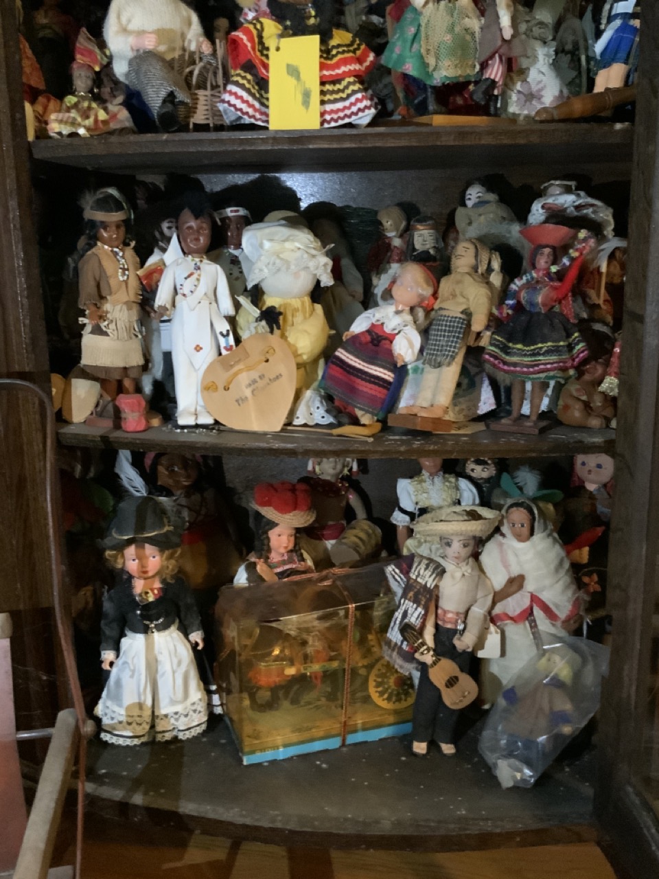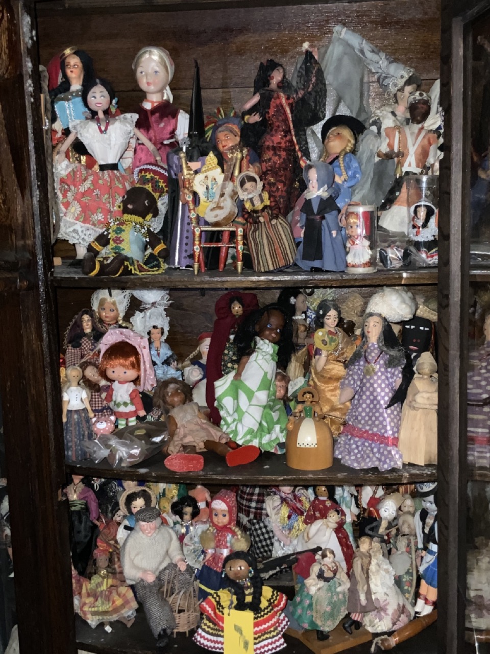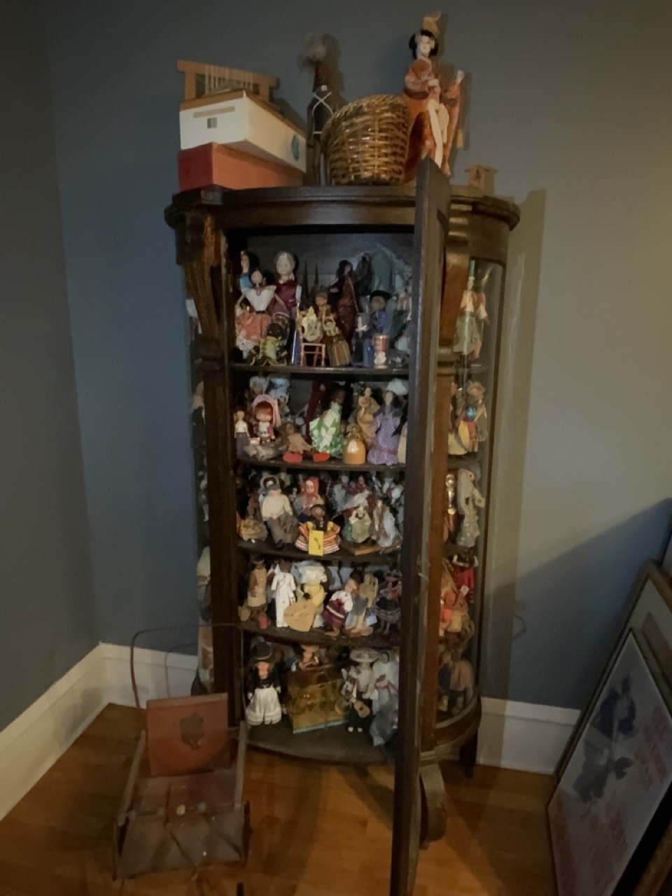 Curved glass china closet with doll collection. All goes. One crack in glass of cabinet.