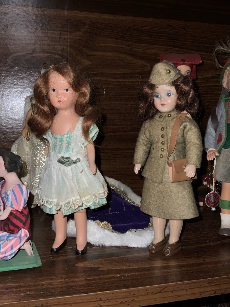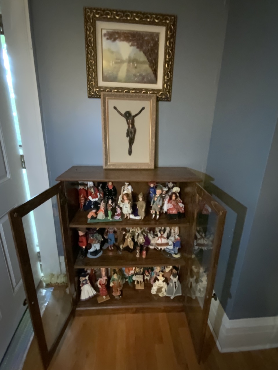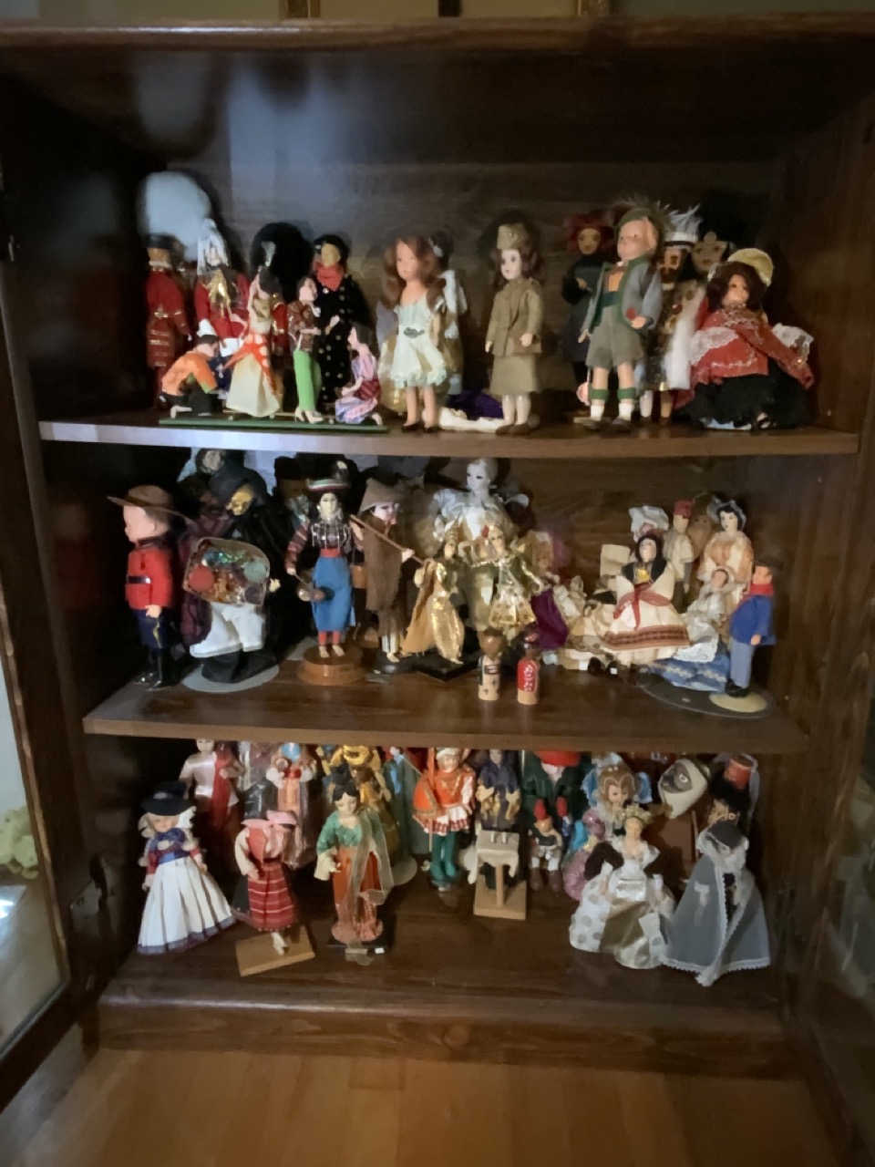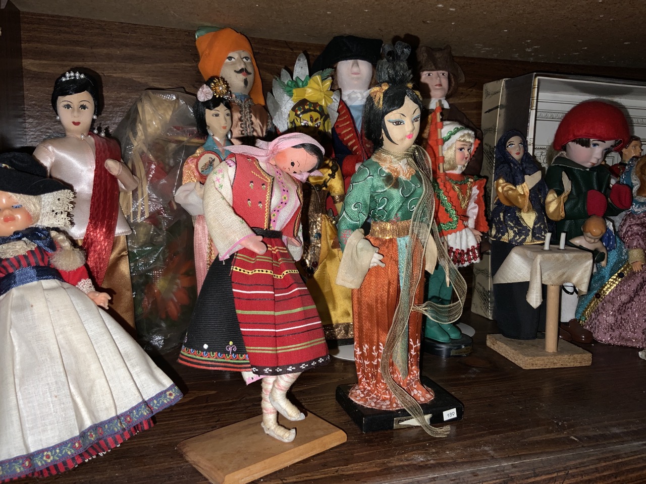 A two door bookcase, artwork and cabinet contents including all dolls. Nancy Ann, International Etc.