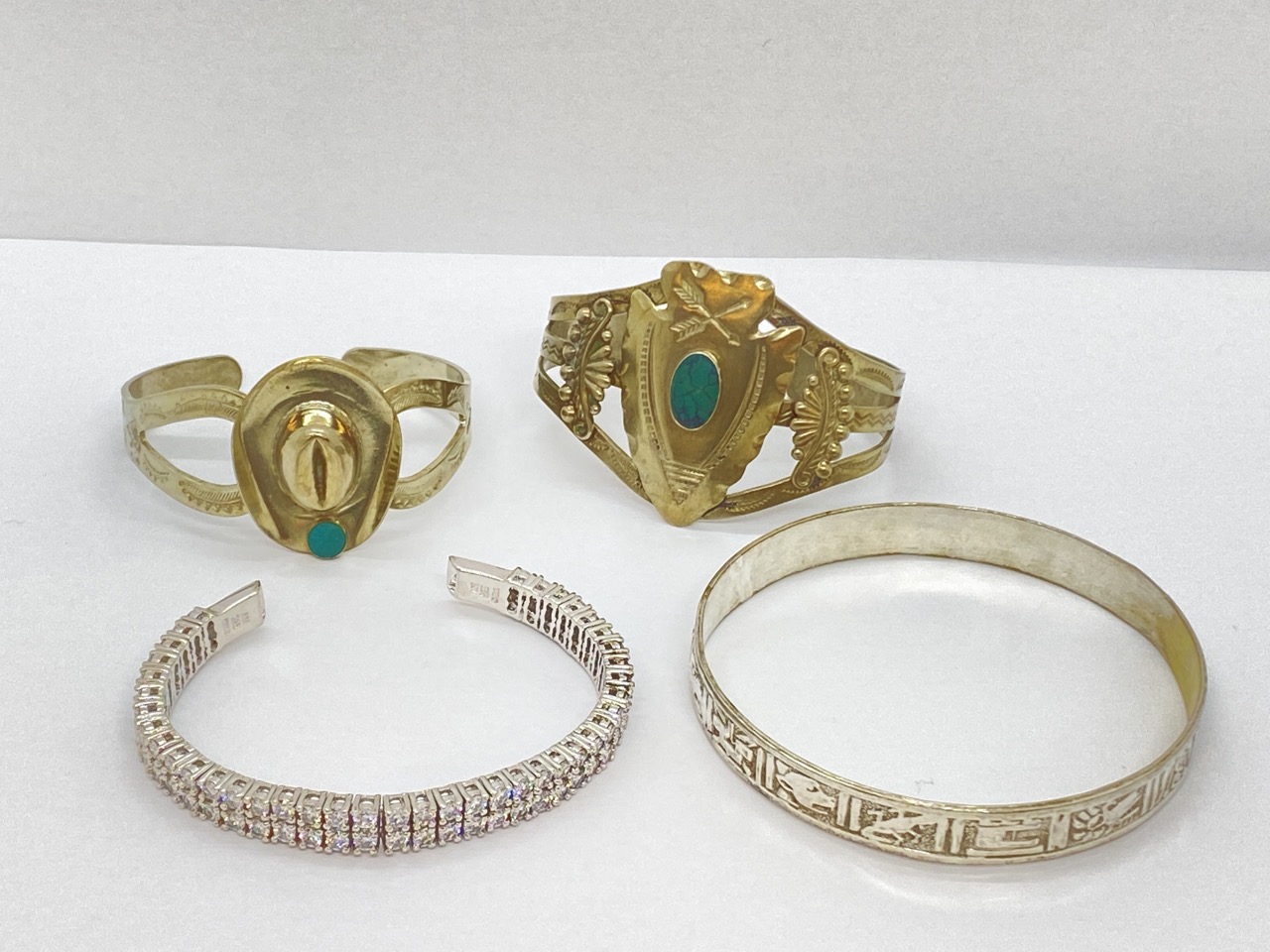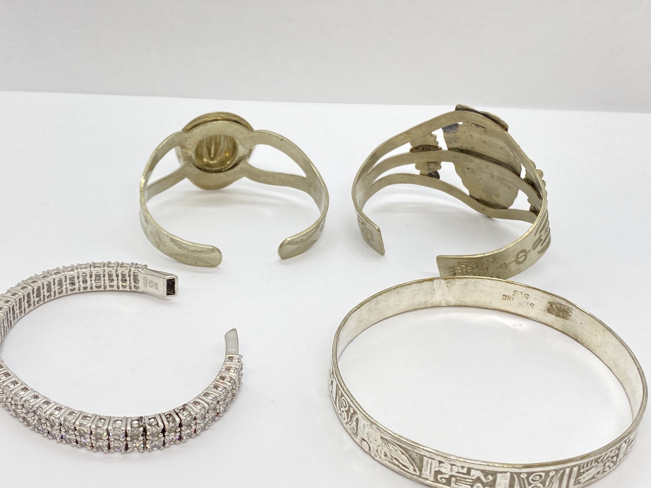 A compiled grouping of silver bracelets. Native cuff and bangles etc.