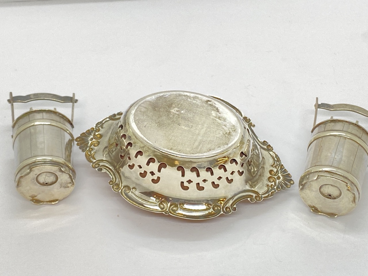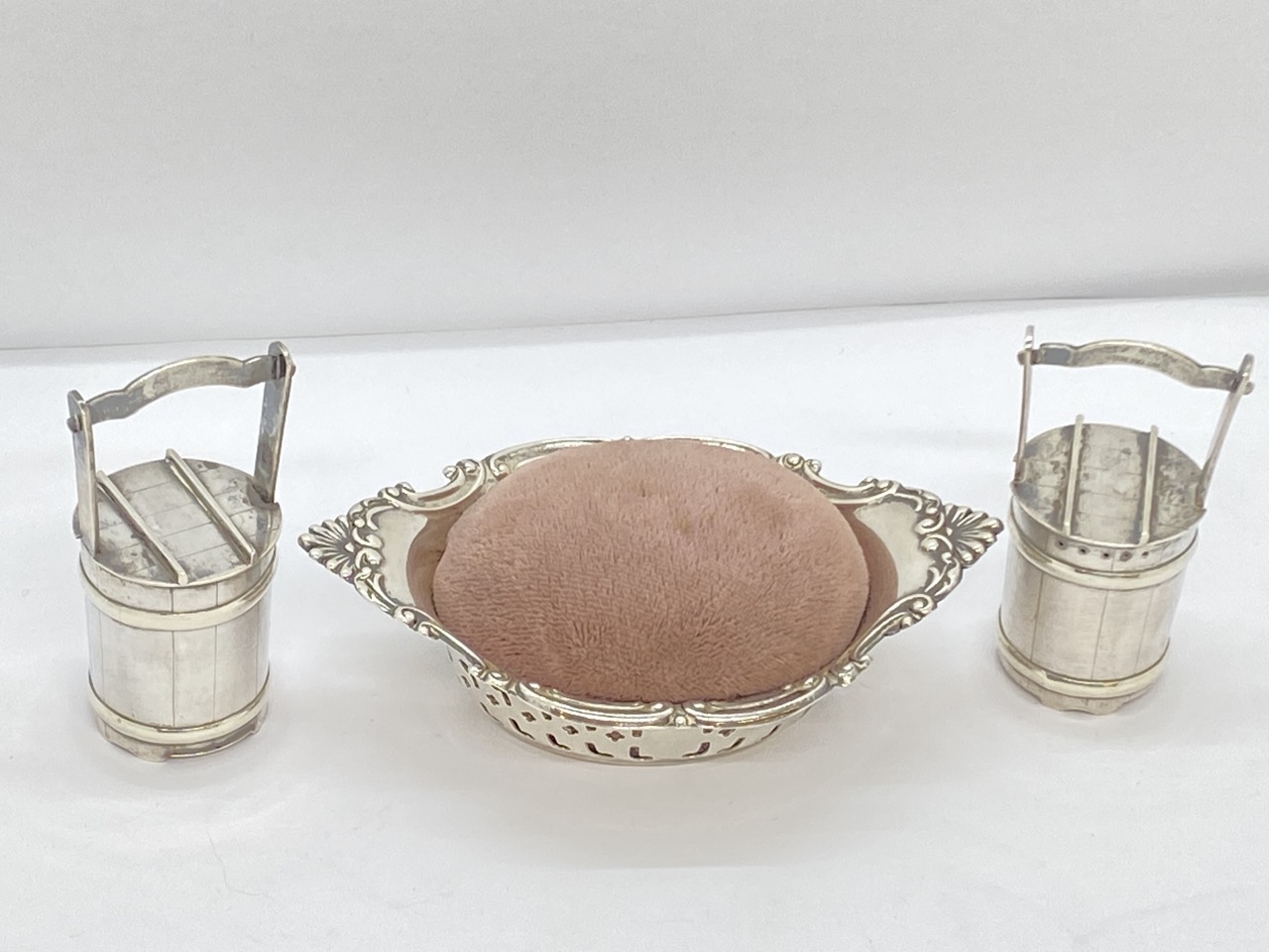 Estate sterling silver bucket form salt and pepper and pin cushion.
