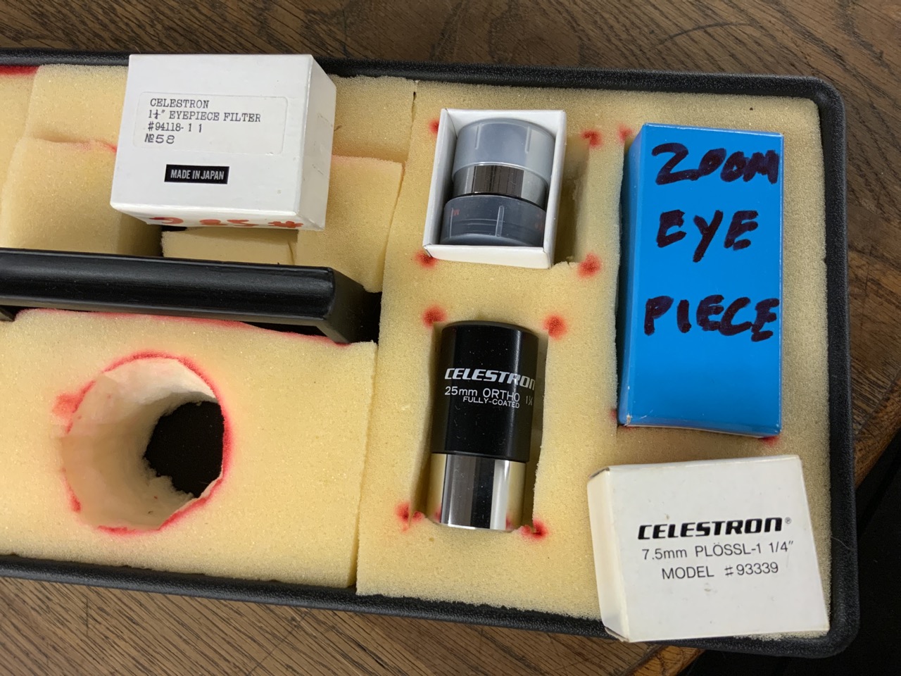 Including three eyepieces Zoom eye piece with diagonal adapter, Ortho 25mm, 7.5mm Plossil, #58L Eye filter, Remote control camera trigger, Model X700 Minolta SLR camera body, manual advanced Astromaster zoom function adapter and Deluxe Telextender.