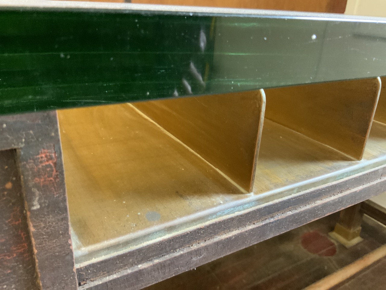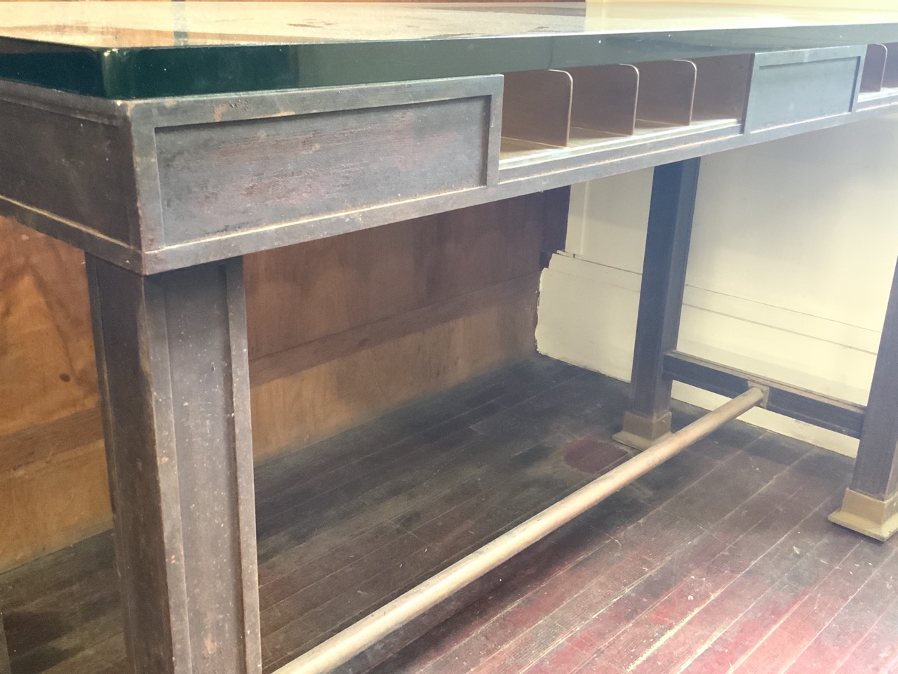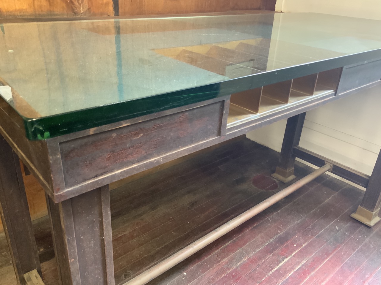 An Art Deco bank lobby table. Bronze base with 1" thick glass top with paper deposit withdrawel slip slots.