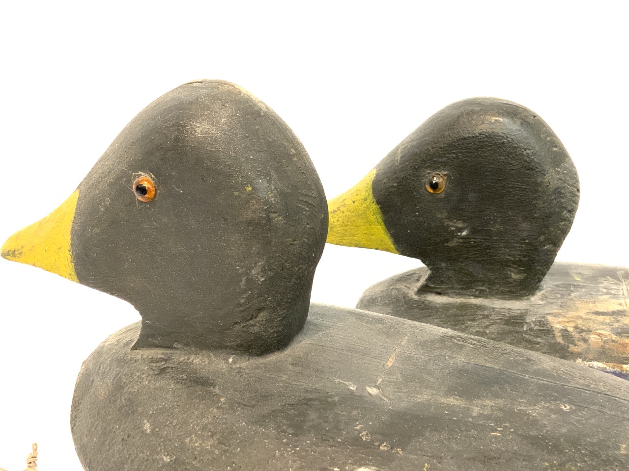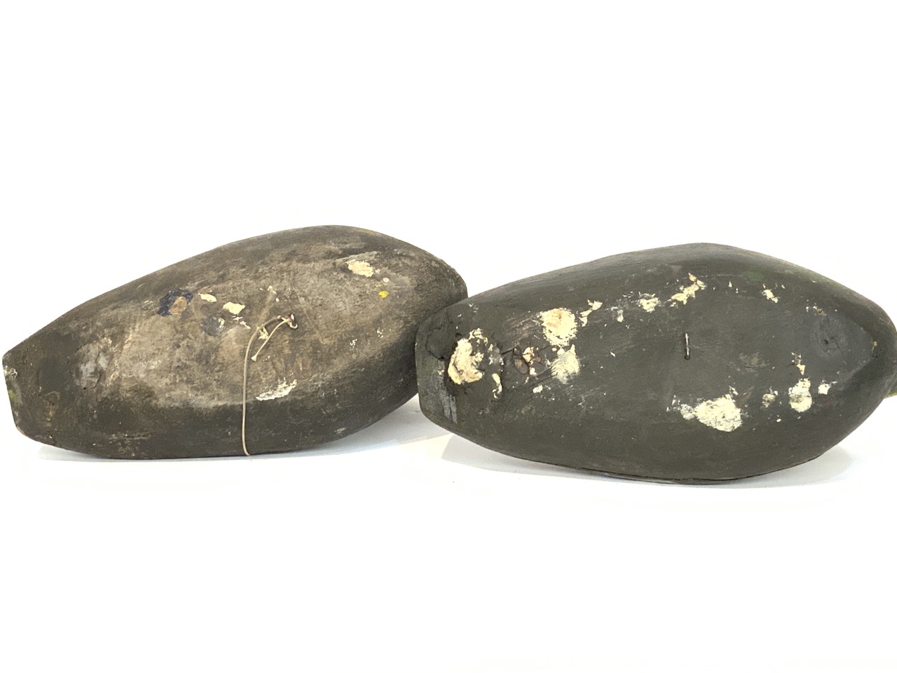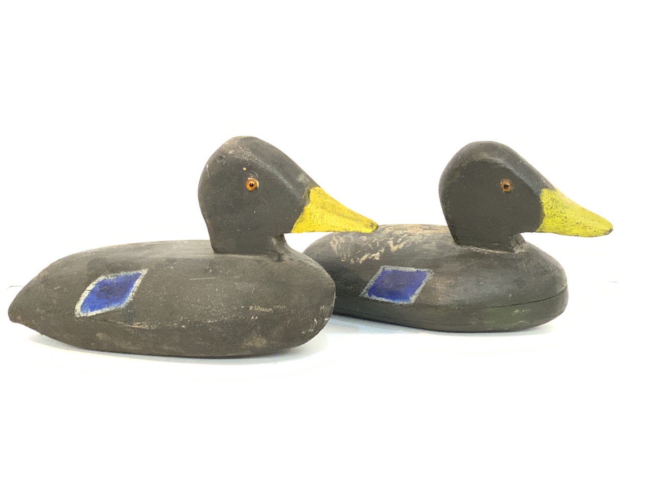 A pair of wooden folk art working duck decoys.