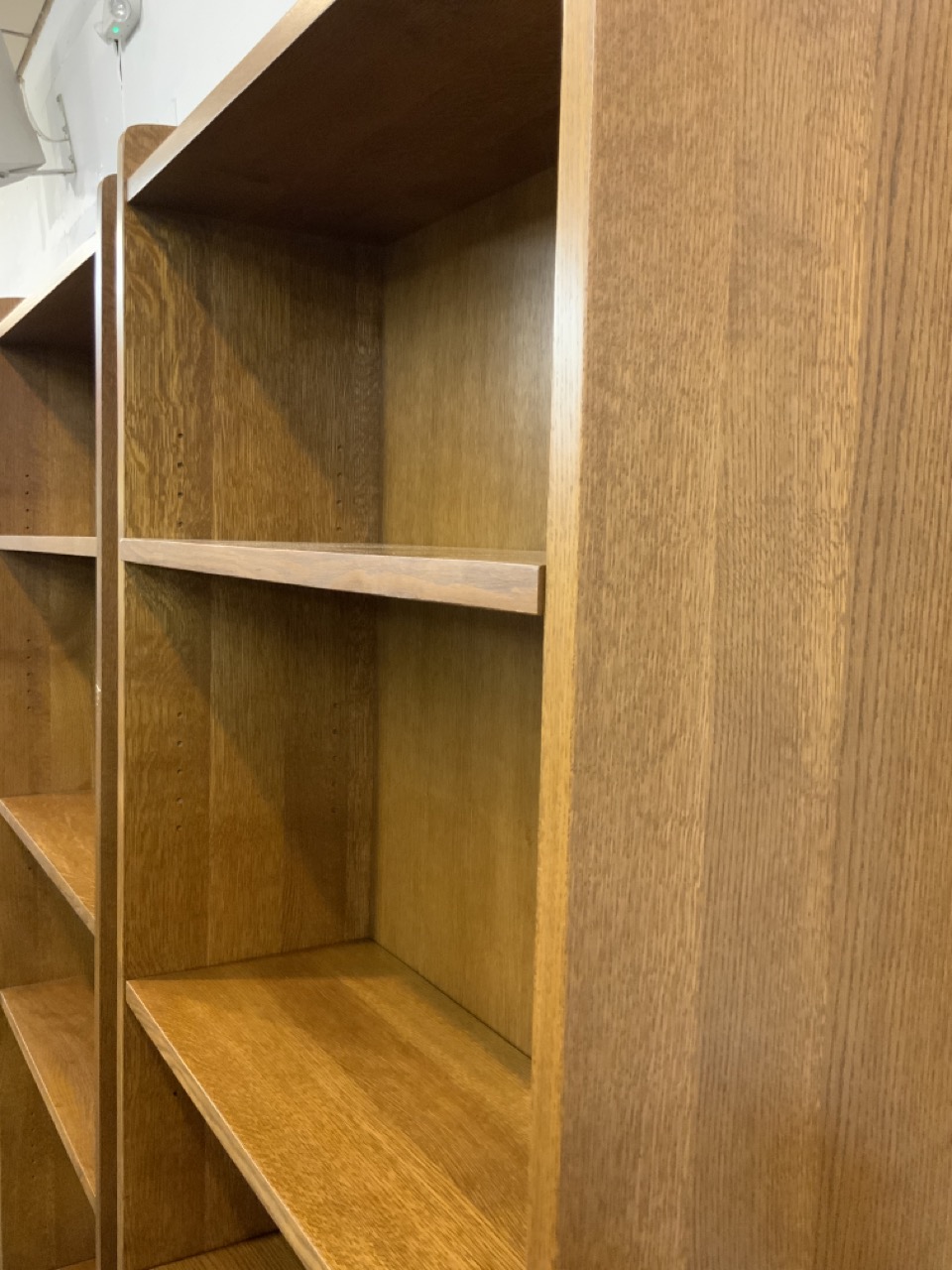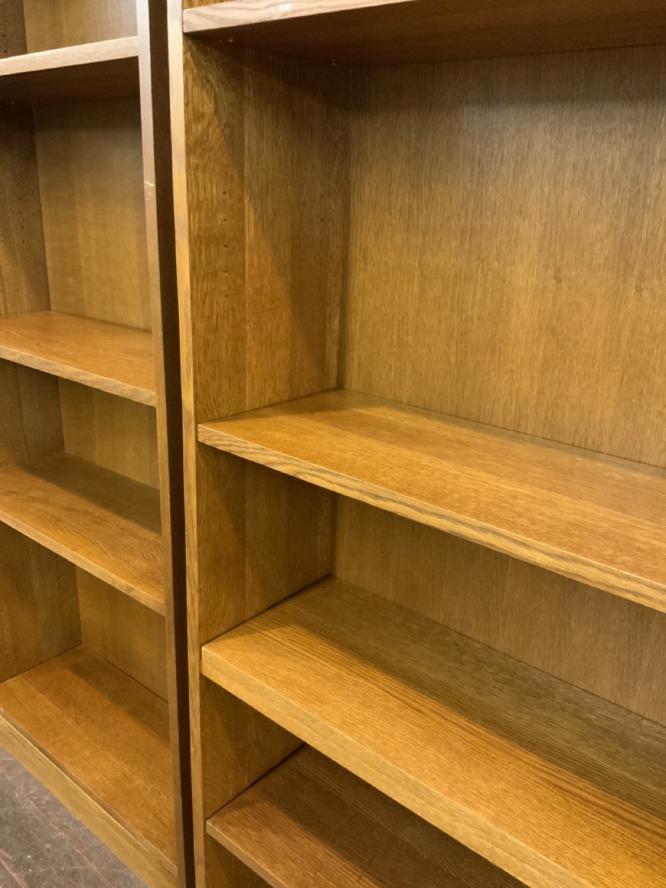 A Pair of Stickley Tall Oak Bookcases. Each having one permanent shelf and four adjustable shelves. some metal pegs for shelving missing.