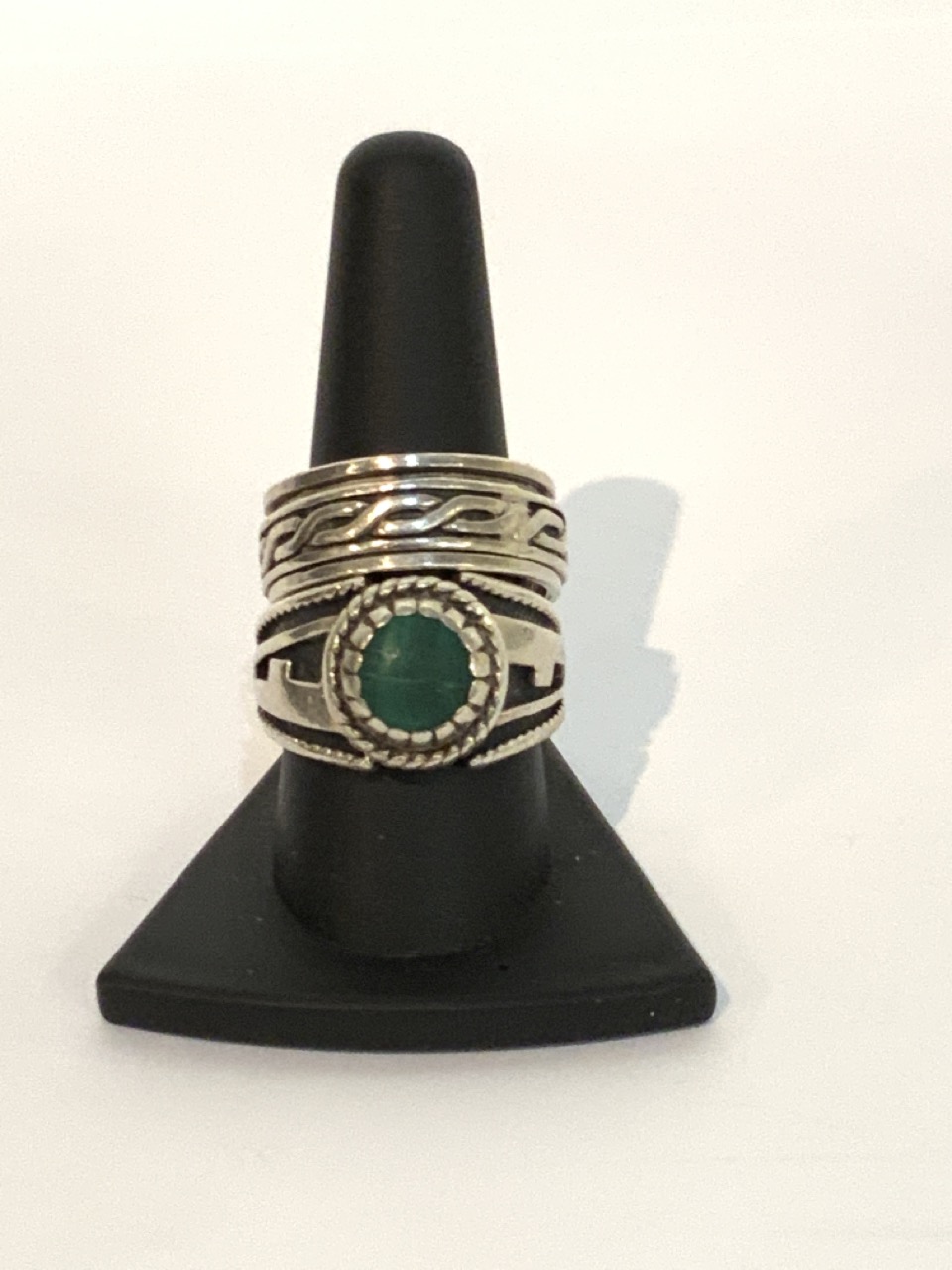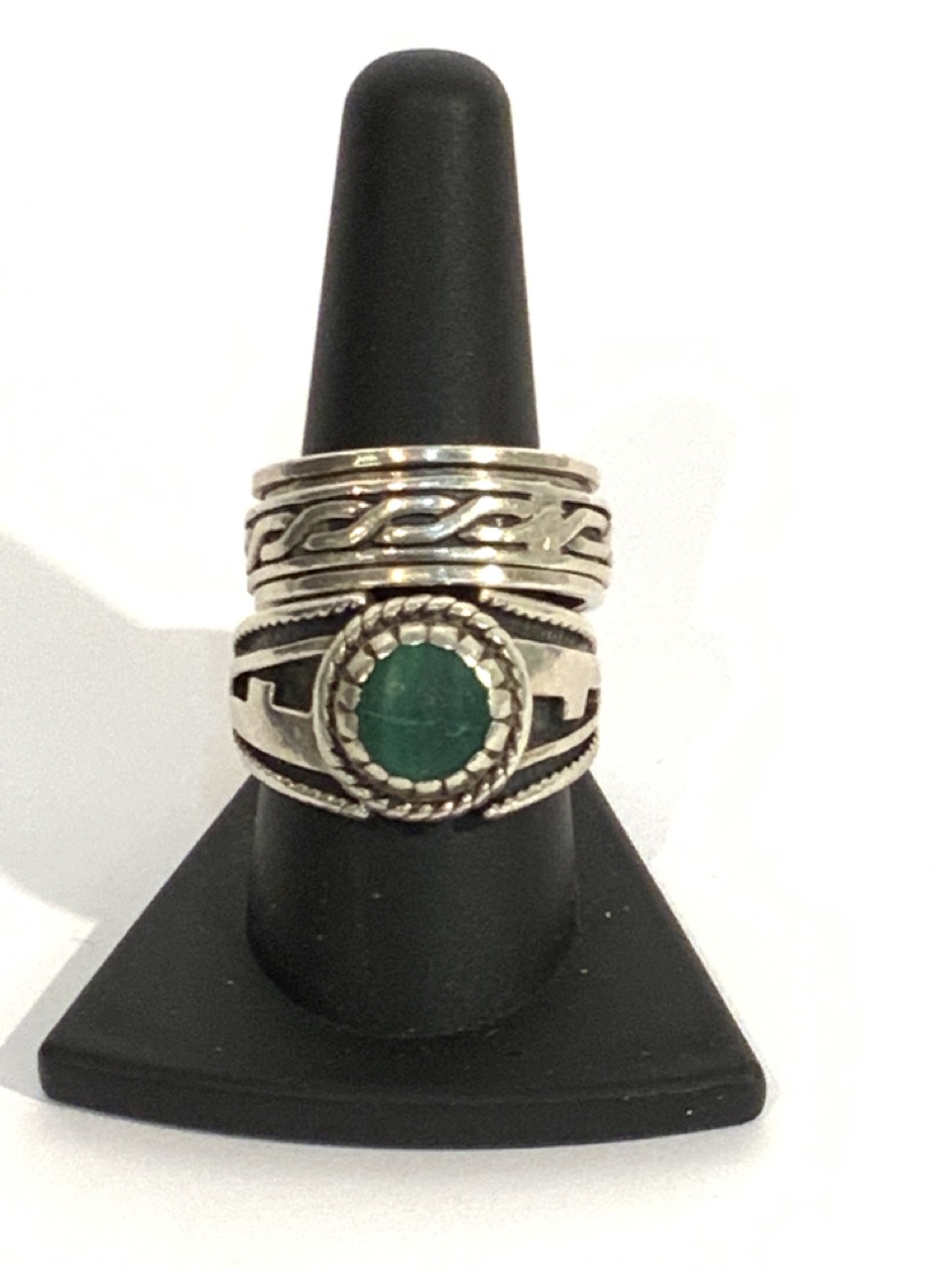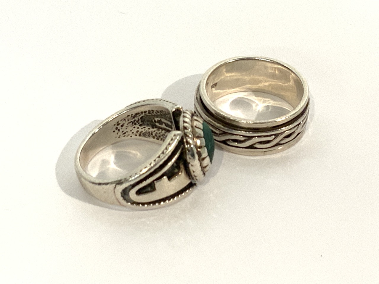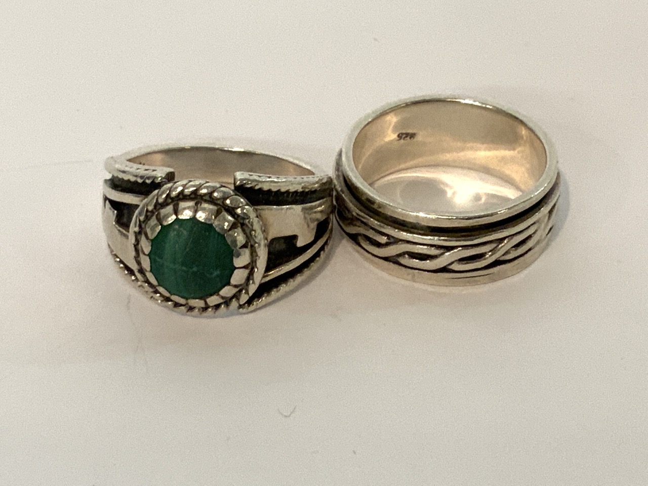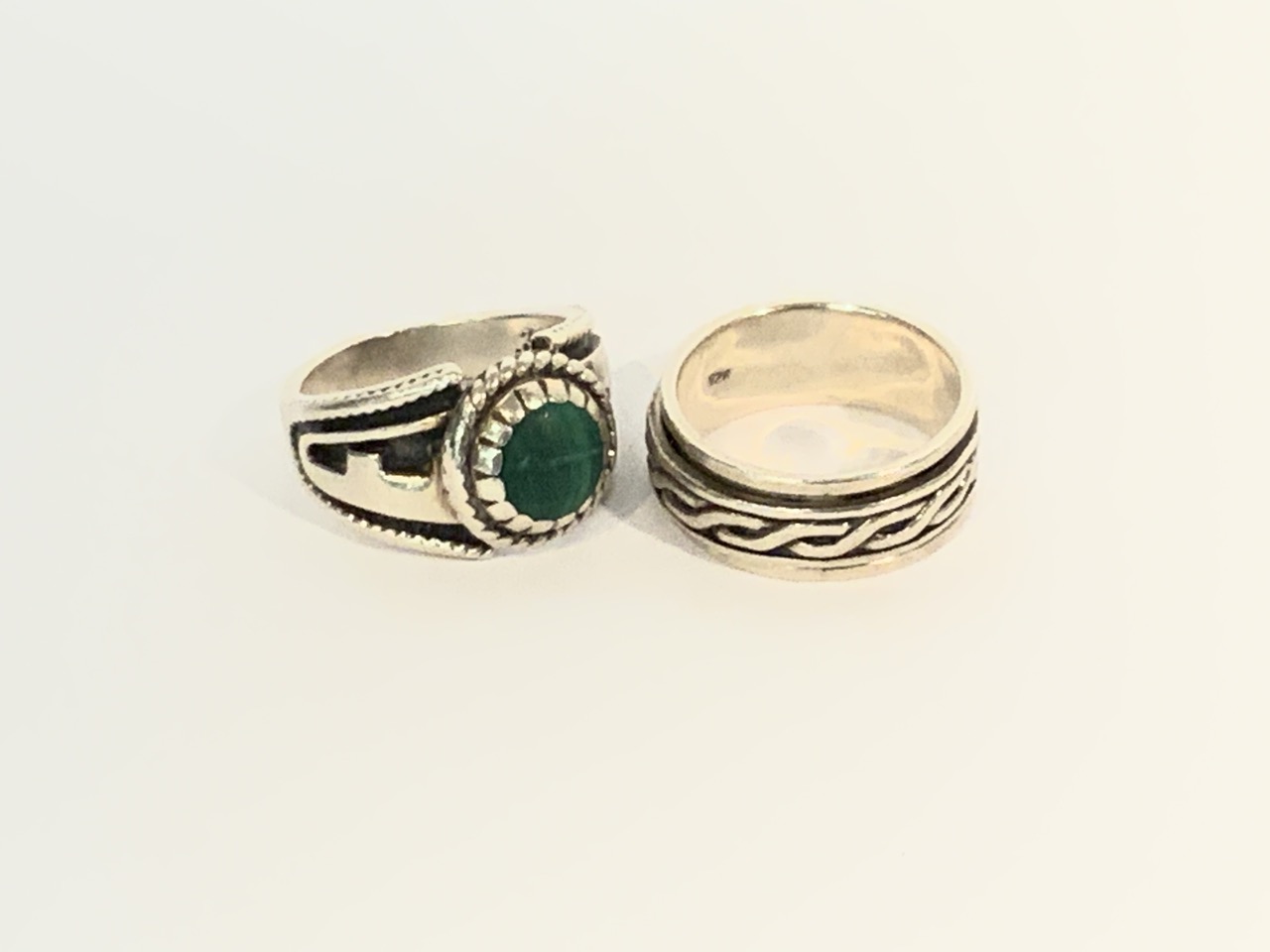 Two (2) Heavy men's sterling silver rings. One with malachite stone. Size 10.