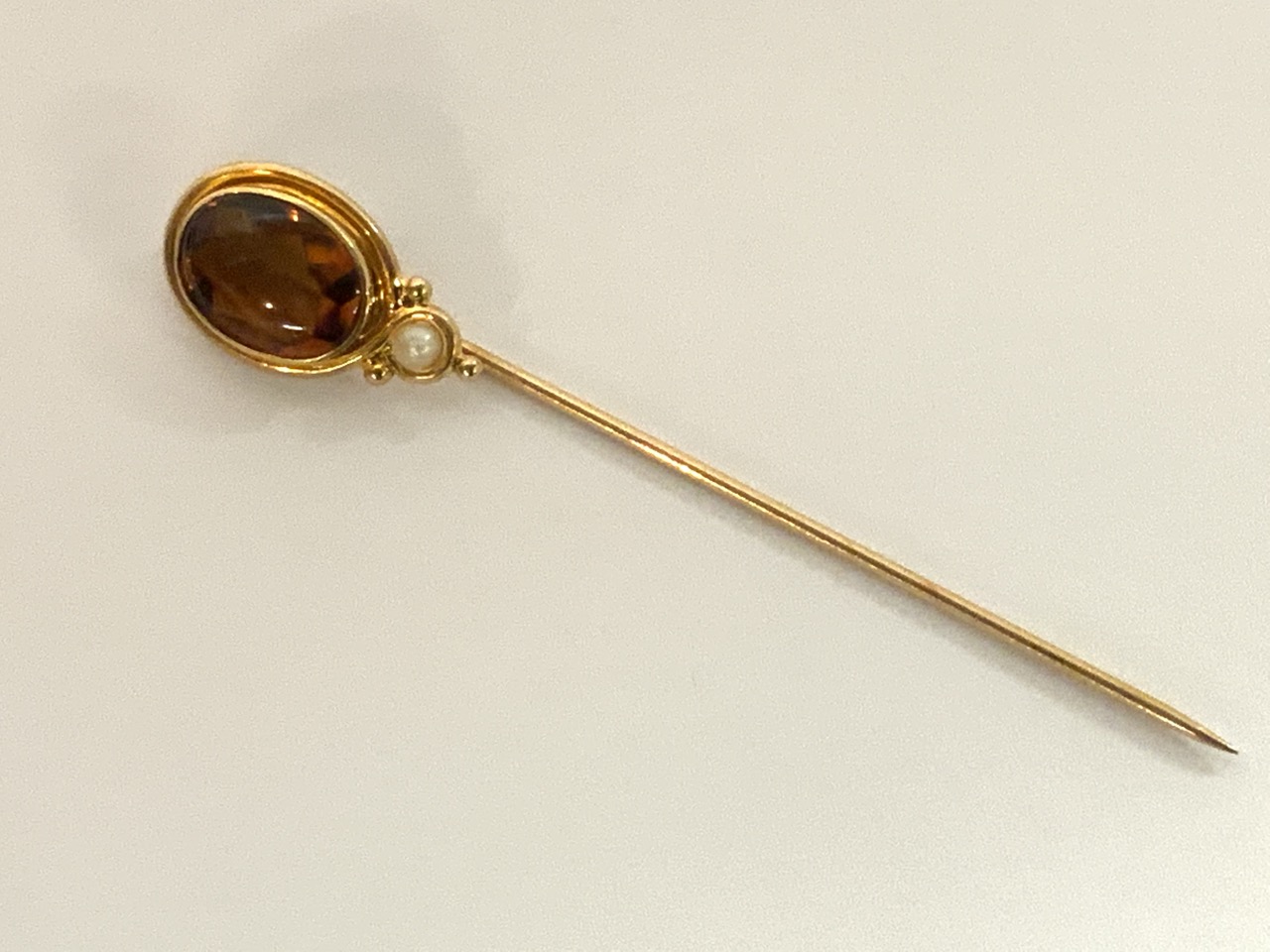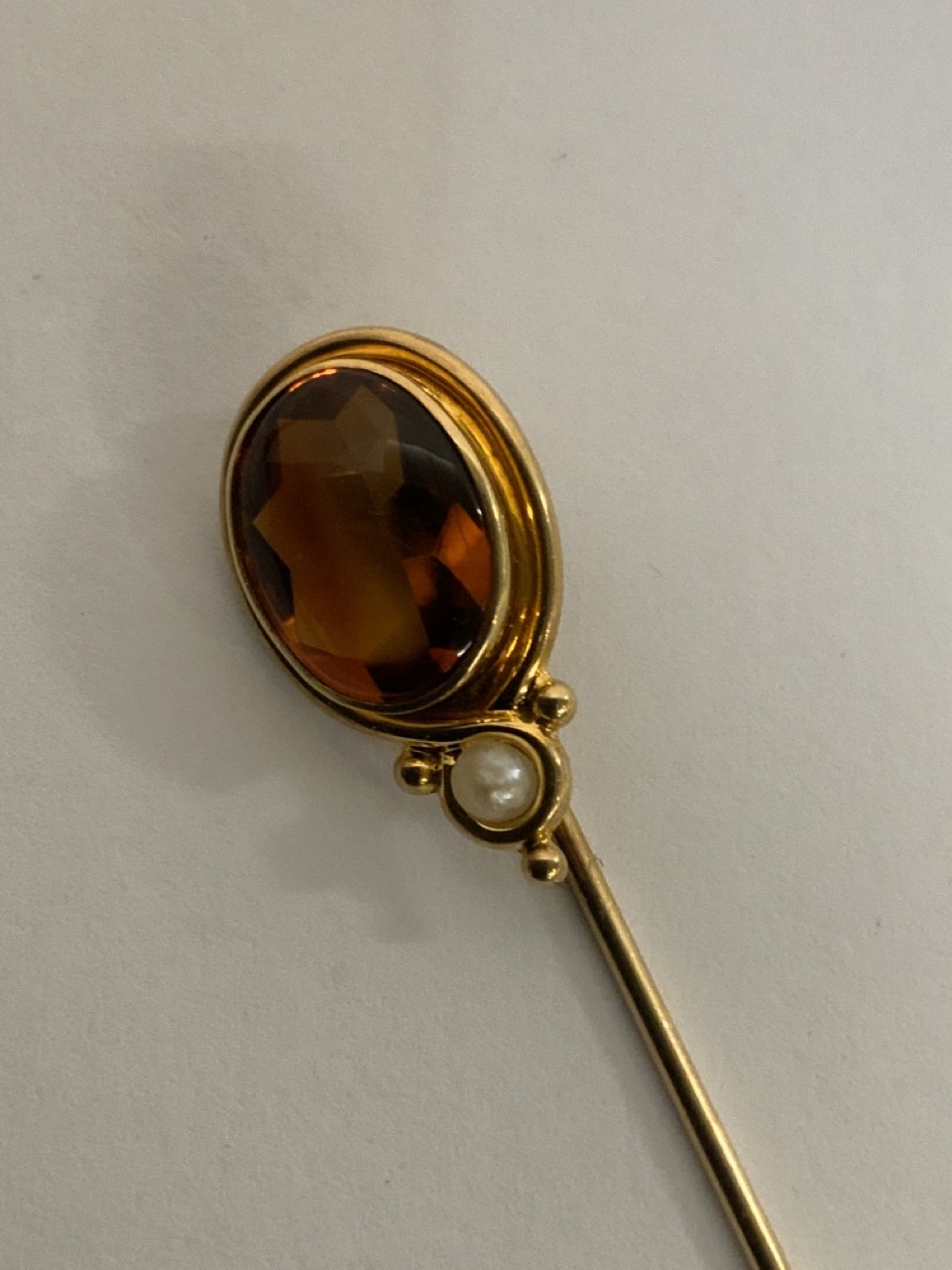 14k yellow gold citrine and pearl stick pin.