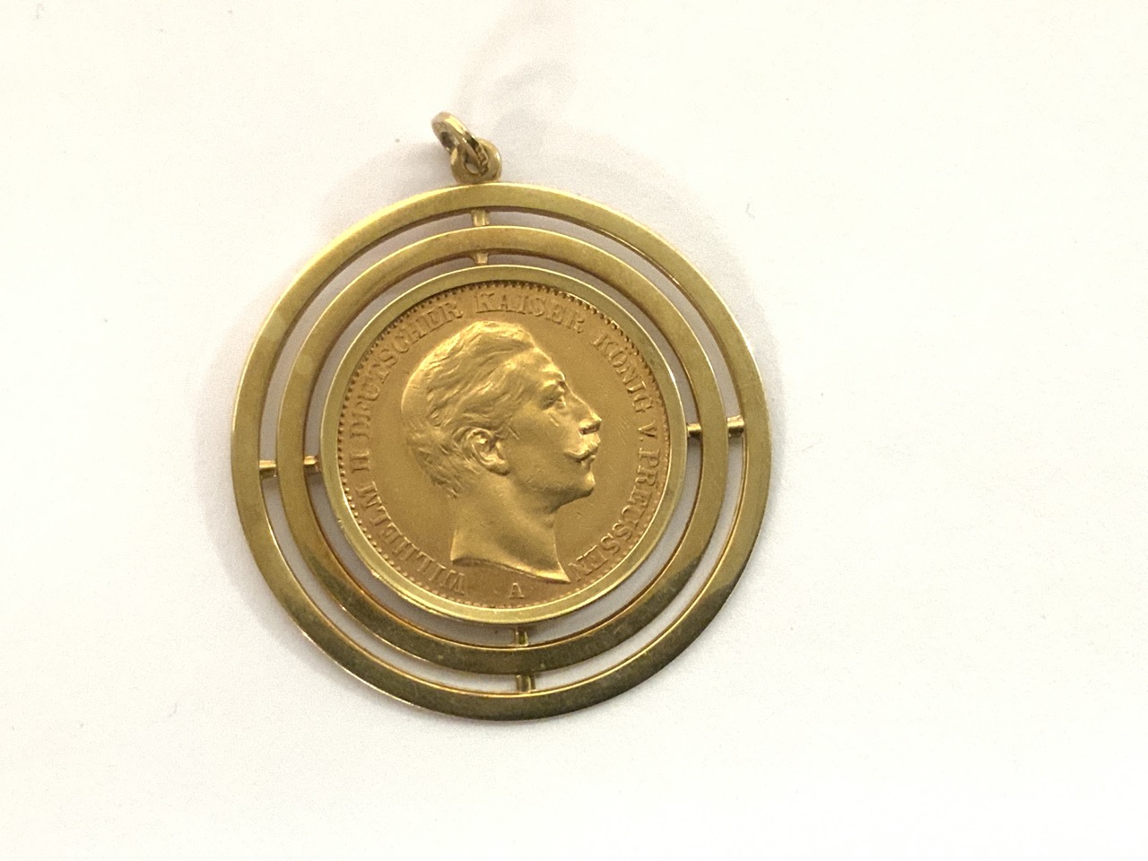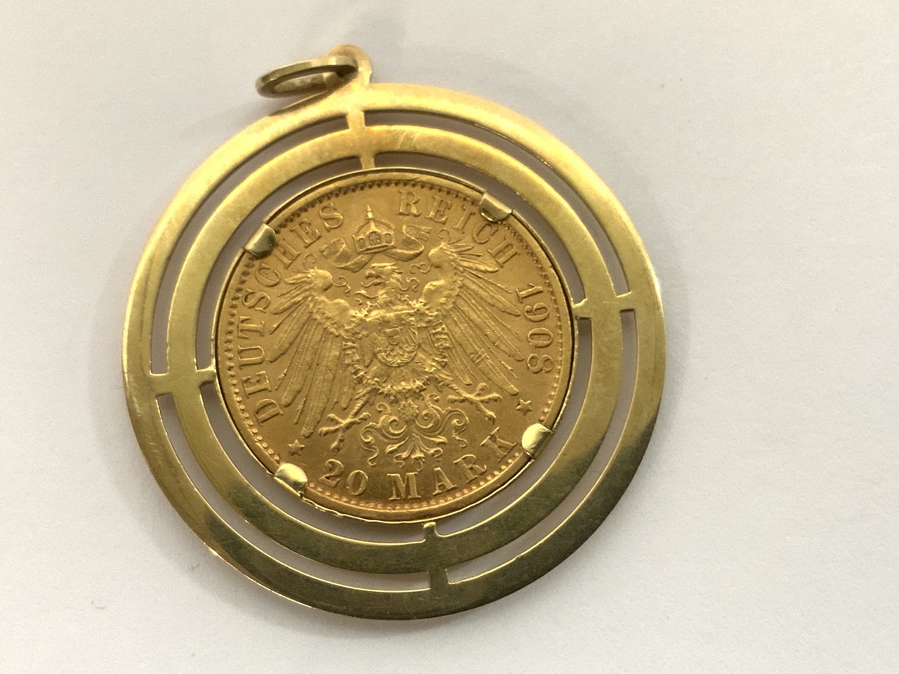 1908 20 Mark Wilhelm II Gold Coin with 14k yellow gold frame. Germany