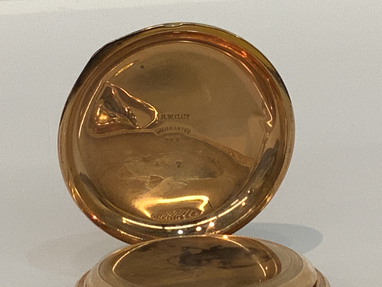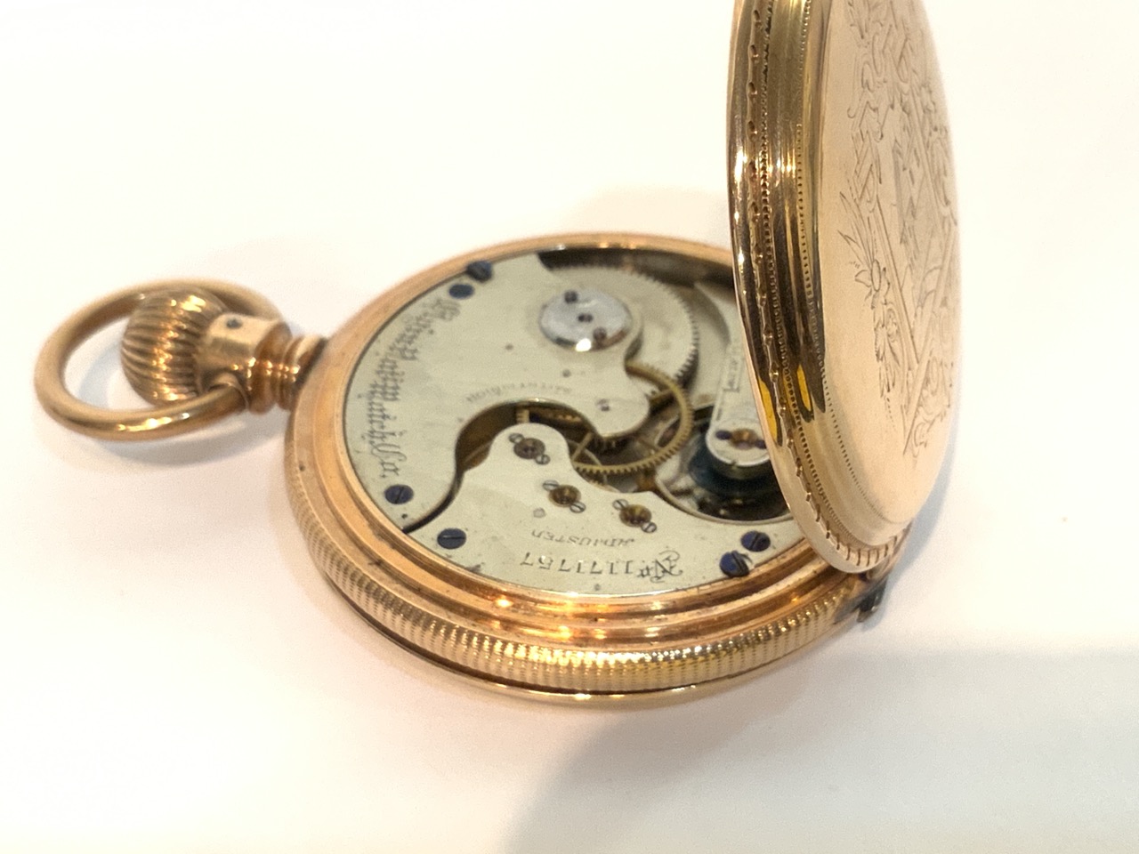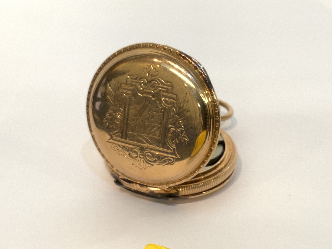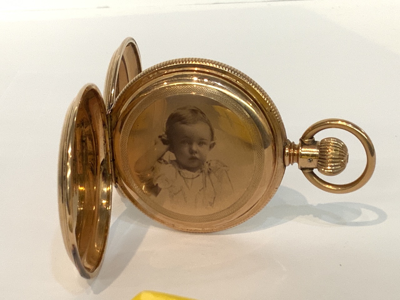 An antique 14K Gold Elgin National Watch Company. Finely engraved casing and image of child transferred to inner workings cover.