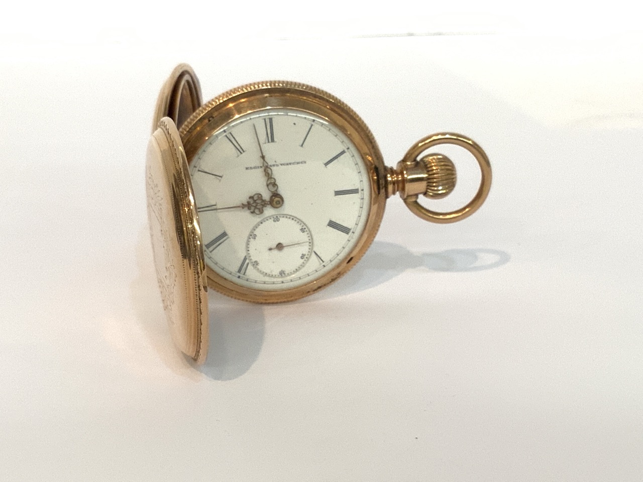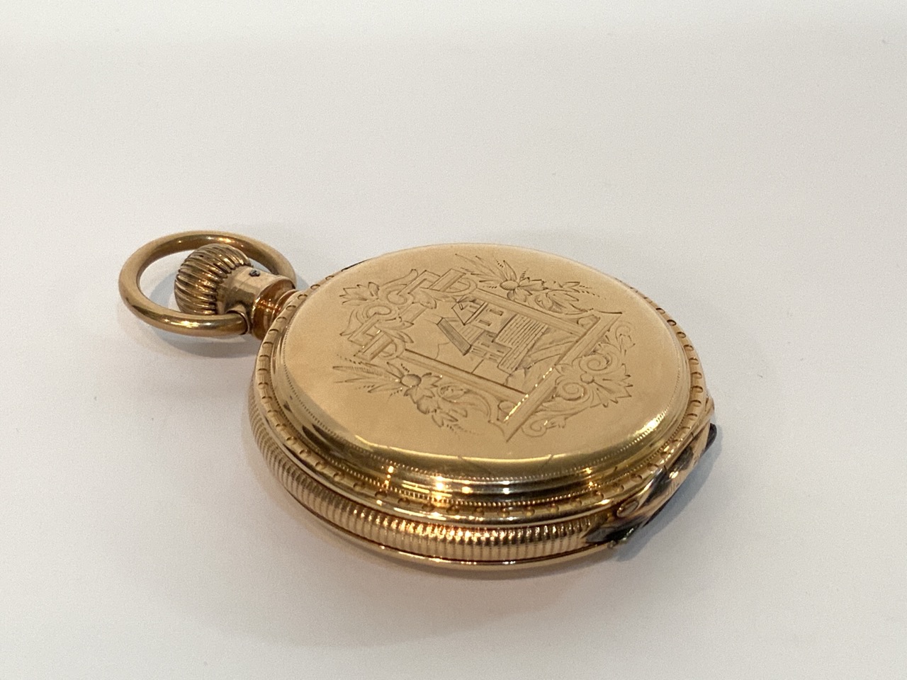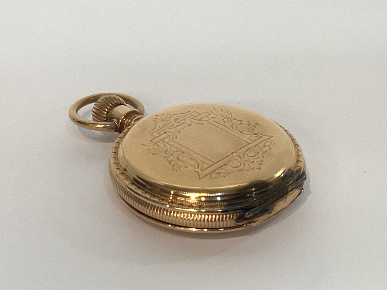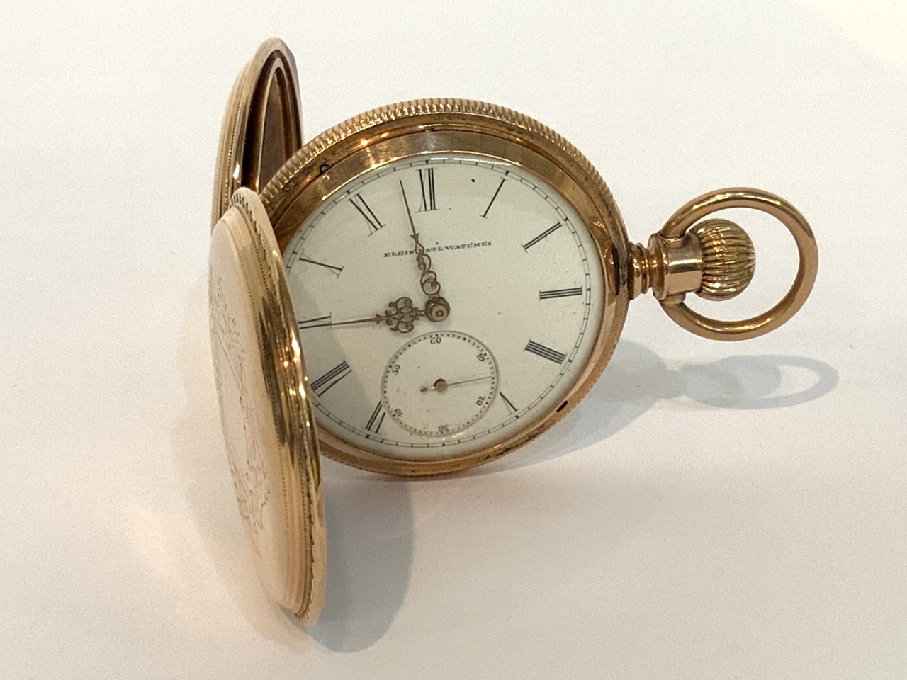 An antique 14K Gold Elgin National Watch Company. Finely engraved casing and image of child transferred to inner workings cover.