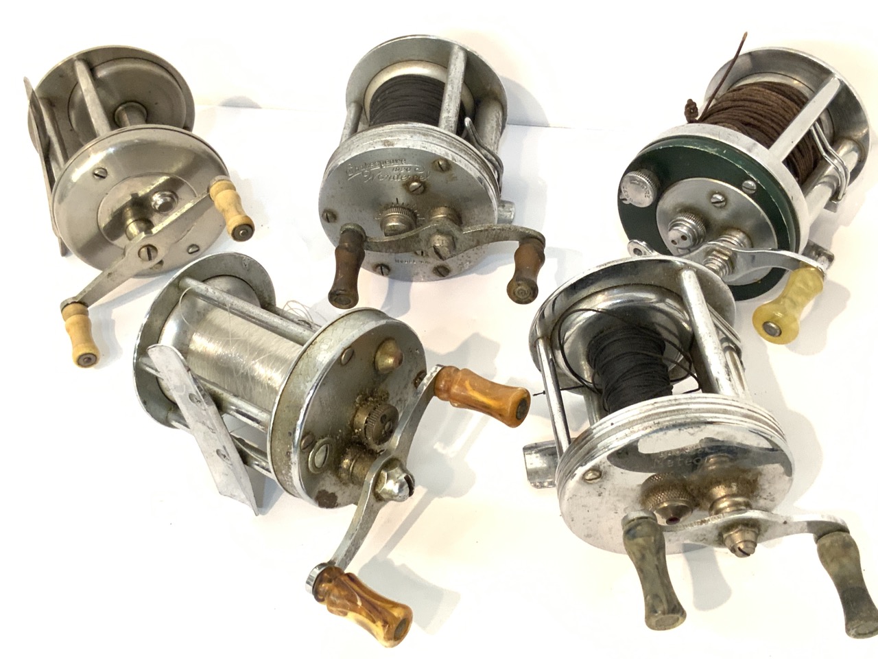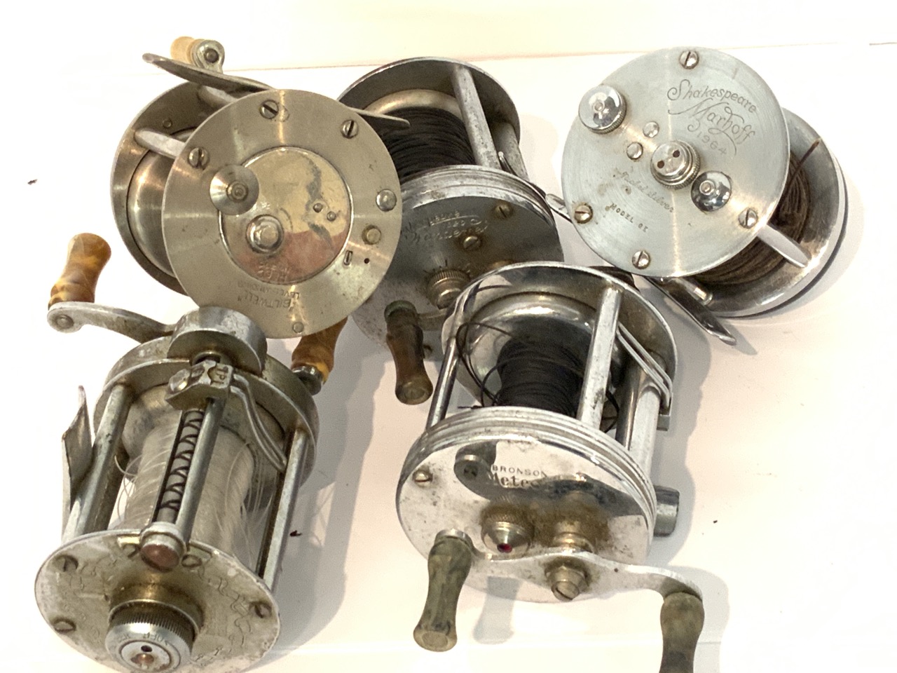 Five (5) antique fishing reels. Bronson Meteor, Shakespear Marhoff 1964 Model GE, Shakespear 1920 Wondereel #200 and Plueger Skilkast 1953 as seen in photograph preview.
