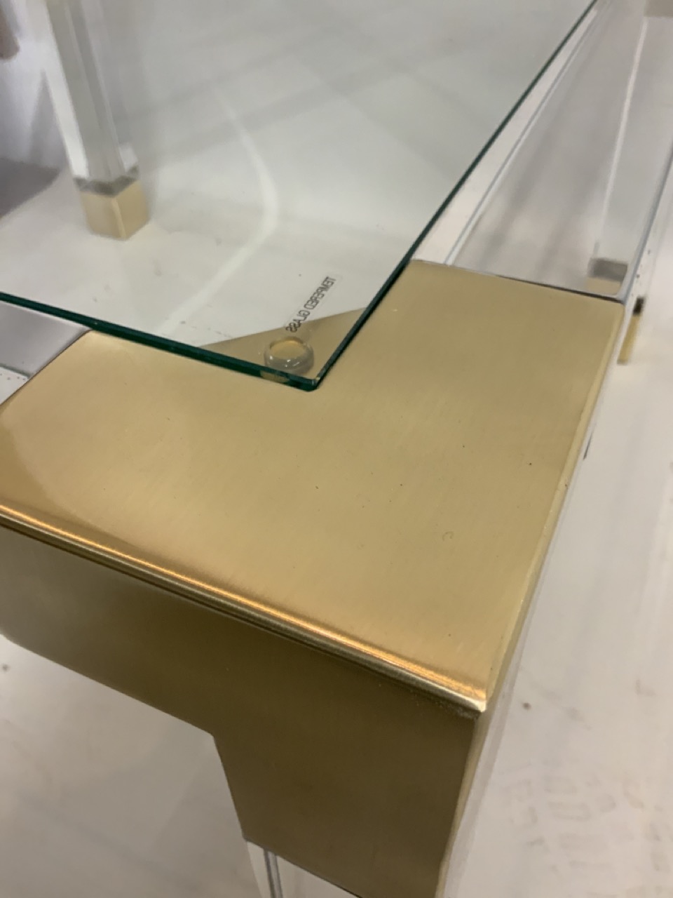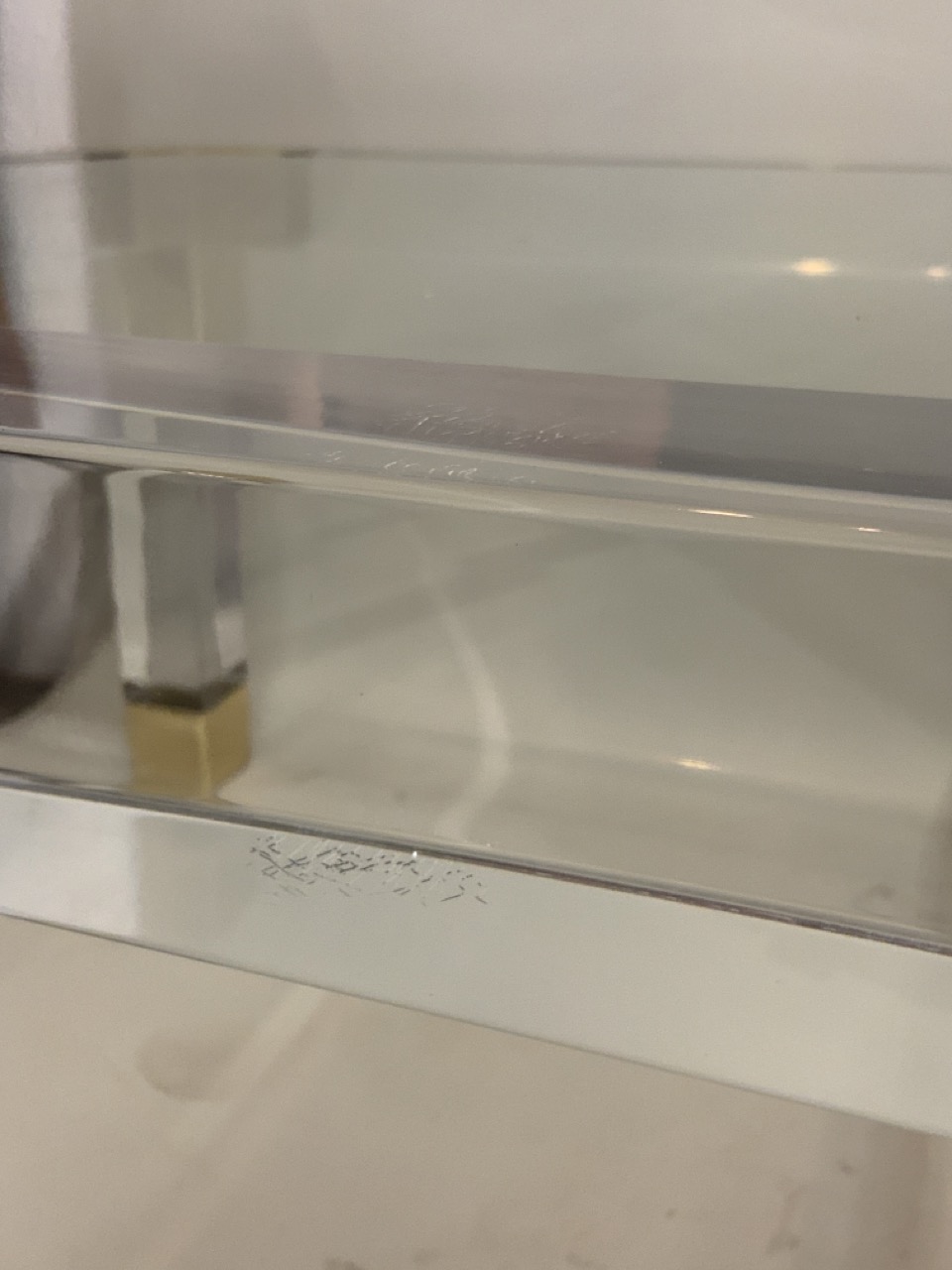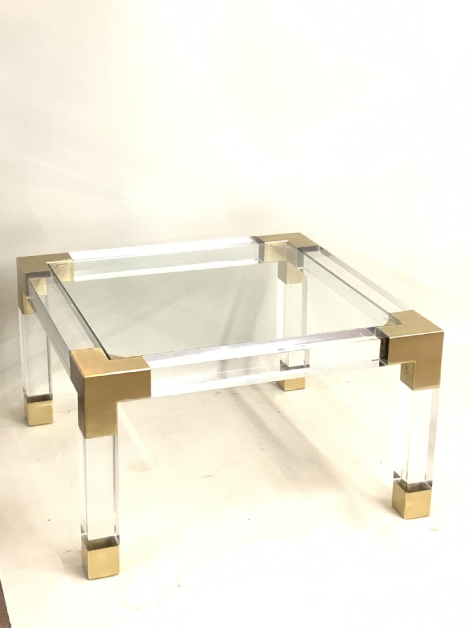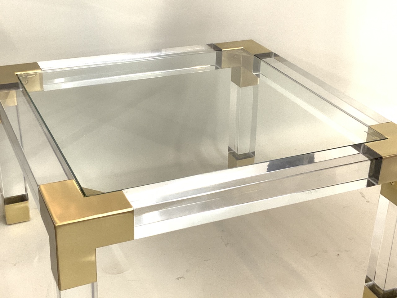 Jonathan Adler designer signed cocktail table. Lucite and brass table frame with glass top.