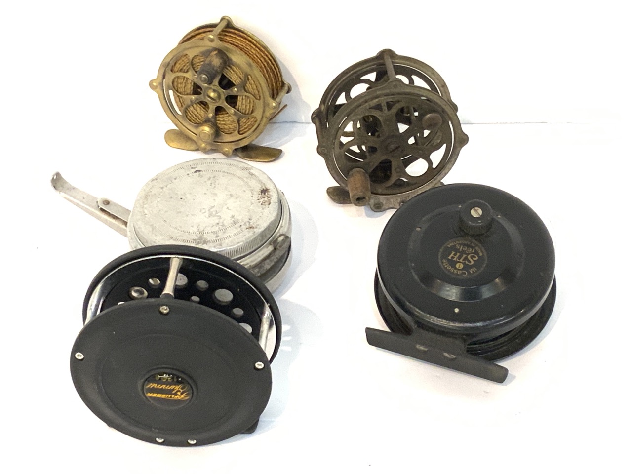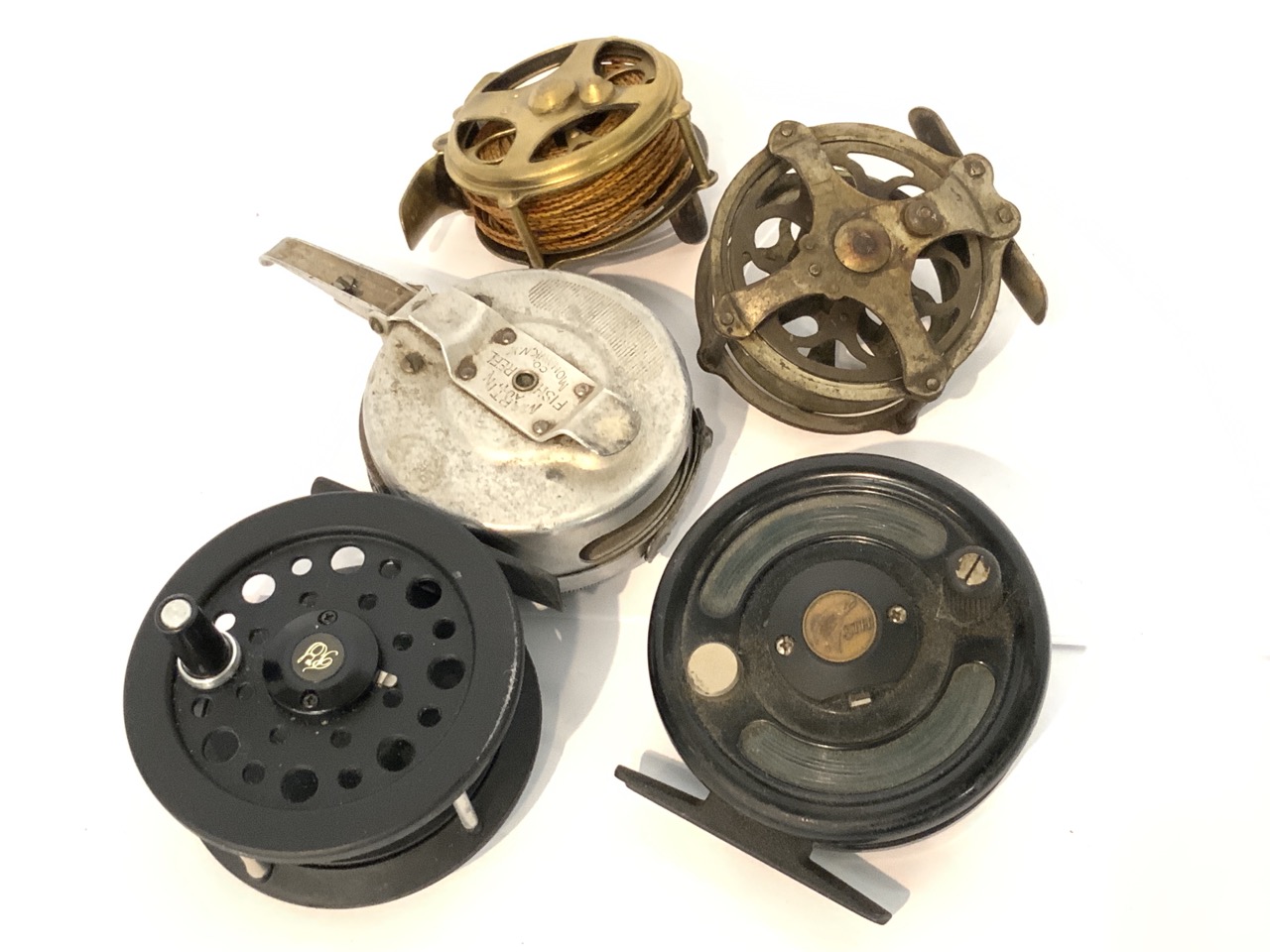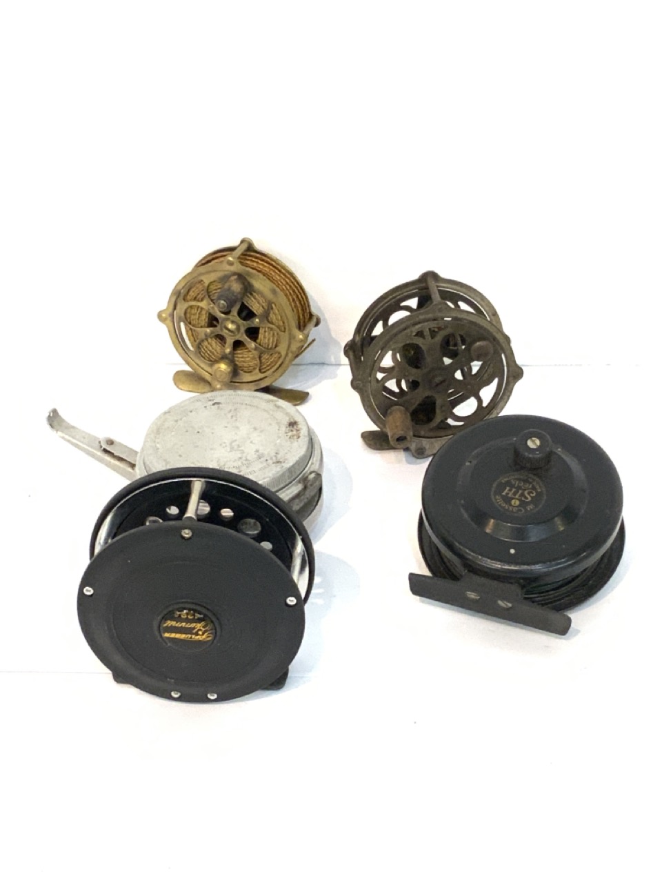 Five (5) assortee fly fishing reels. Pfueger Summit 1294, Cassett STH Made in Argentina, Automatic Martin from Mohawk, NY and two antique unmarked reels. As seen in photograph preview.