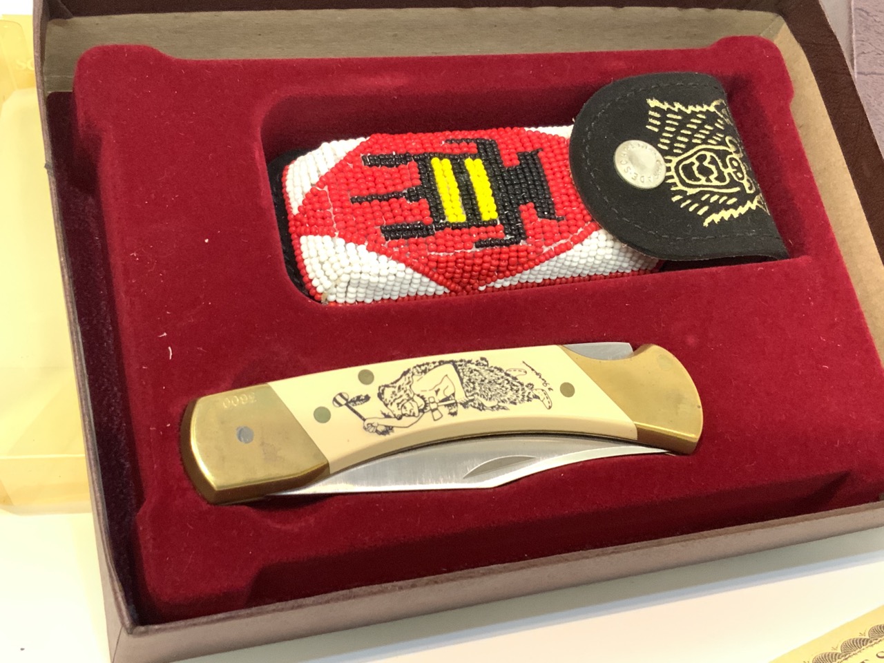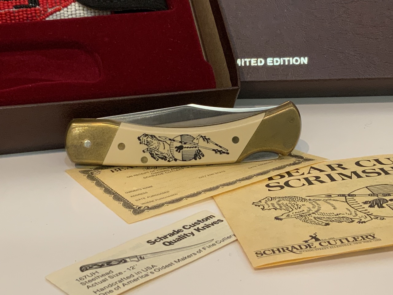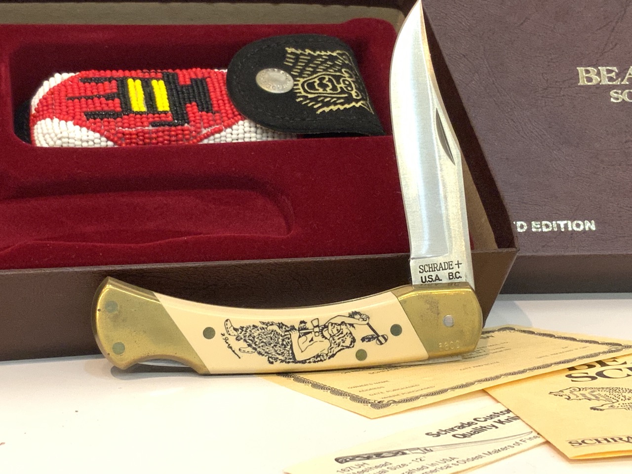 Schrade Bear Cult Scrimshaw stag handled with Indian beaded case. Limited edition. 5" length. Boxed.