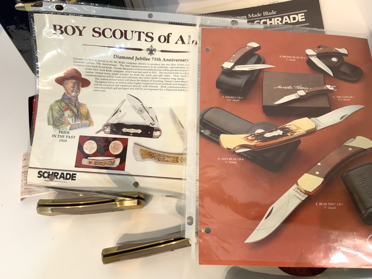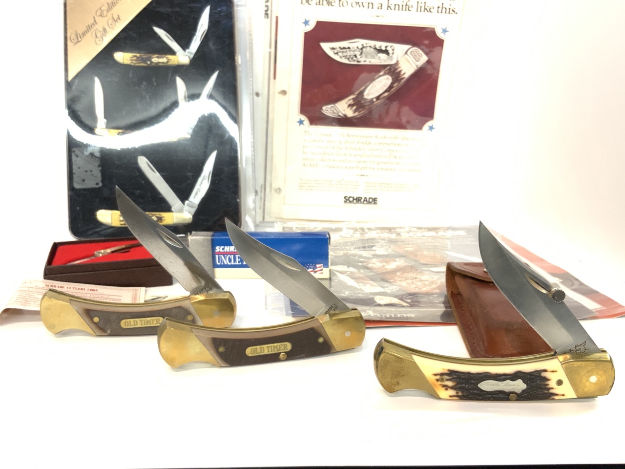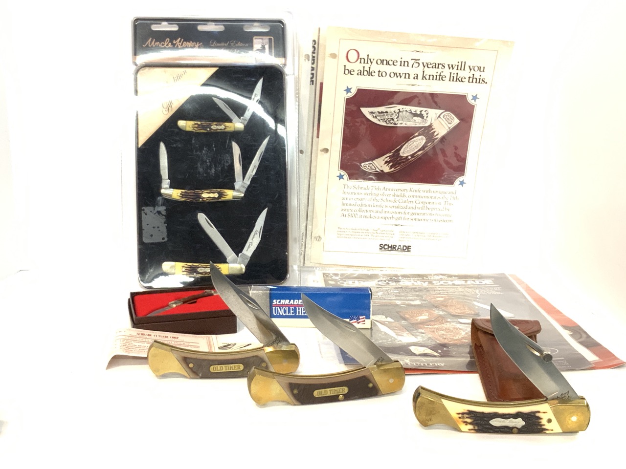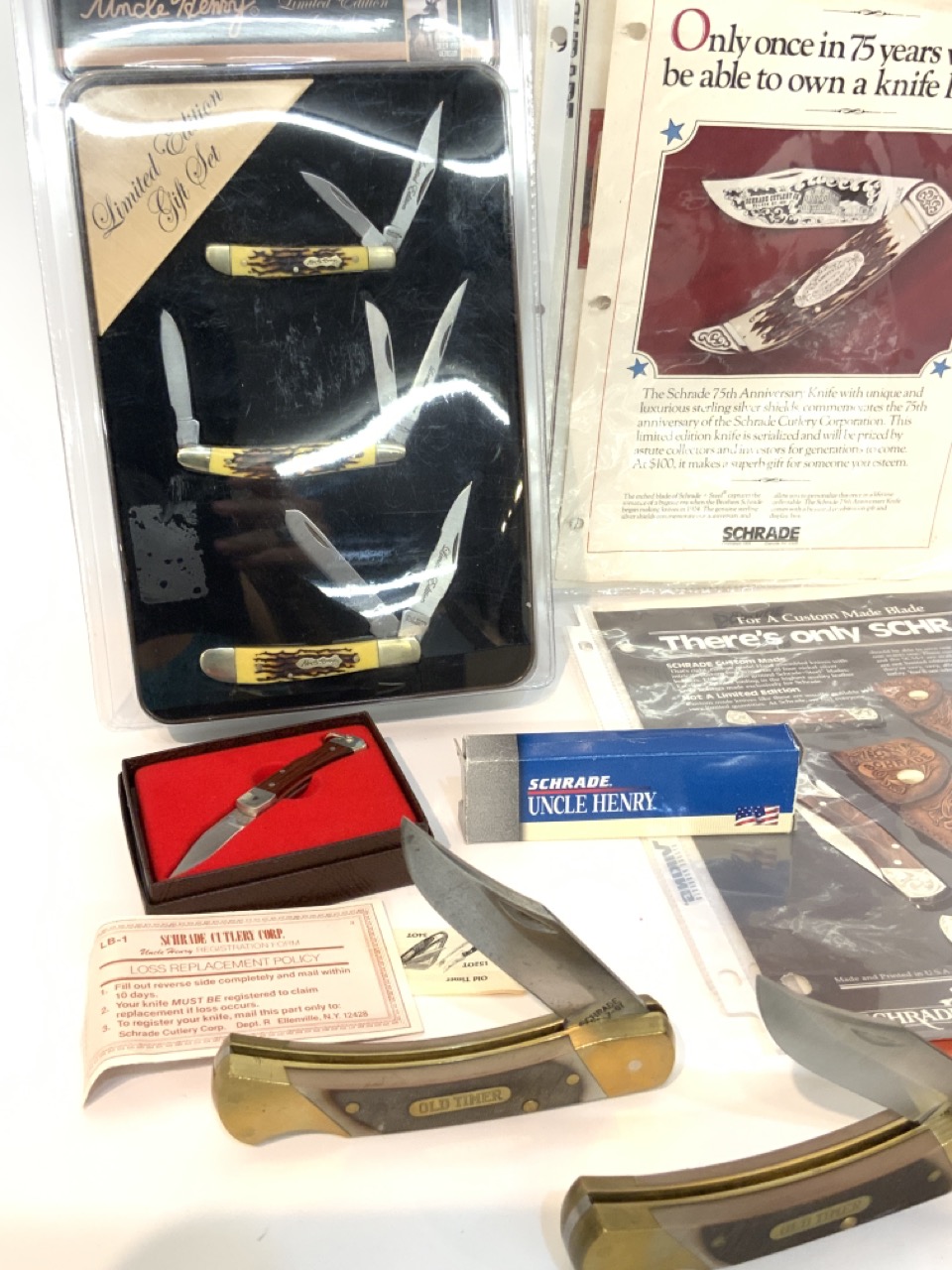 Assorted Schrade Uncle Henry and Old Timer Knives. Paper advertisments etc. One Lot as seen in photograph preview.