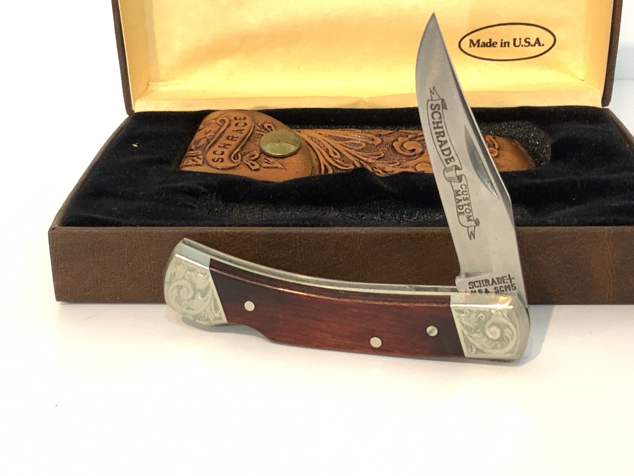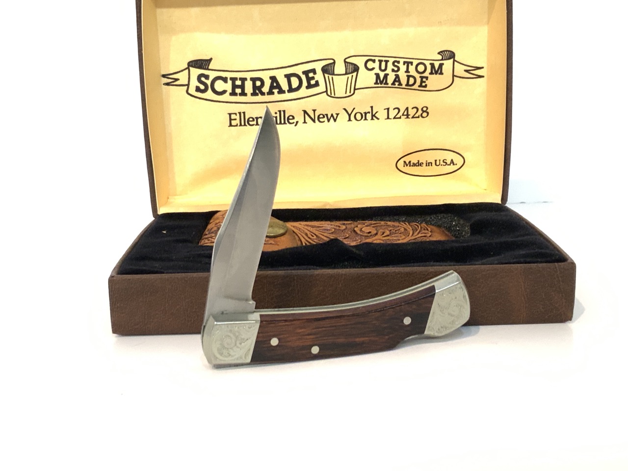 Schrade Ellenville, New York custom made knife with tooled leather case.