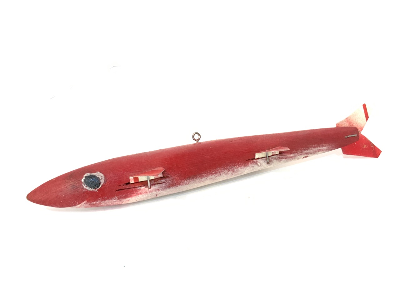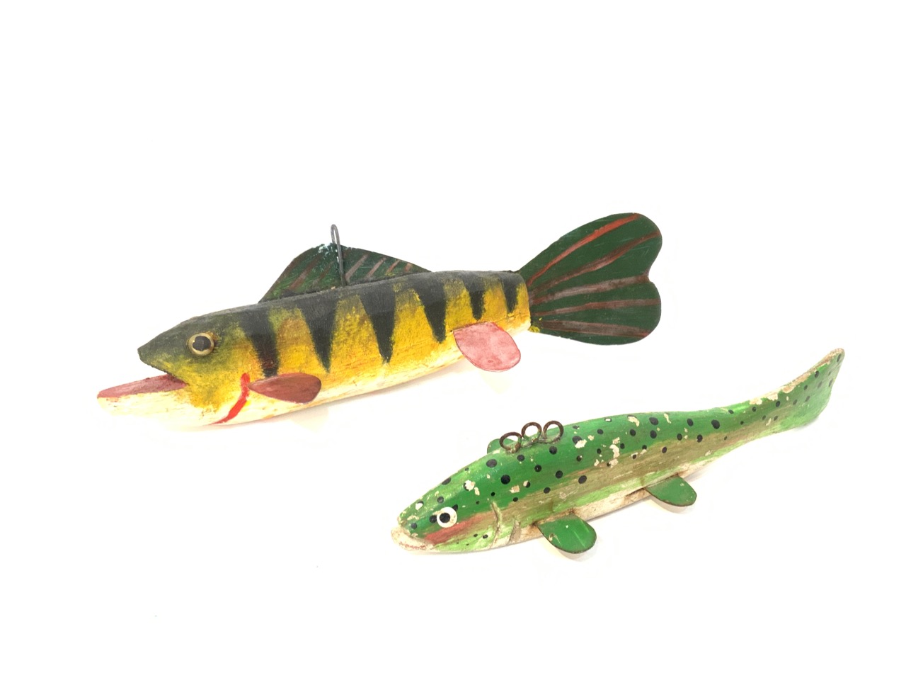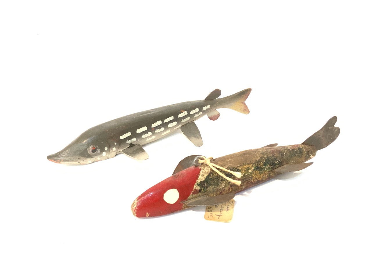A lot of five (5) vintage wood fish decoys. As seen in photograph preview.