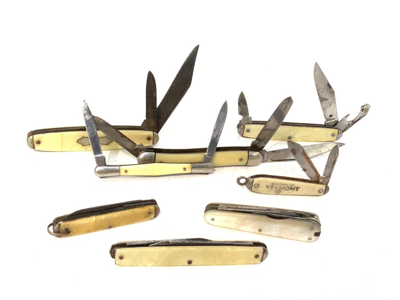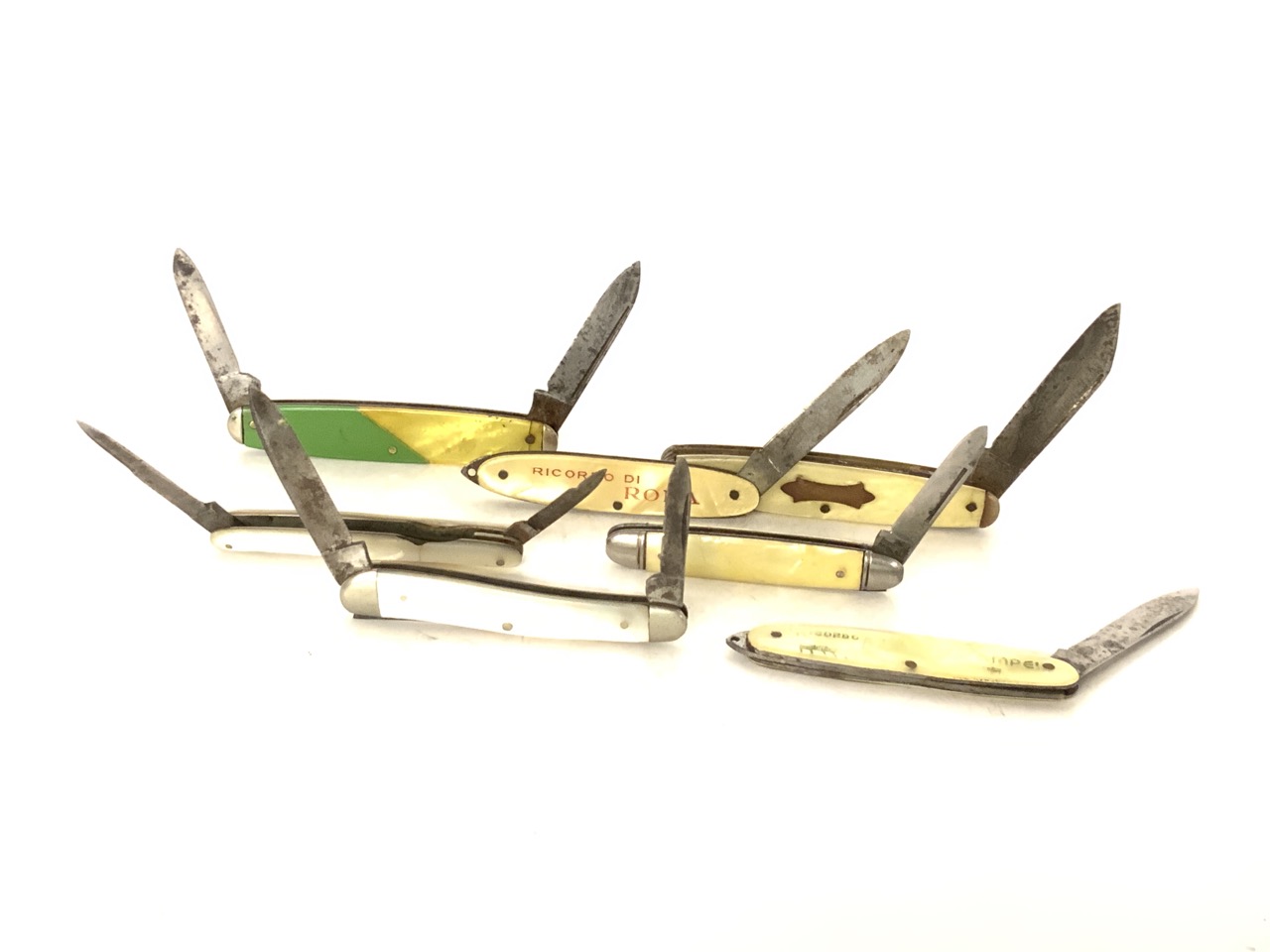 Lot of twenty (2) vintage pocket knives with pearlized handles and advertising.