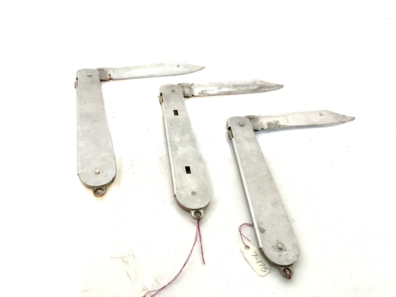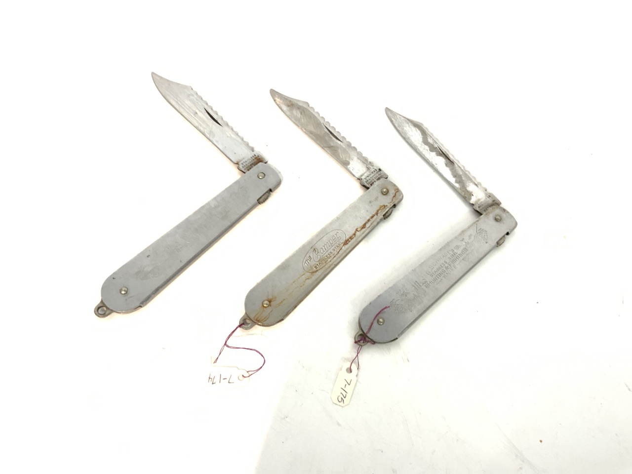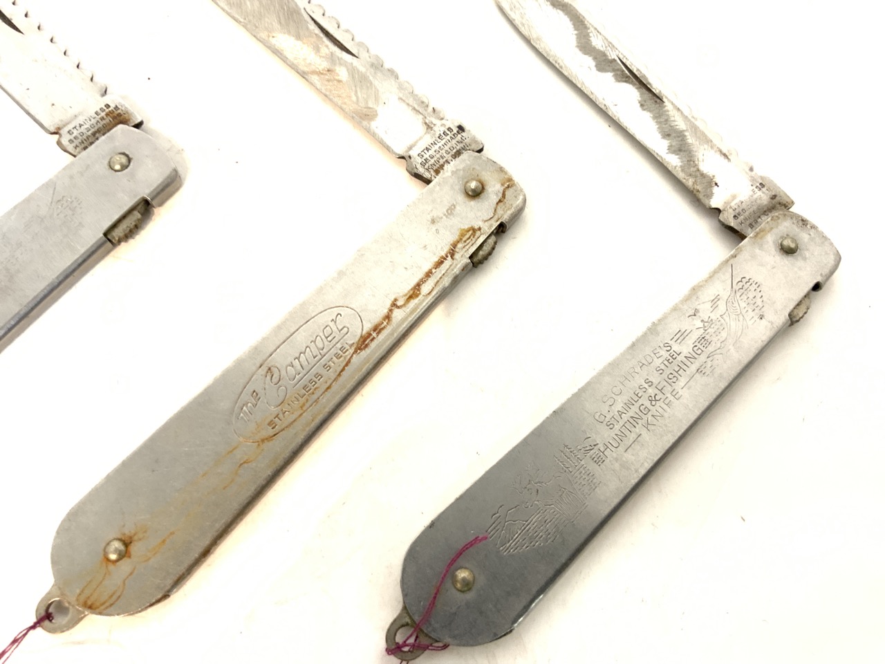 Schrade, Walden, NY pocket knives. Three pieces with stainless steel handles.