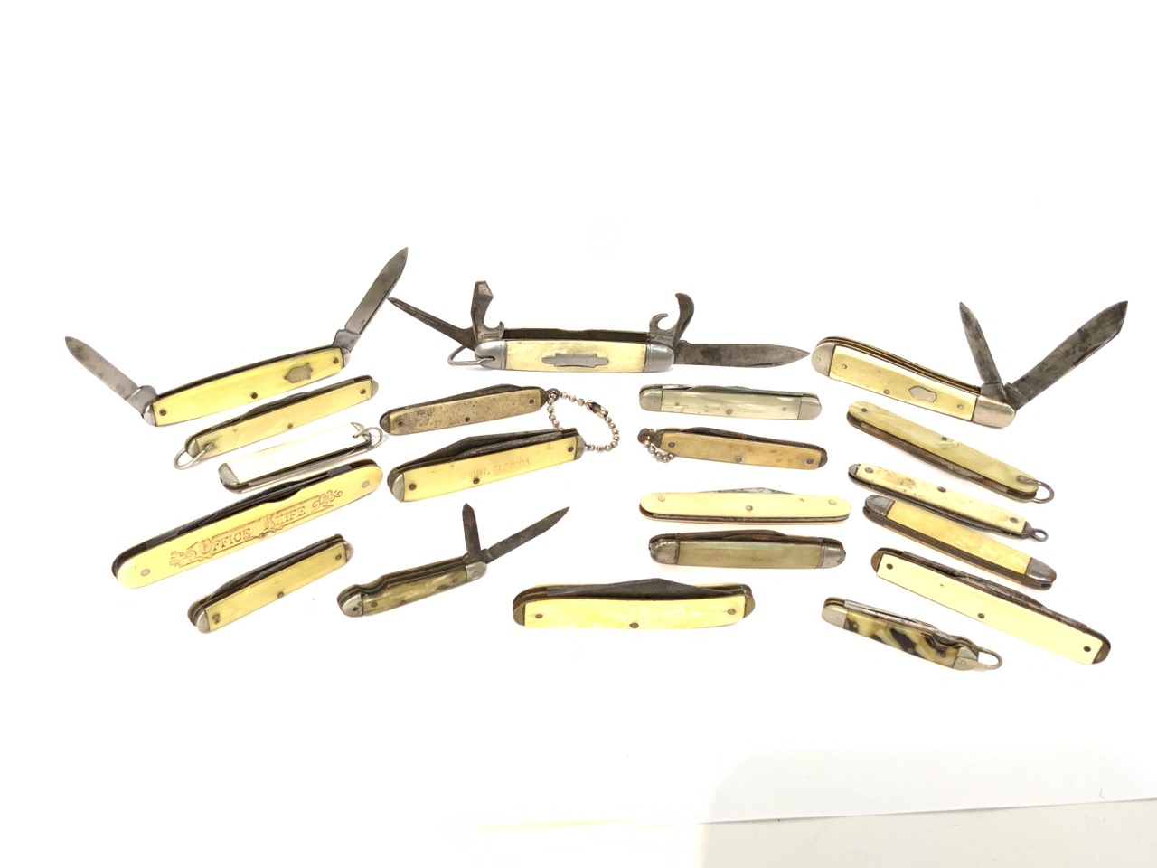 Lot of twenty (20) vintage pocket knives with pearlized handles and advertising.