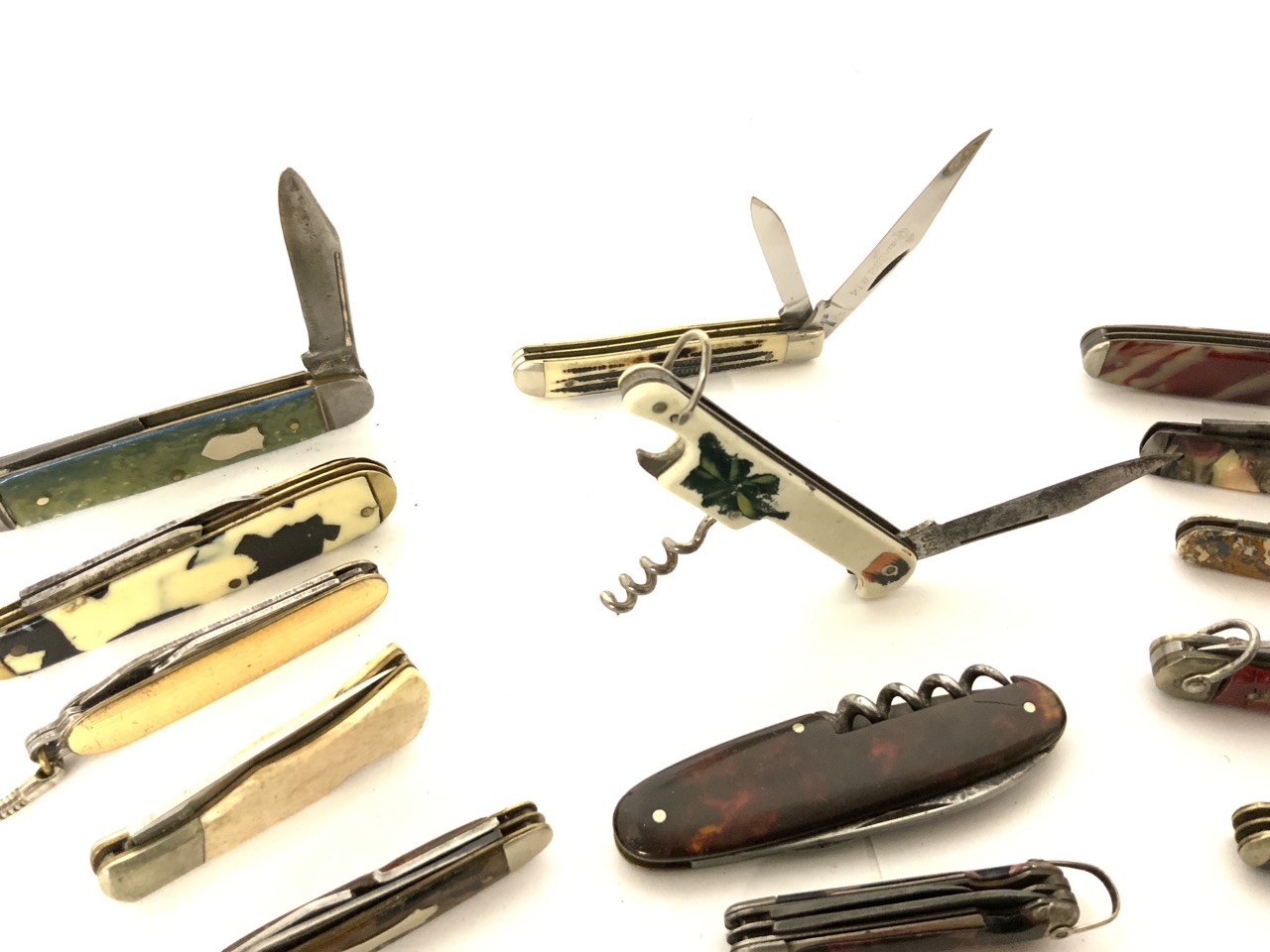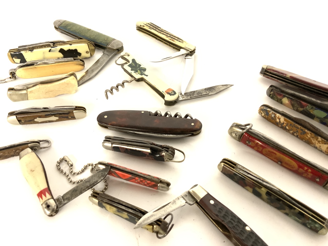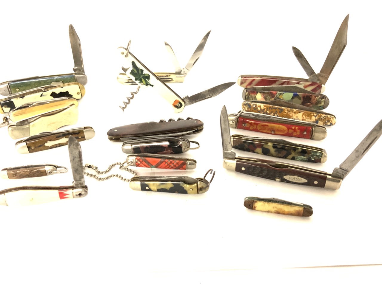 Large Grouping of twenty (20) pocket knives. Mostly vintage pearlized handled and advertising.