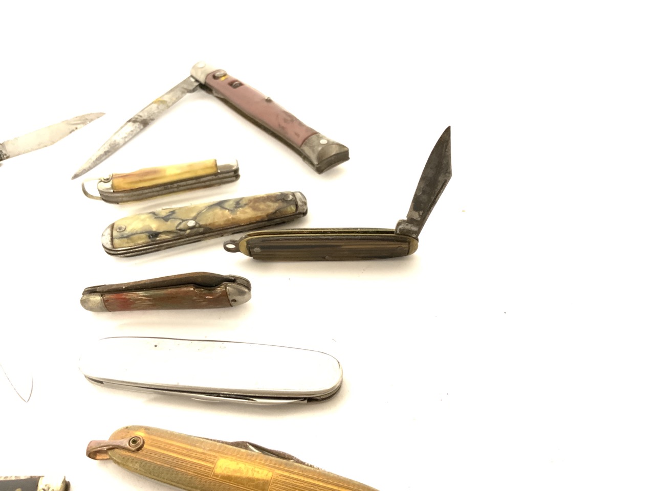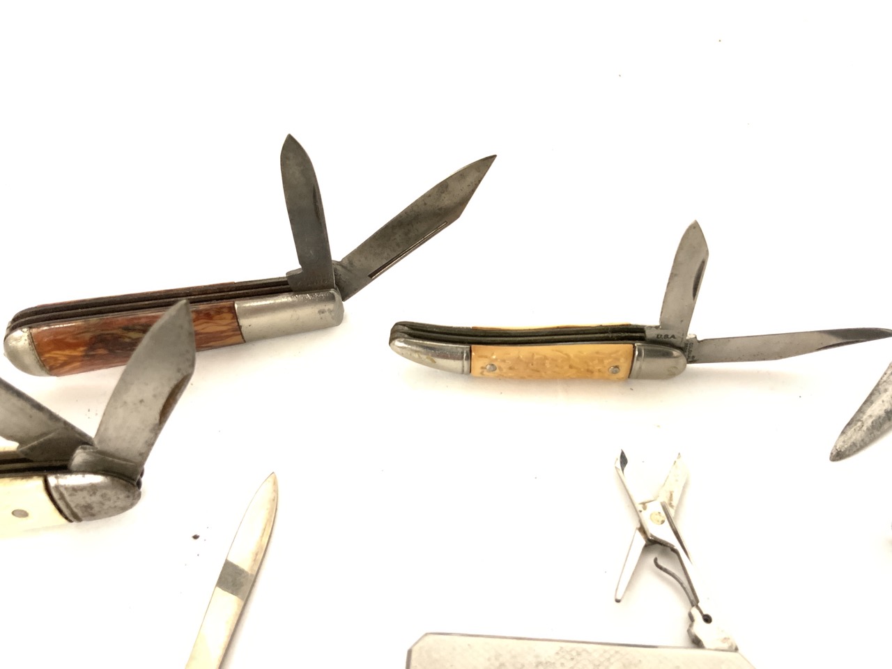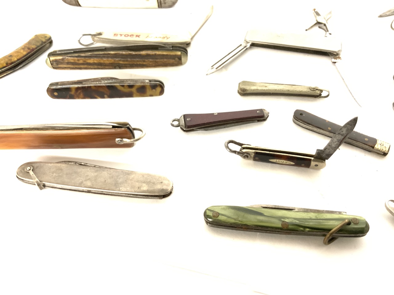 A large group of twenty-three vintage pocket knives. Mostly pearlized handles. Advertising etc.