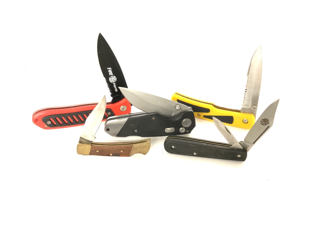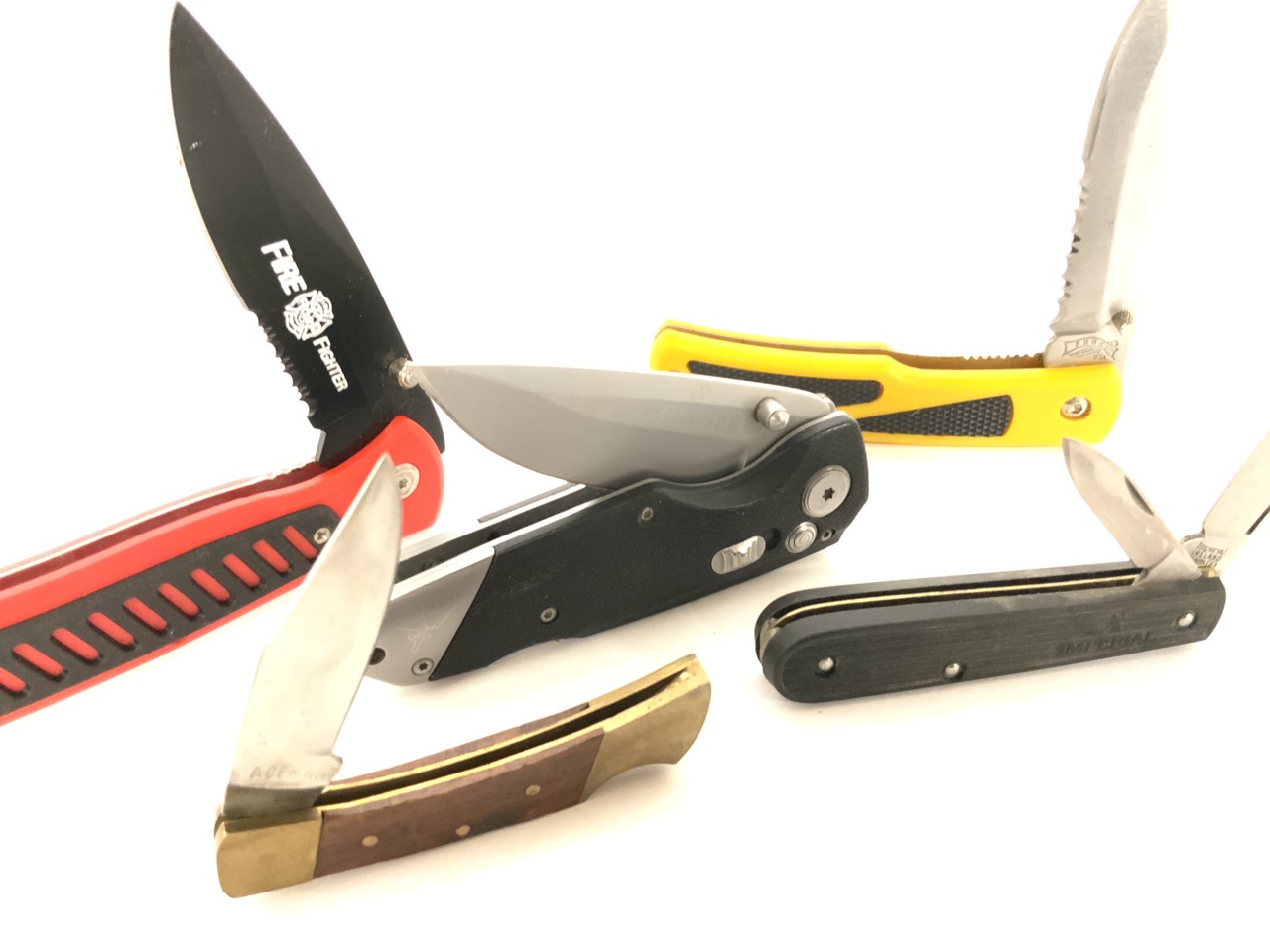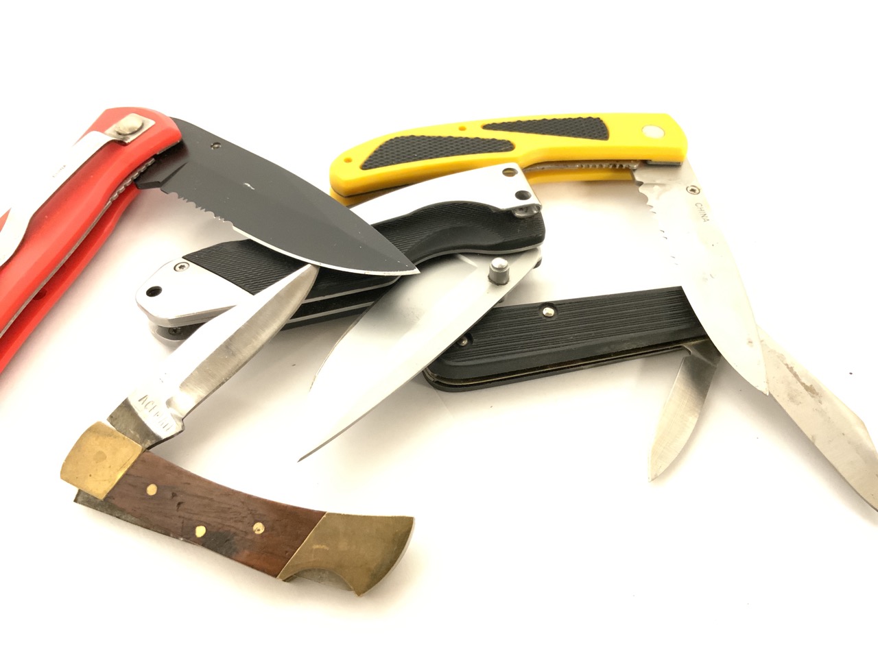 Assorted modern pocket knives.