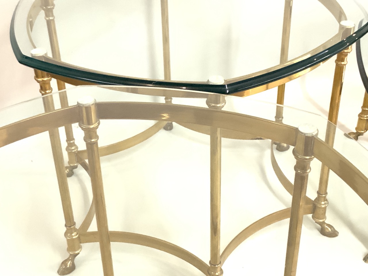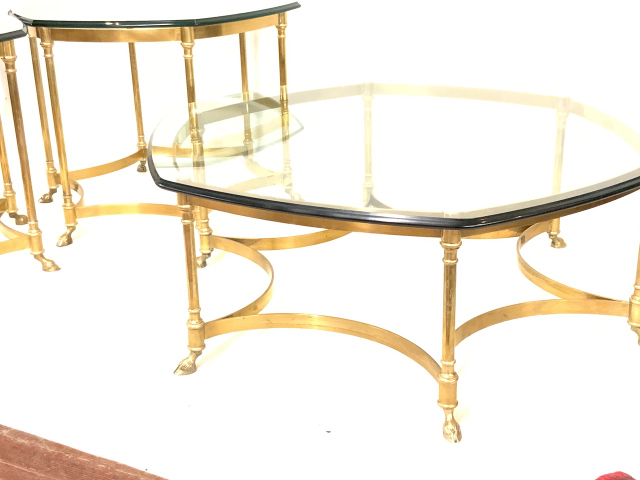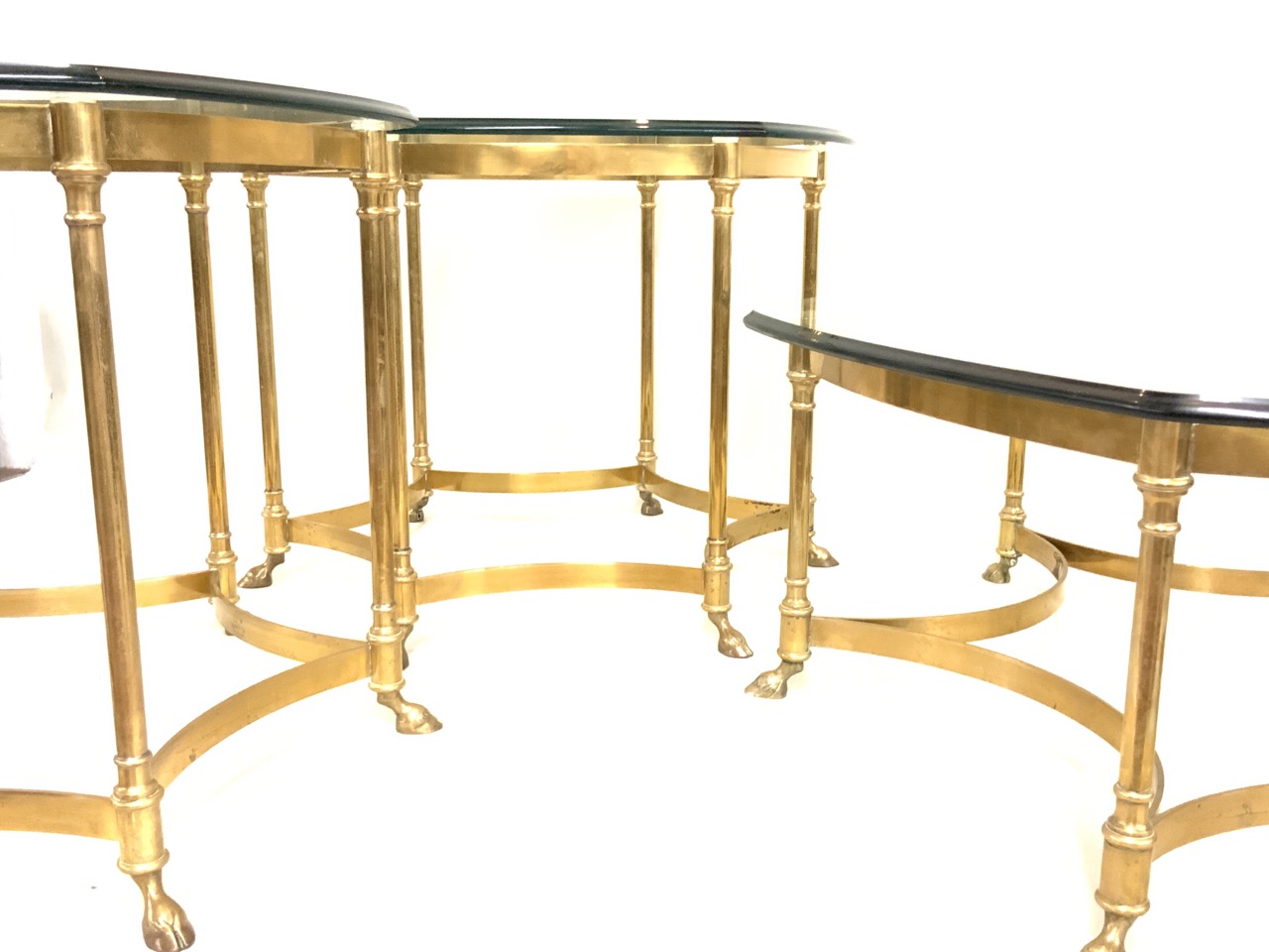 A trio of three French brass hoof foot cocktail tables with glass tops. Fine condition. High quality mid century period. One coffee low table and two side tables.