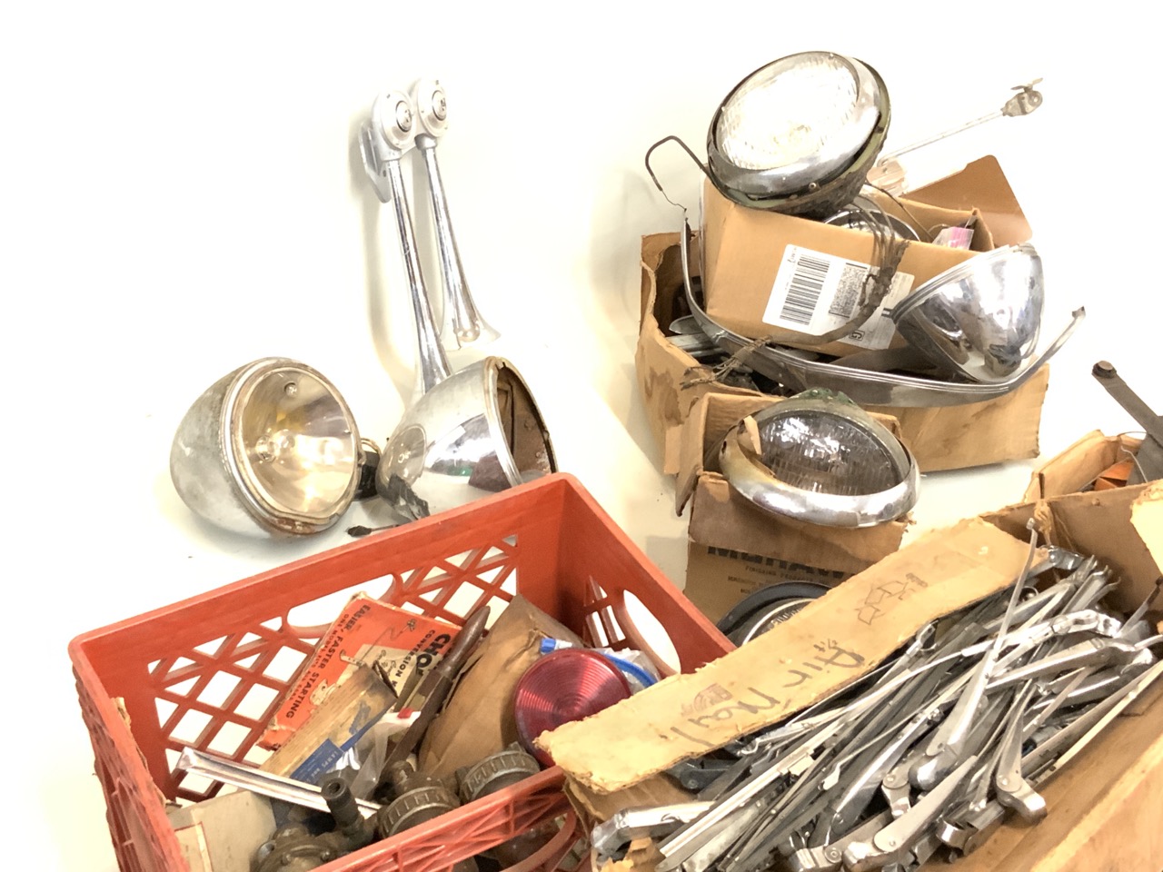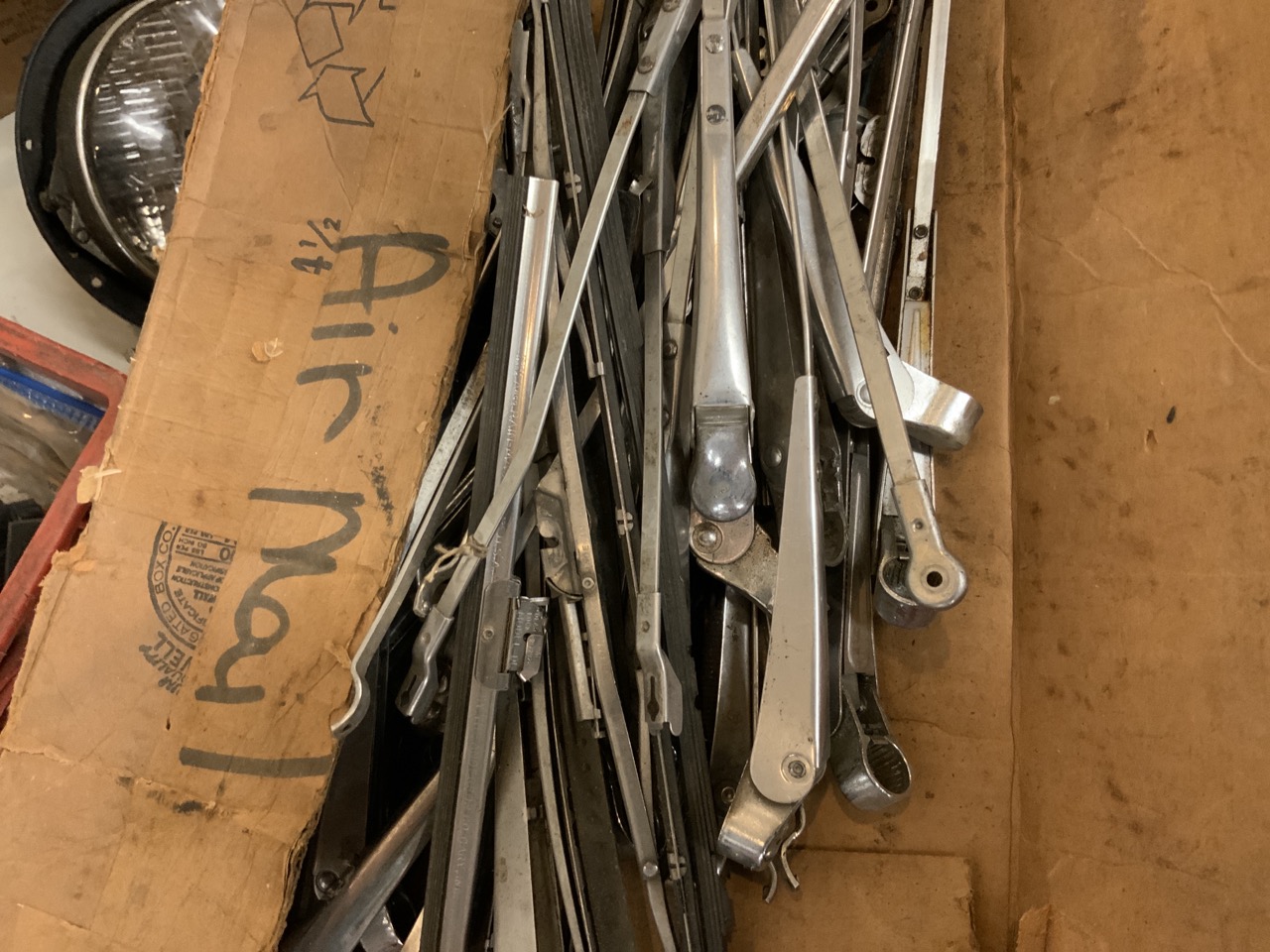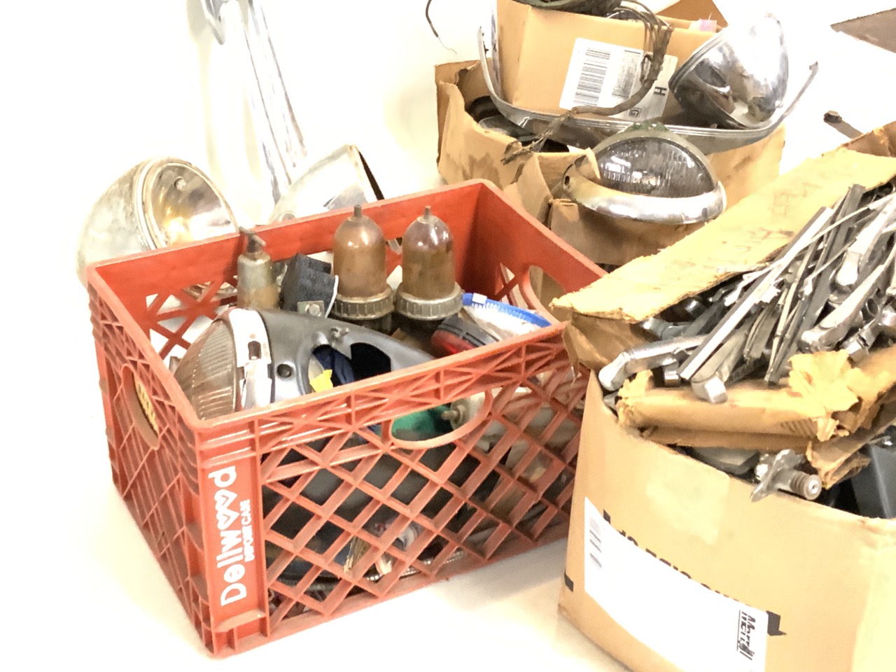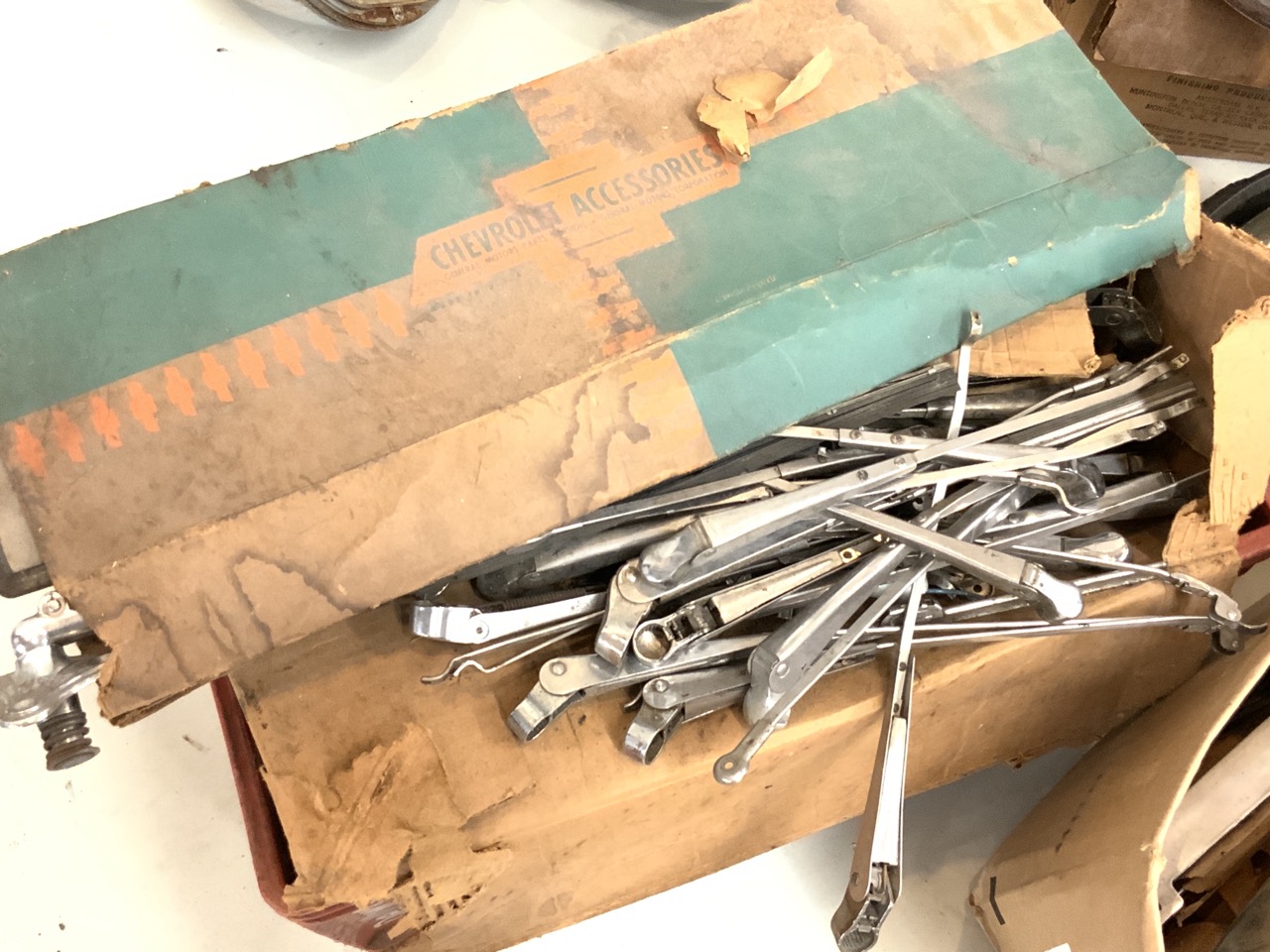 A large grouping of new/old stock and used auto parts. Mostly GM Chevrolet including headlamps, horn, wiper blades, visor, trim etc. As seen in photograph preview.