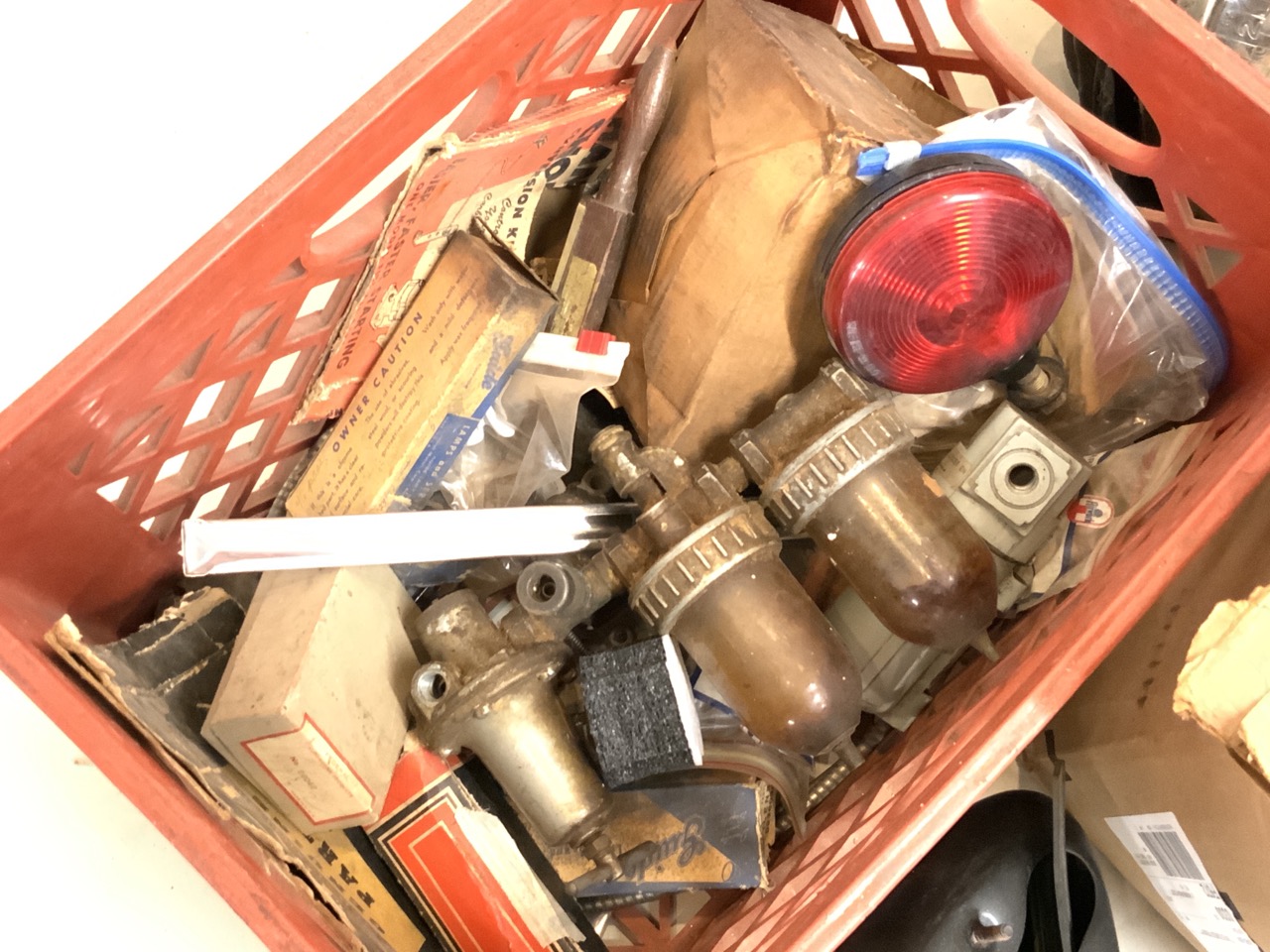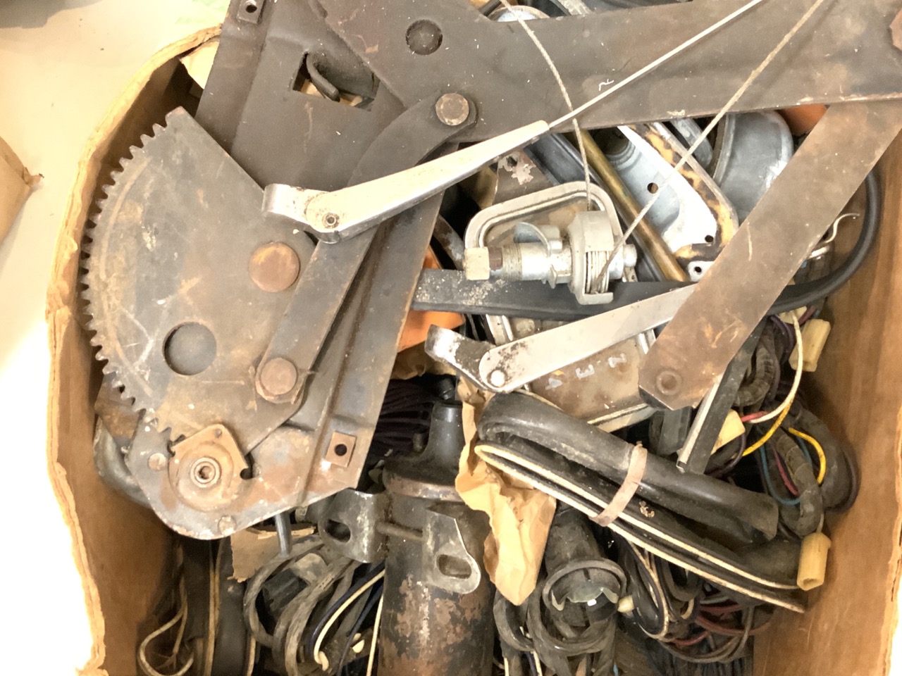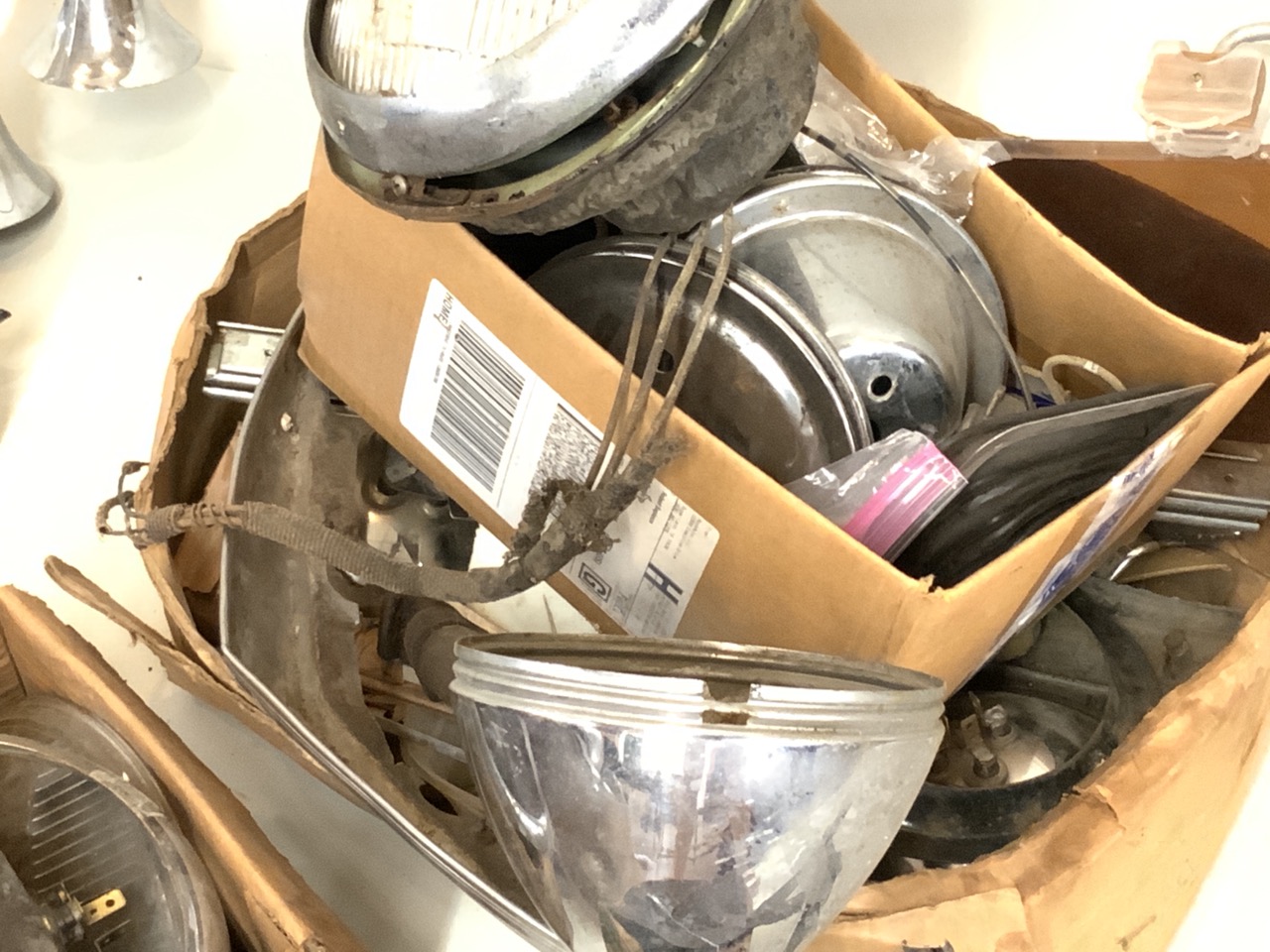 A large grouping of new/old stock and used auto parts. Mostly GM Chevrolet including headlamps, horn, wiper blades, visor, trim etc. As seen in photograph preview.