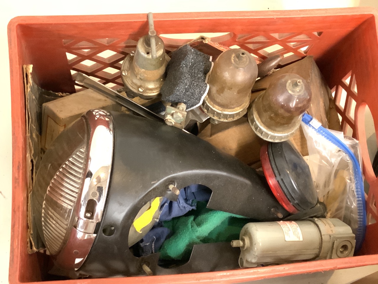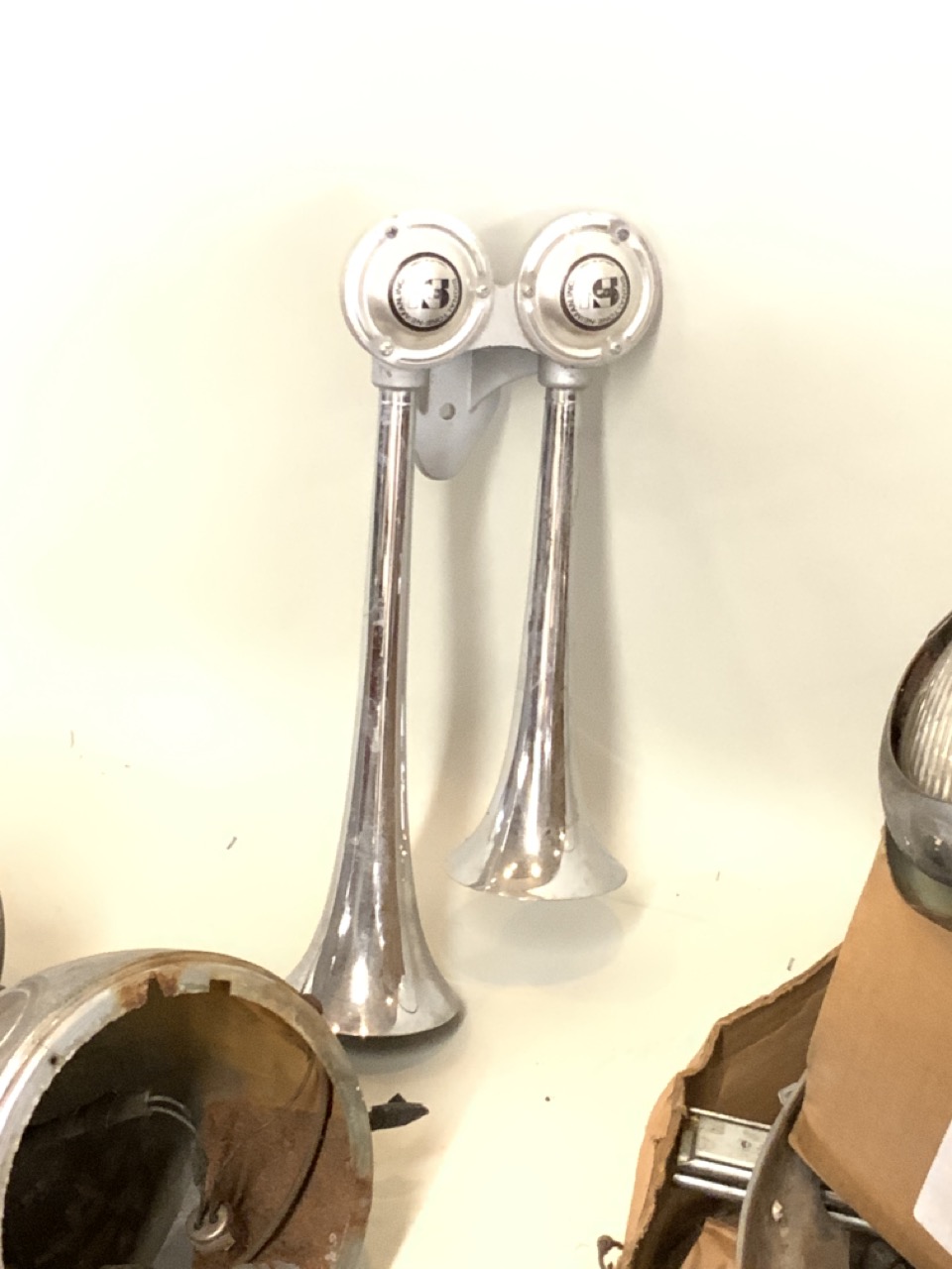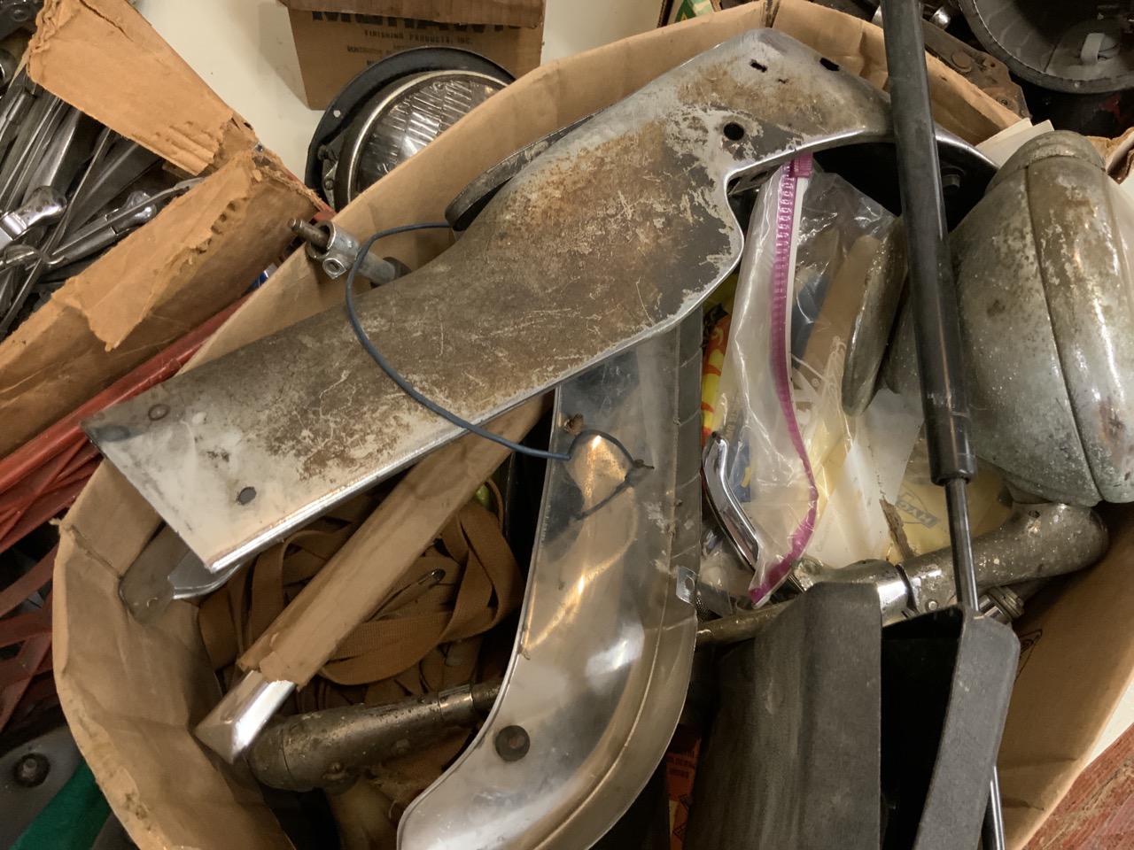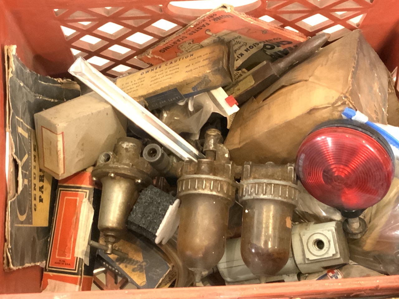 A large grouping of new/old stock and used auto parts. Mostly GM Chevrolet including headlamps, horn, wiper blades, visor, trim etc. As seen in photograph preview.