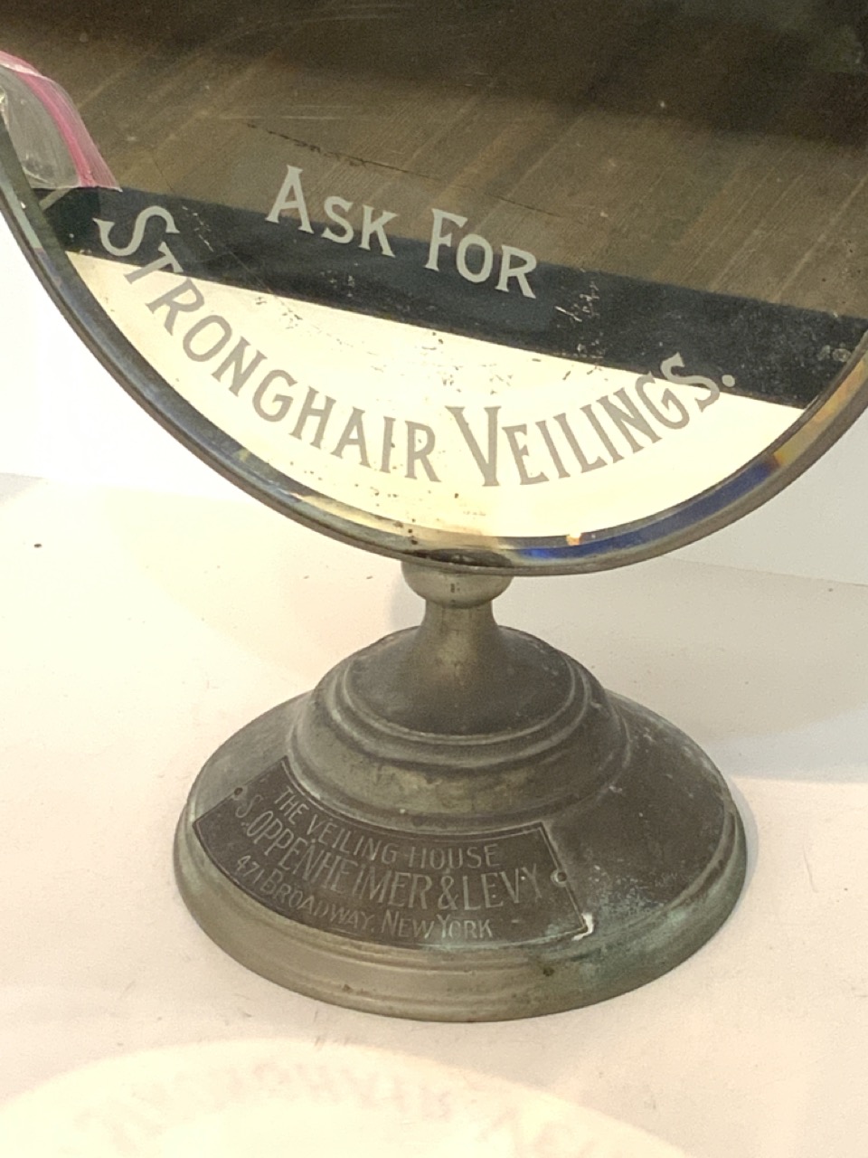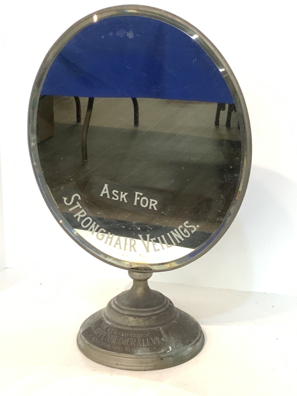 Early countertop advertising mirror. "Ask For Stronghair Veiling" The Veiling House S. Openheimer & Levy at 71 Broadway, New York.
