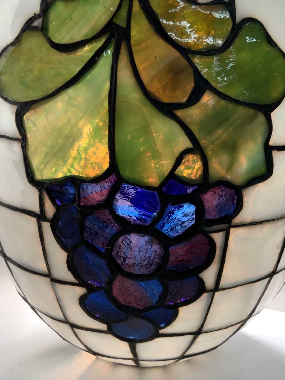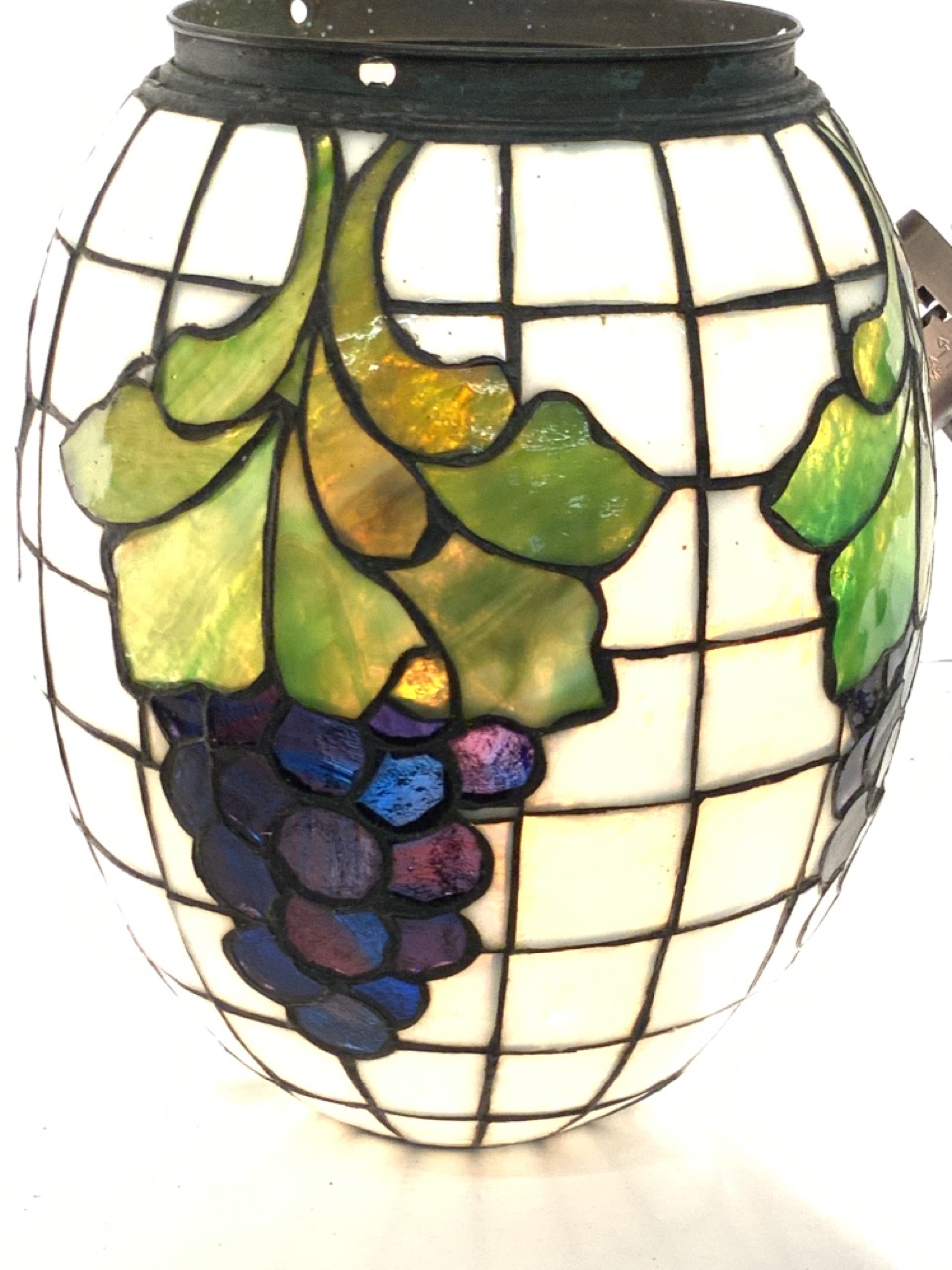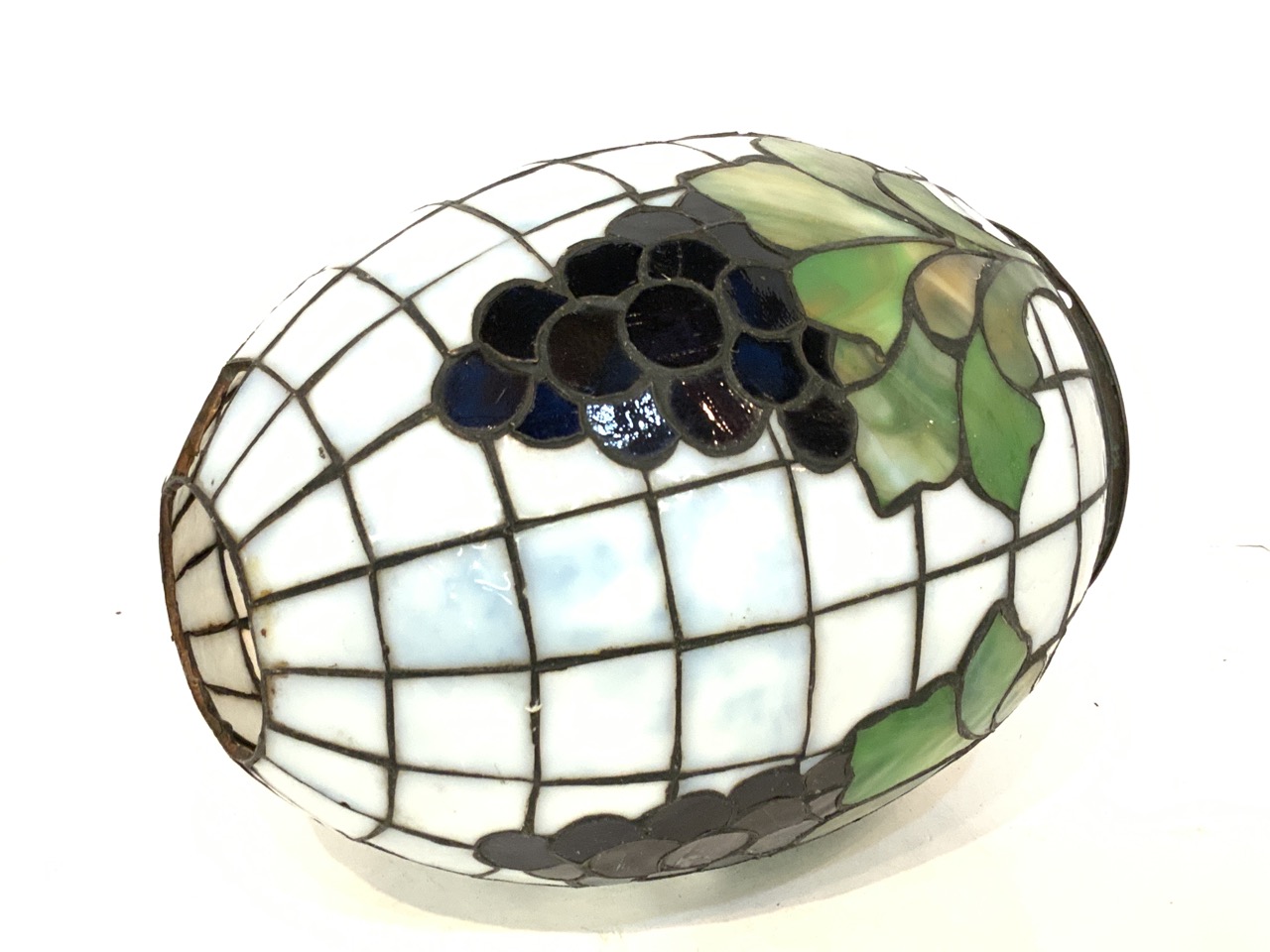 Early 20th c. leaded glass grape cluster hall fixture lamp shade. Rich purple and green color. Unsigned. One piece of glass missing. As seen in photograph preview.