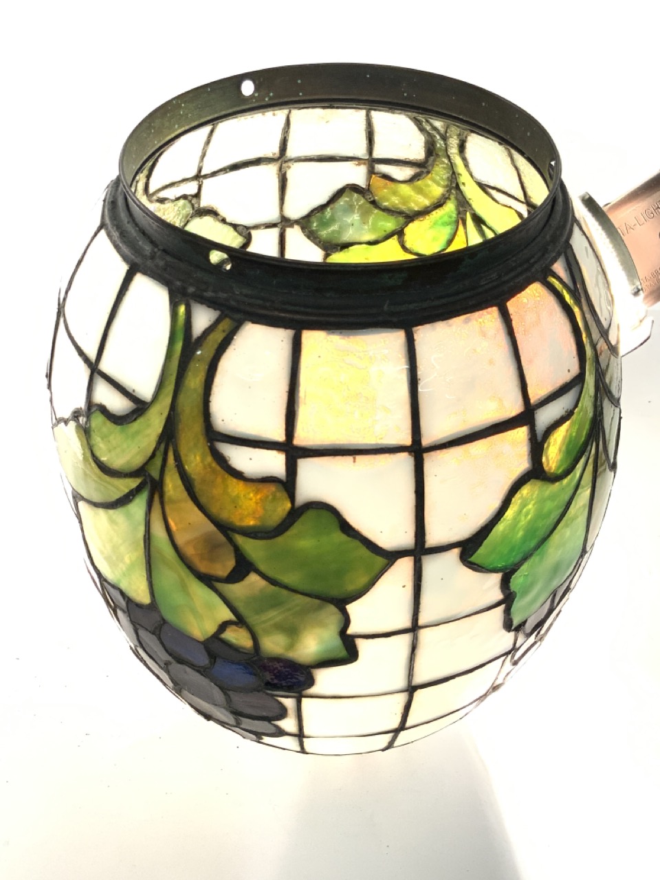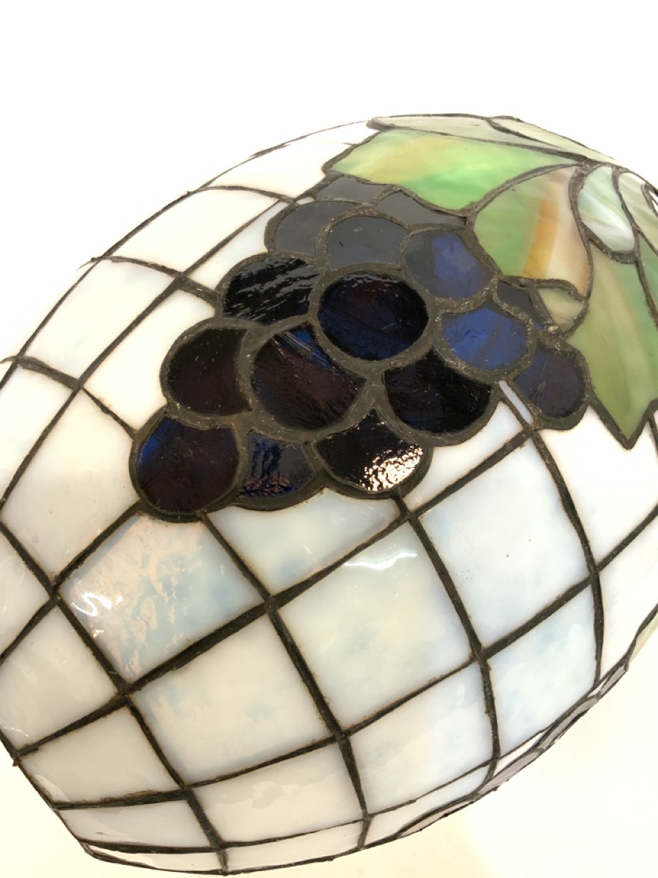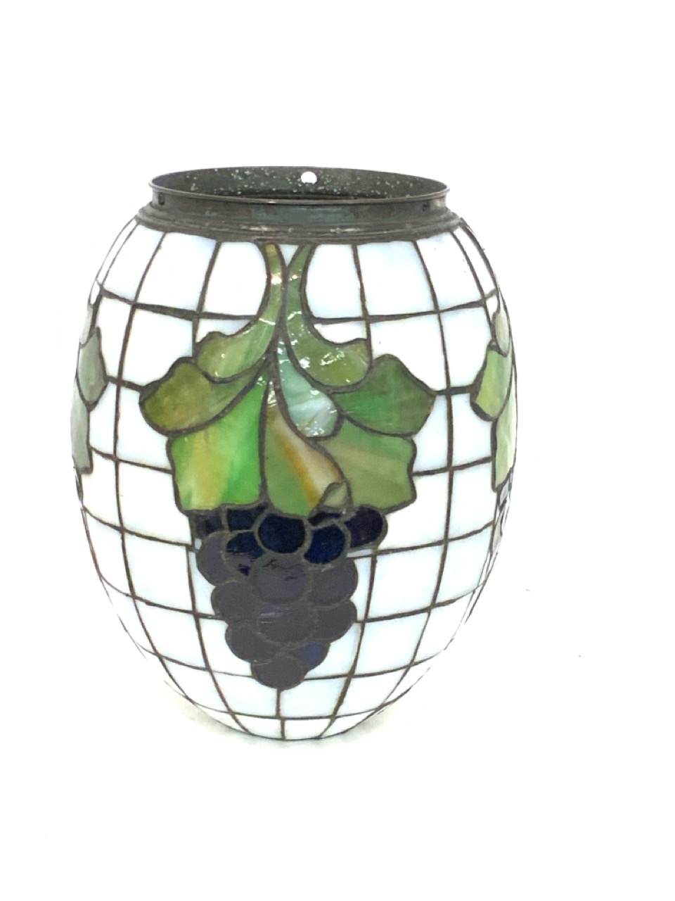 Early 20th c. leaded glass grape cluster hall fixture lamp shade. Rich purple and green color. Unsigned. One piece of glass missing. As seen in photograph preview.
