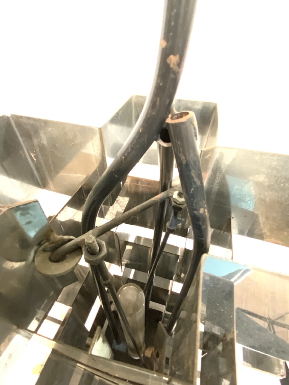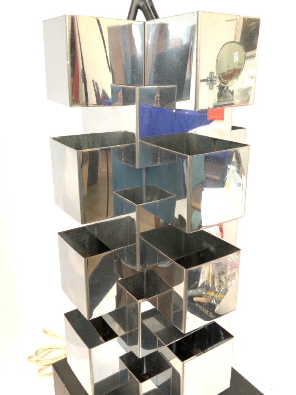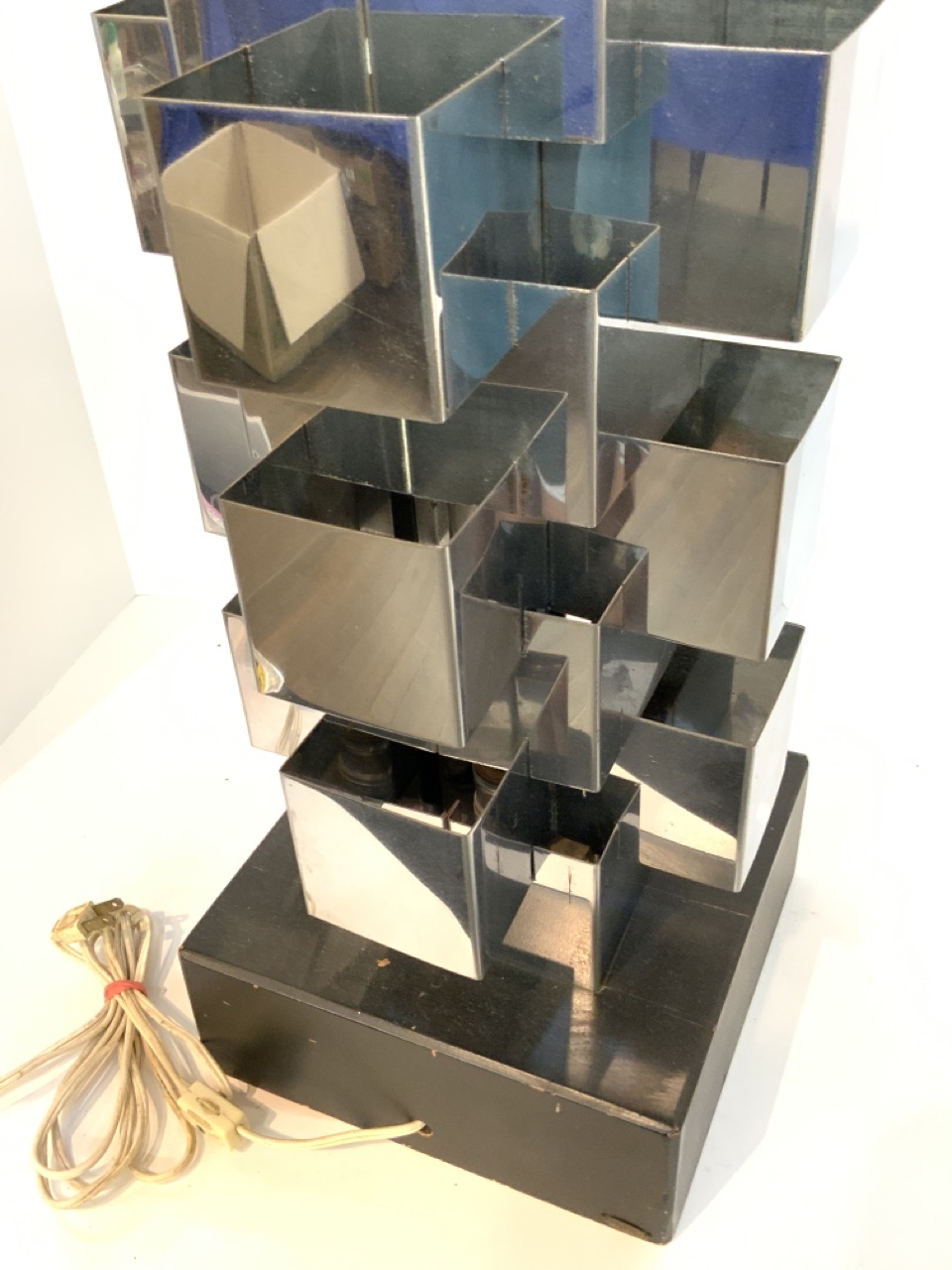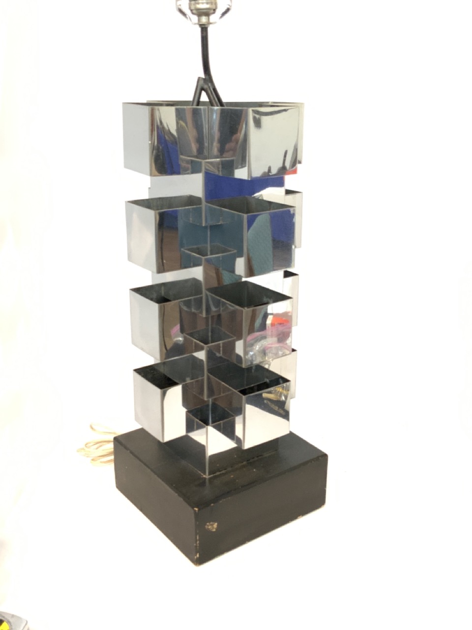 Curis Jere signed table lamp. Dated 1972. Mounted on wood base. Small scuff to wood base. Repaint and sand needed. Chrome finish overall good with some light scratching/use. Please see photograph preview or call.