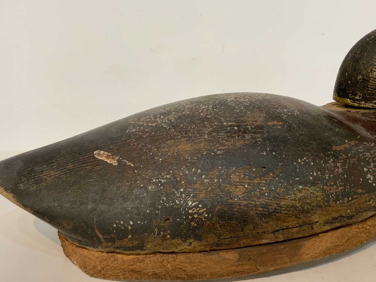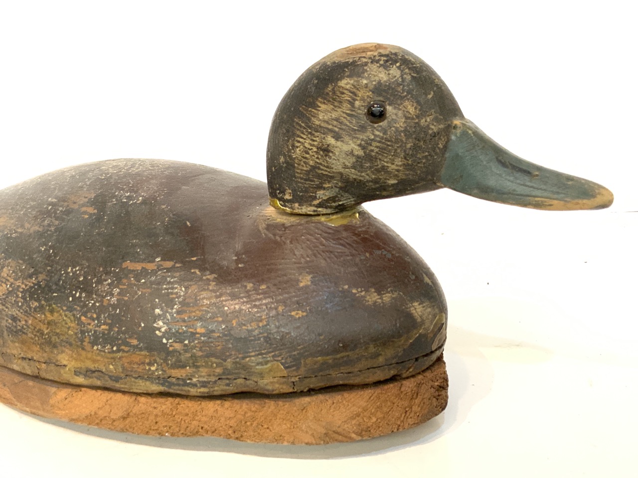 Early hand carved duck decoy with pine wood base.