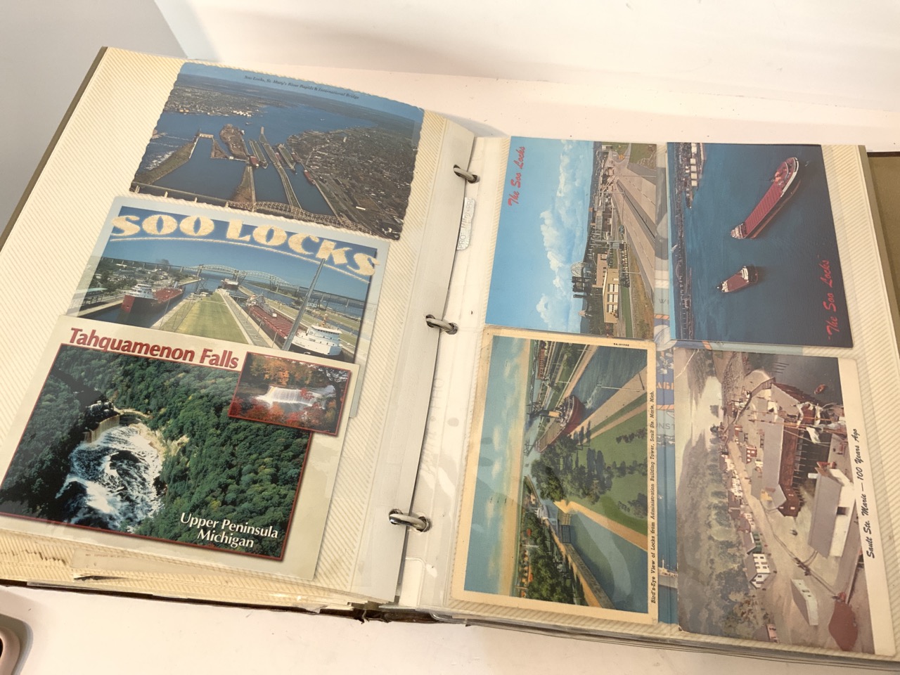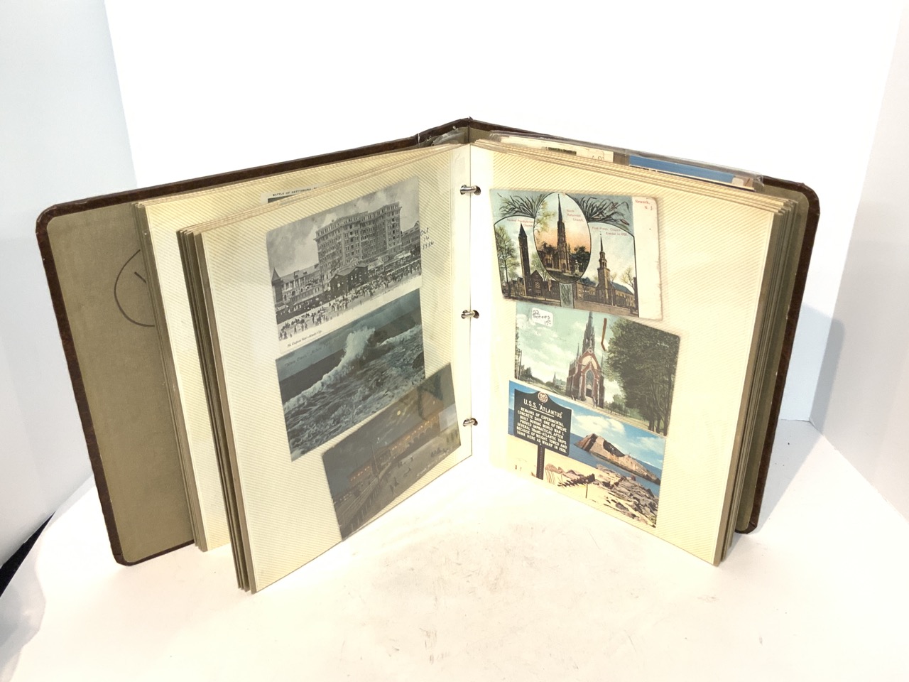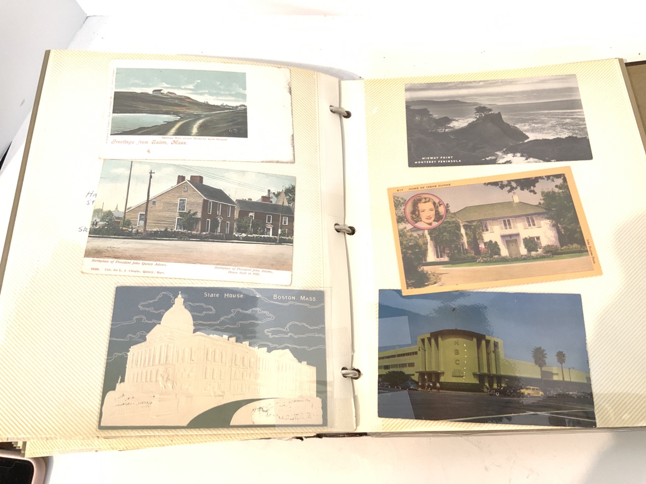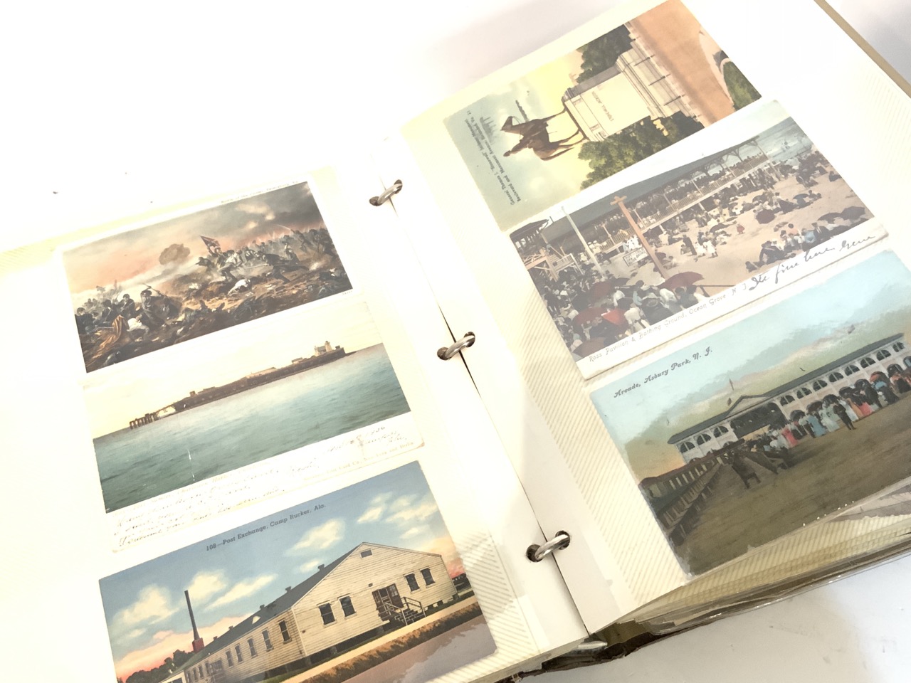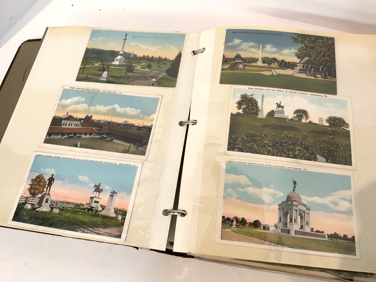 A compiled album of postcards including States. Pennsylvania, New Jersey, Washington D.C., Massachusetts, California, Michigan and Military Related Cards. Approx. 160 Pieces.